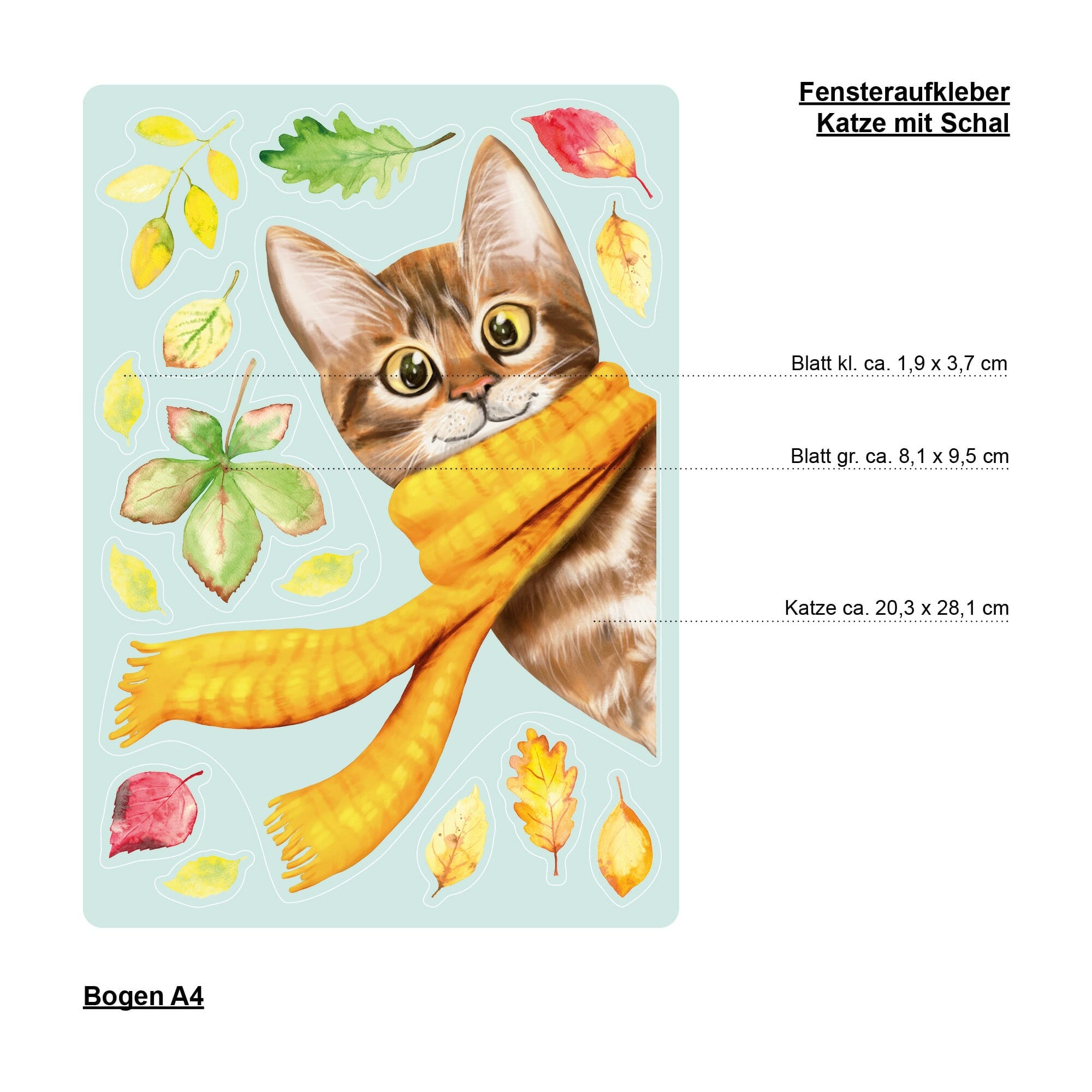 Fensterbild Herbst reinschauende Katze Schal bunte Blätter herbstlicher Fensteraufkleber Fensterdeko