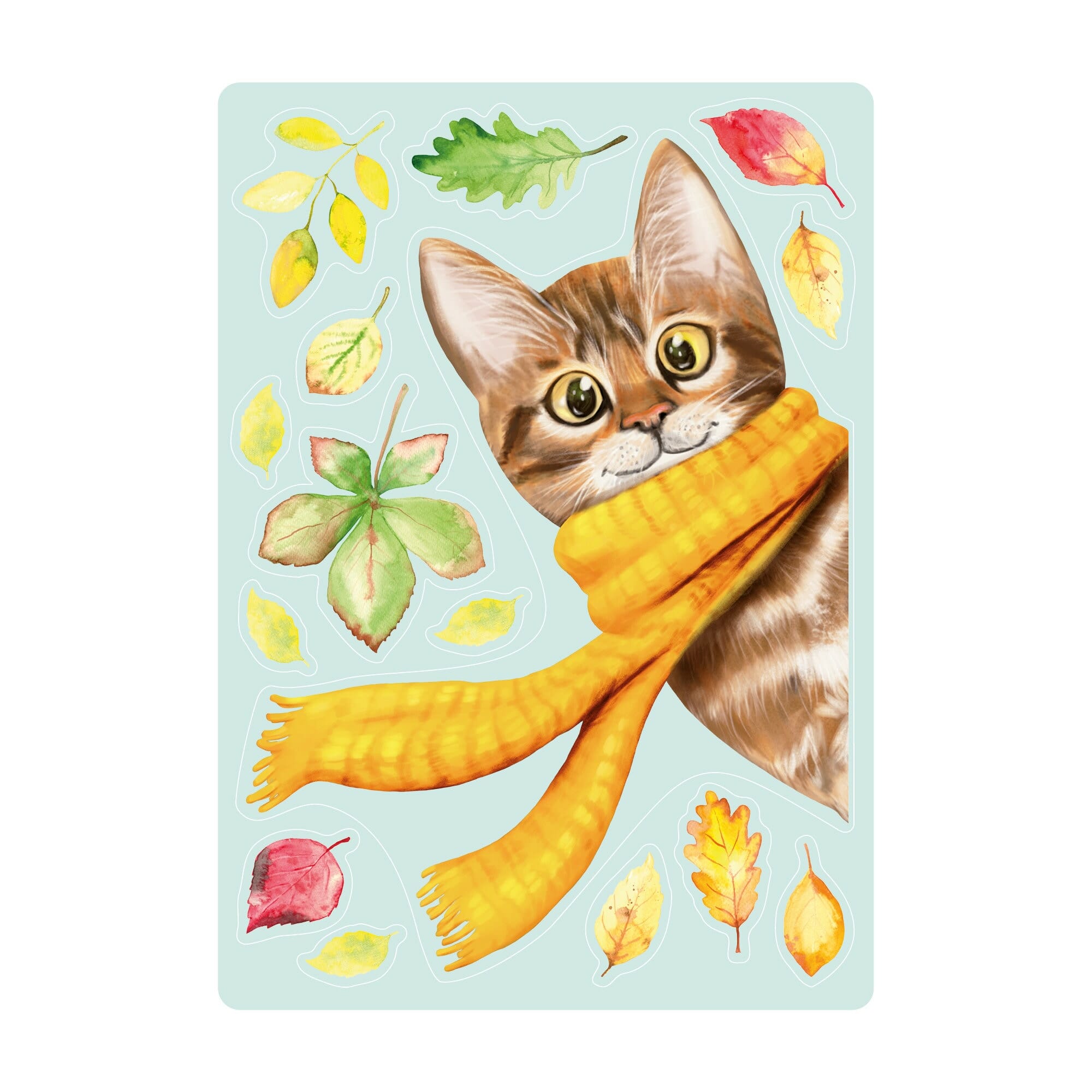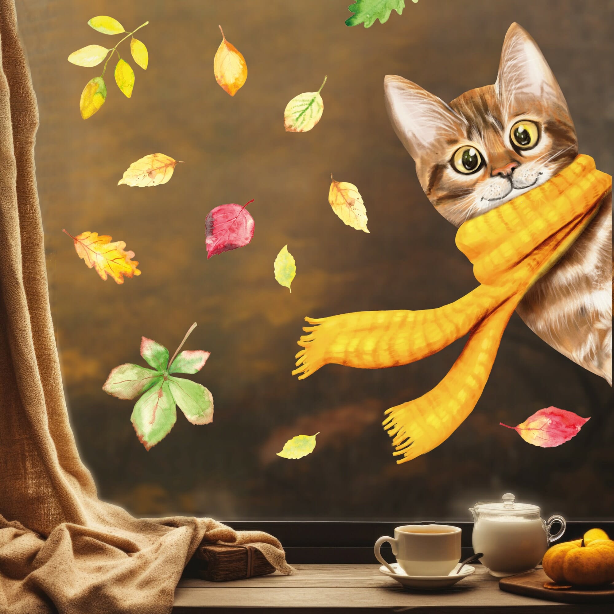 Bringe herbstliche Stimmung in Dein Zuhause mit diesem zauberhaften Fensterbild! Die niedliche, hereinschauende Katze mit ihrem gelben Schal und die bunten Herbstblätter zaubern ein Lächeln auf jedes Gesicht. Perfekt für das Kinderzimmer, Wohnzimmer, die Küche oder den Flur.