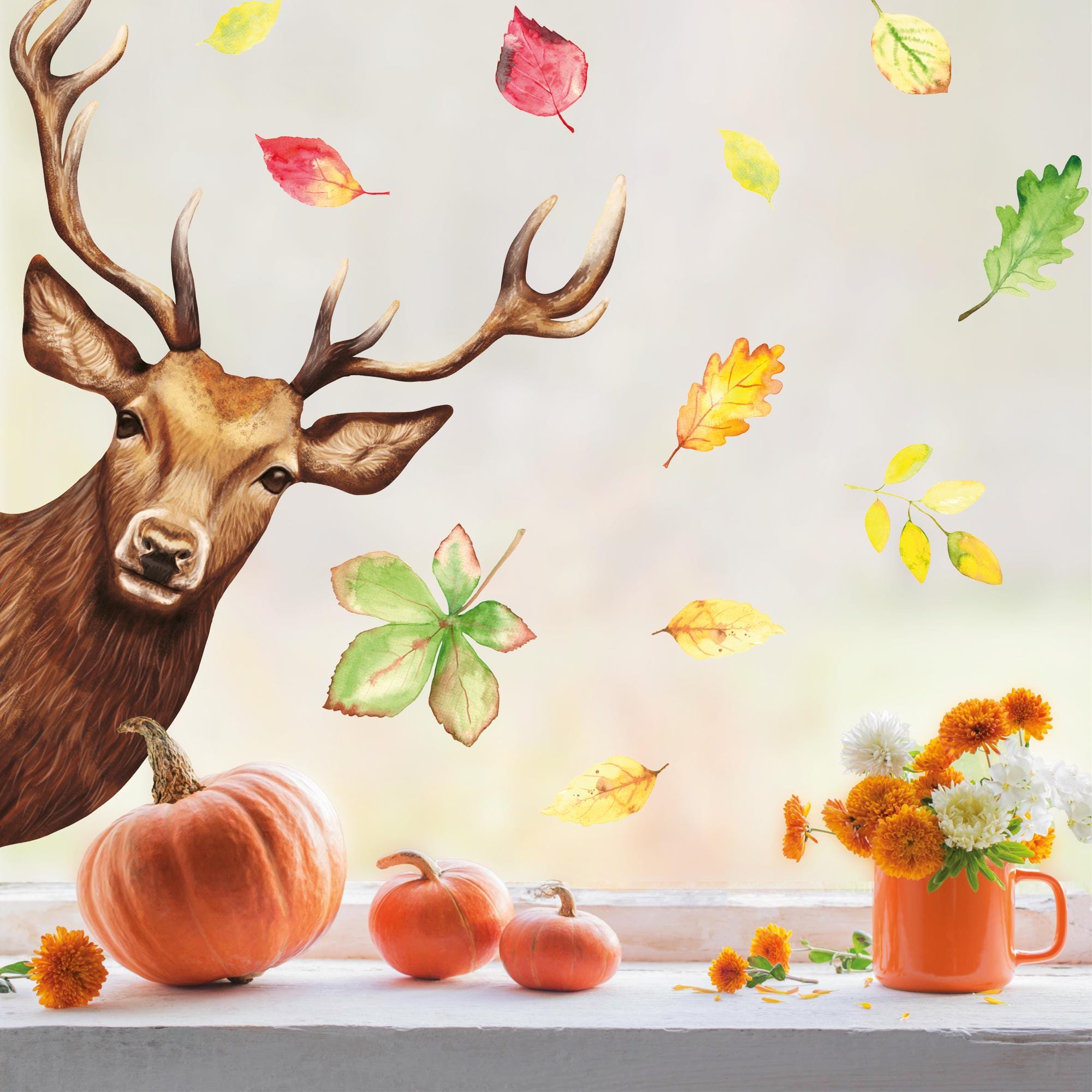 Fensterbild reinschauender Hirsch Rotwild Wild bunte Blätter Herbst herbstlicher Fensteraufkleber Fensterdeko Herbstdeko