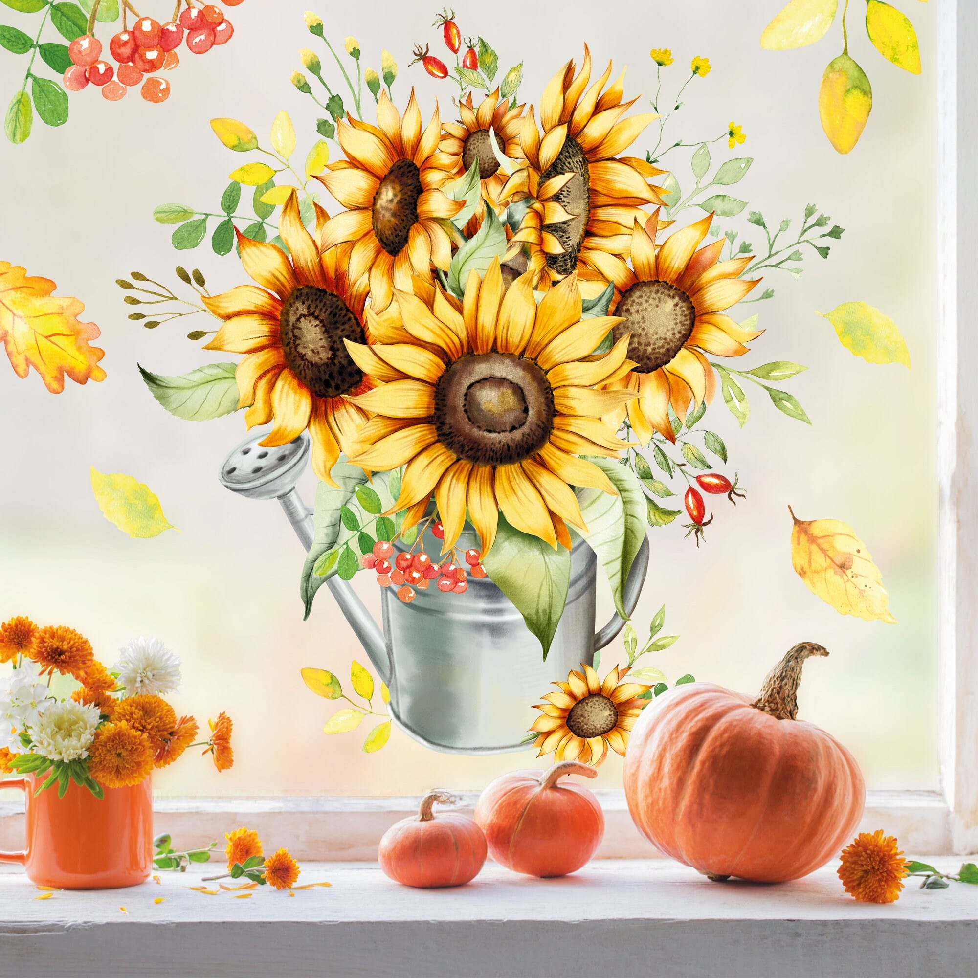 Fensterbild Sonnenblumen Gießkanne Herbst Herbstfrüchte Herbstblätter bunt wiederverwendbare Fensteraufkleber Kinderzimmer Baby Kind