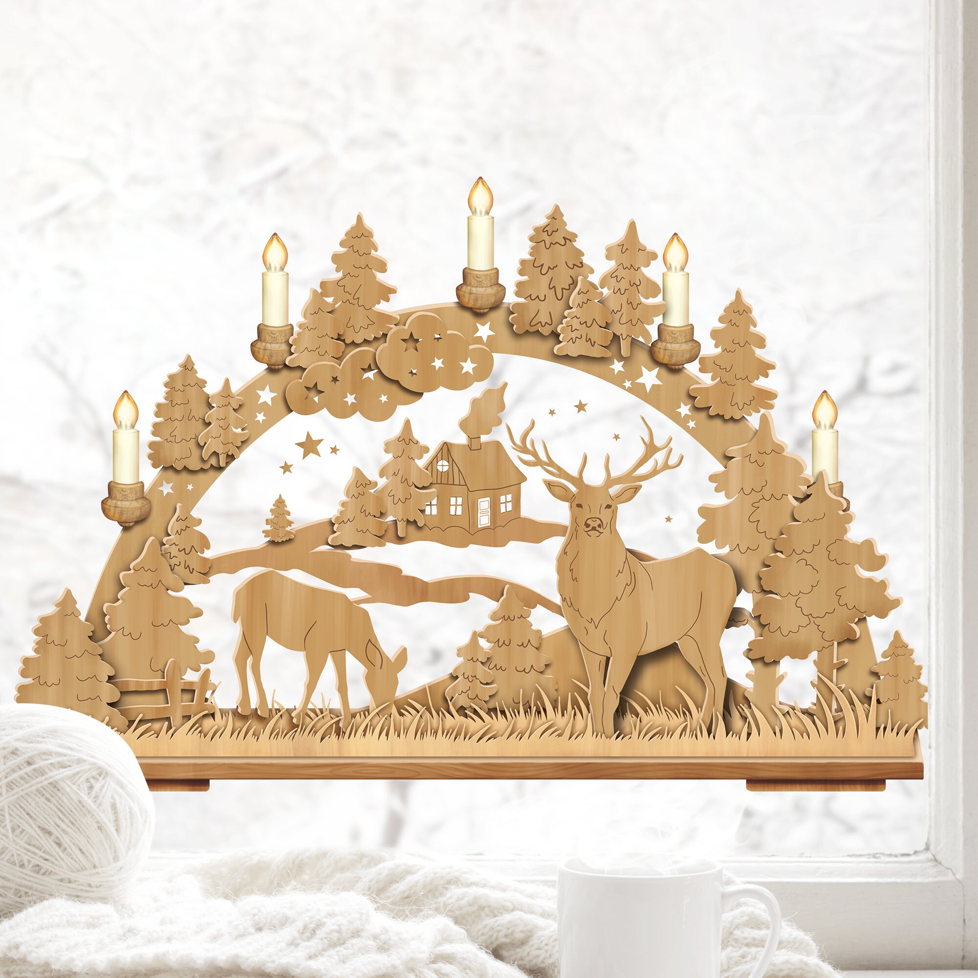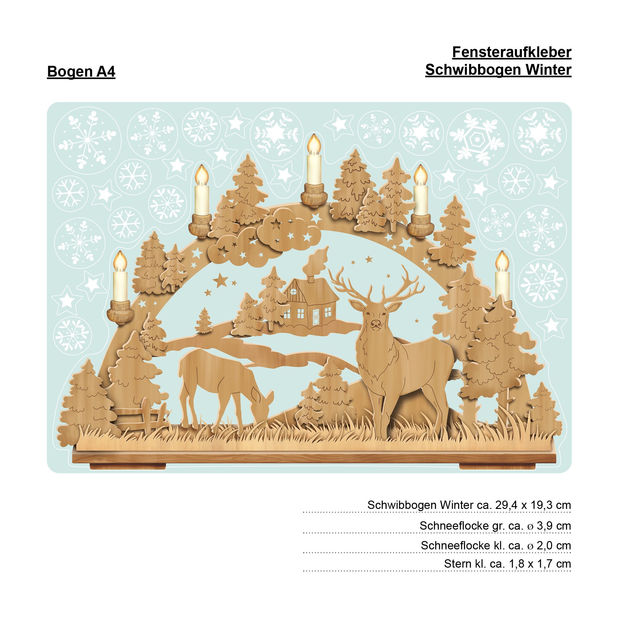 Fensterbild Weihnachten Motiv Schwibbogen in Holzoptik mit Rentieren Hirschen Winterhäuschen Fensteraufkleber wiederverwendbar