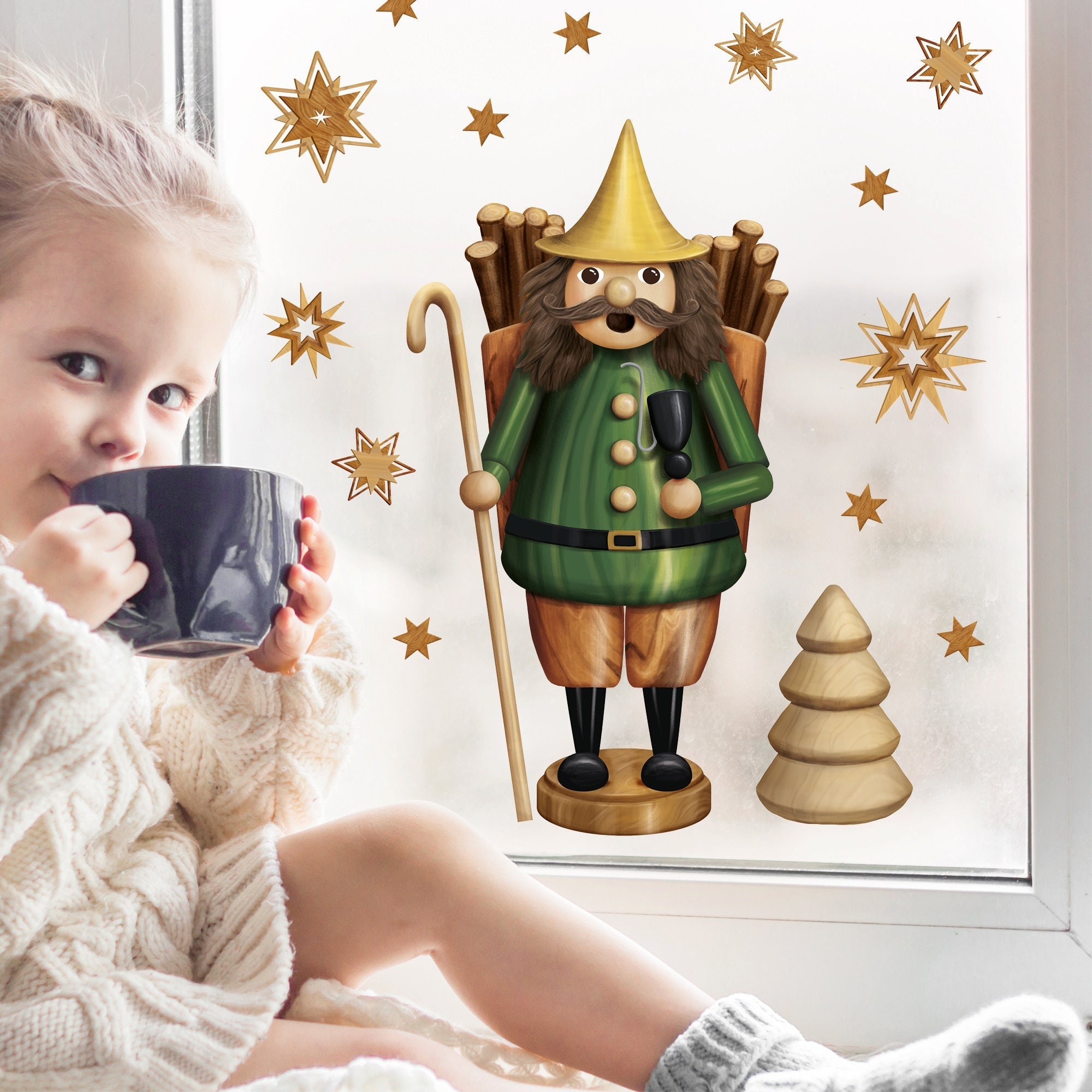Fensterbild Weihnachten Räuchermännchen mit Strohsternen, Kinderzimmer Fenster, Weihnachtsdeko