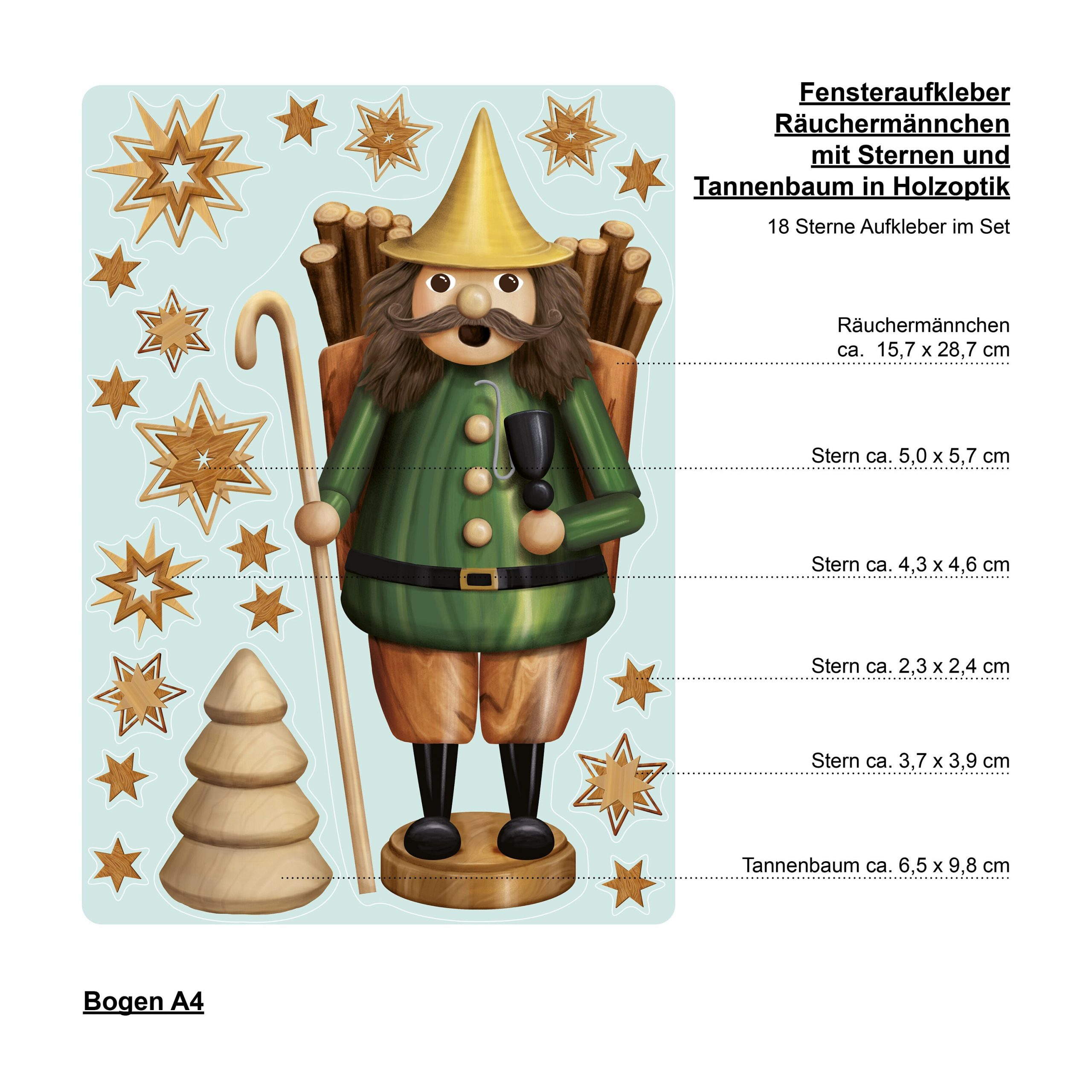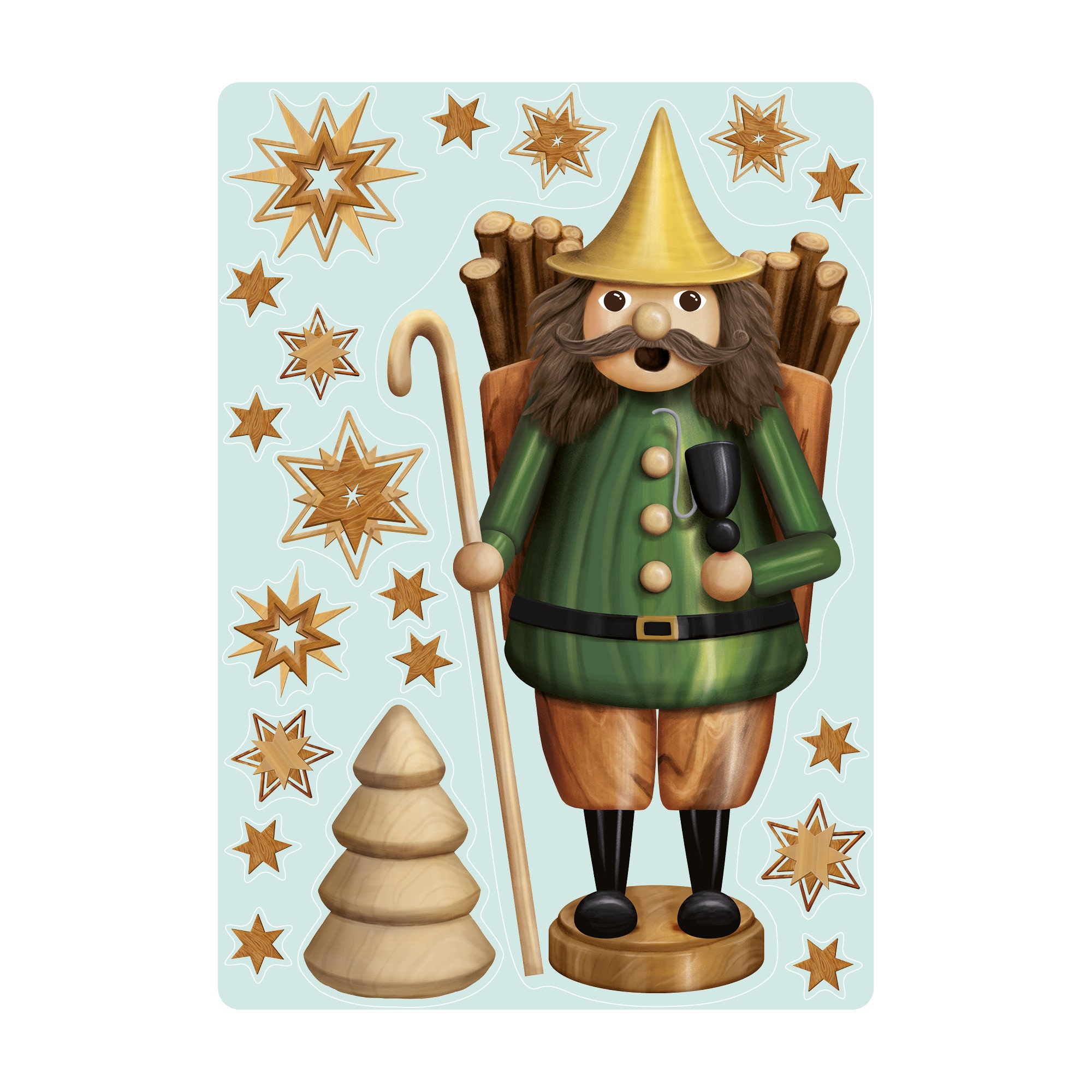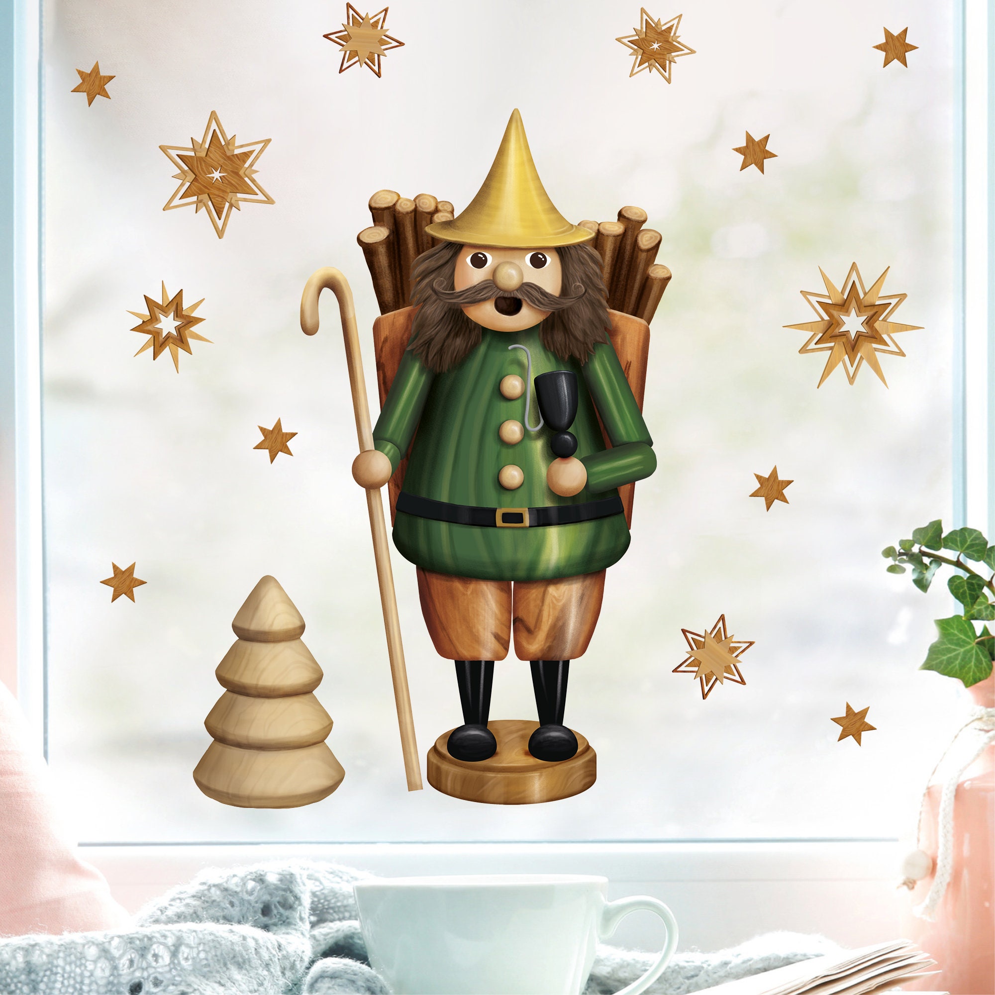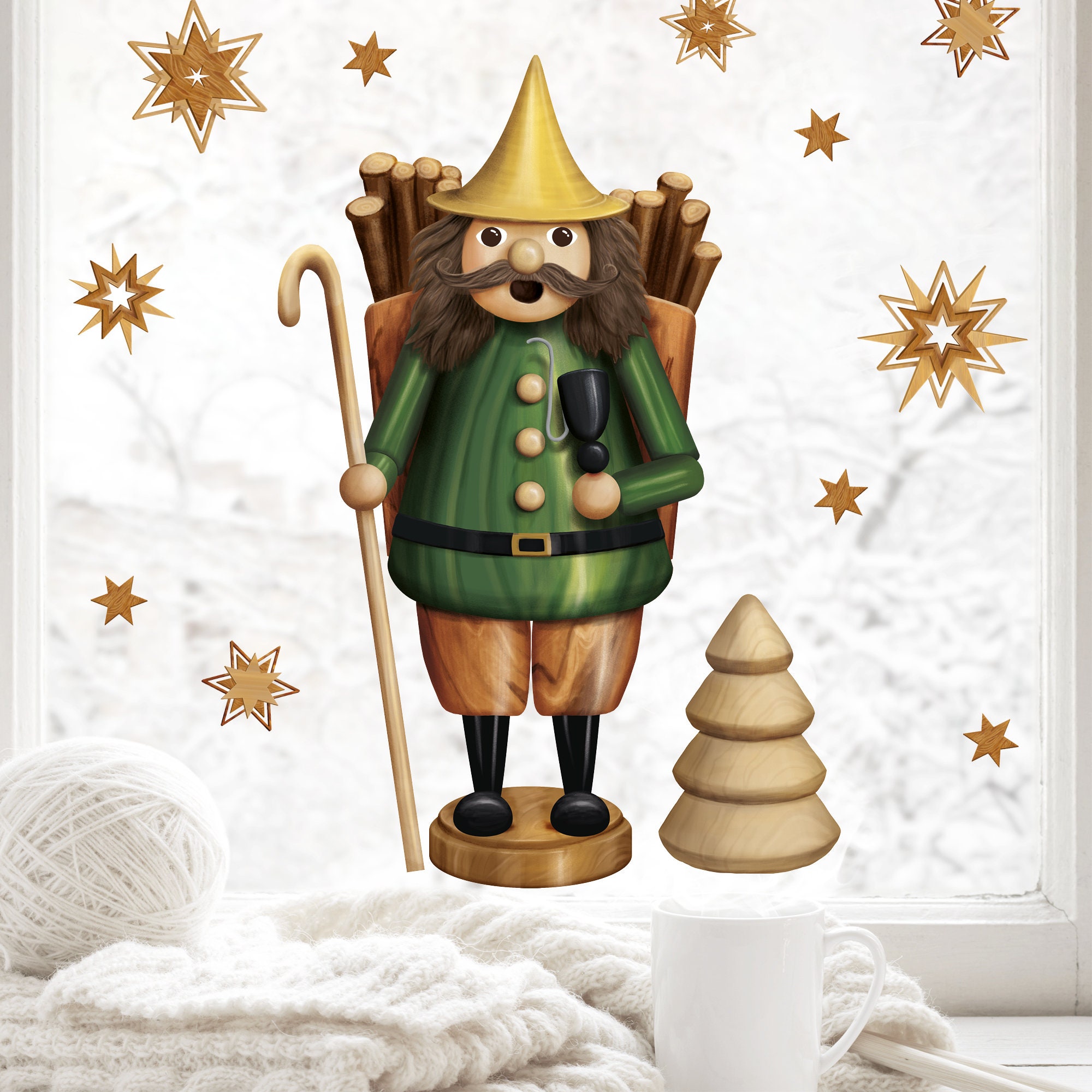 Dieser wiederverwendbare Fensteraufkleber zeigt ein hölzernes Räuchermännchen. Die Strohsterne kannst Du nach Belieben einzeln verkleben. Ideal für eine einzigartige Winterdekoration. Einfach den statisch haftenden Sticker (selbstklebend, ohne Kleber) von der Trägerfolie abziehen und aufkleben – schon darfst Du Dich über ein wirkungsvolles Fensterbild im Wohnzimmer, Babyzimmer, Kinderzimmer, Wintergarten, Badezimmer, in der Küche oder im Flur freuen. Auch als Geburtstagsgeschenk, Nikolausgeschenk oder Weihnachtsgeschenk ist dieses Sticker-Set sehr zu empfehlen.
