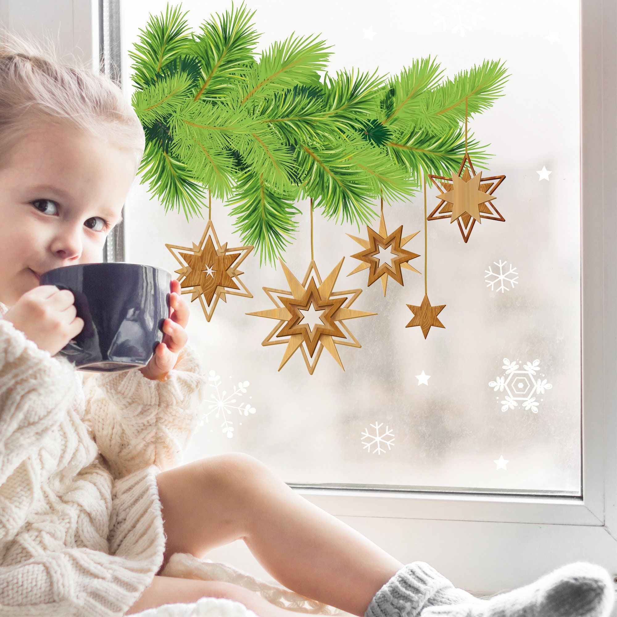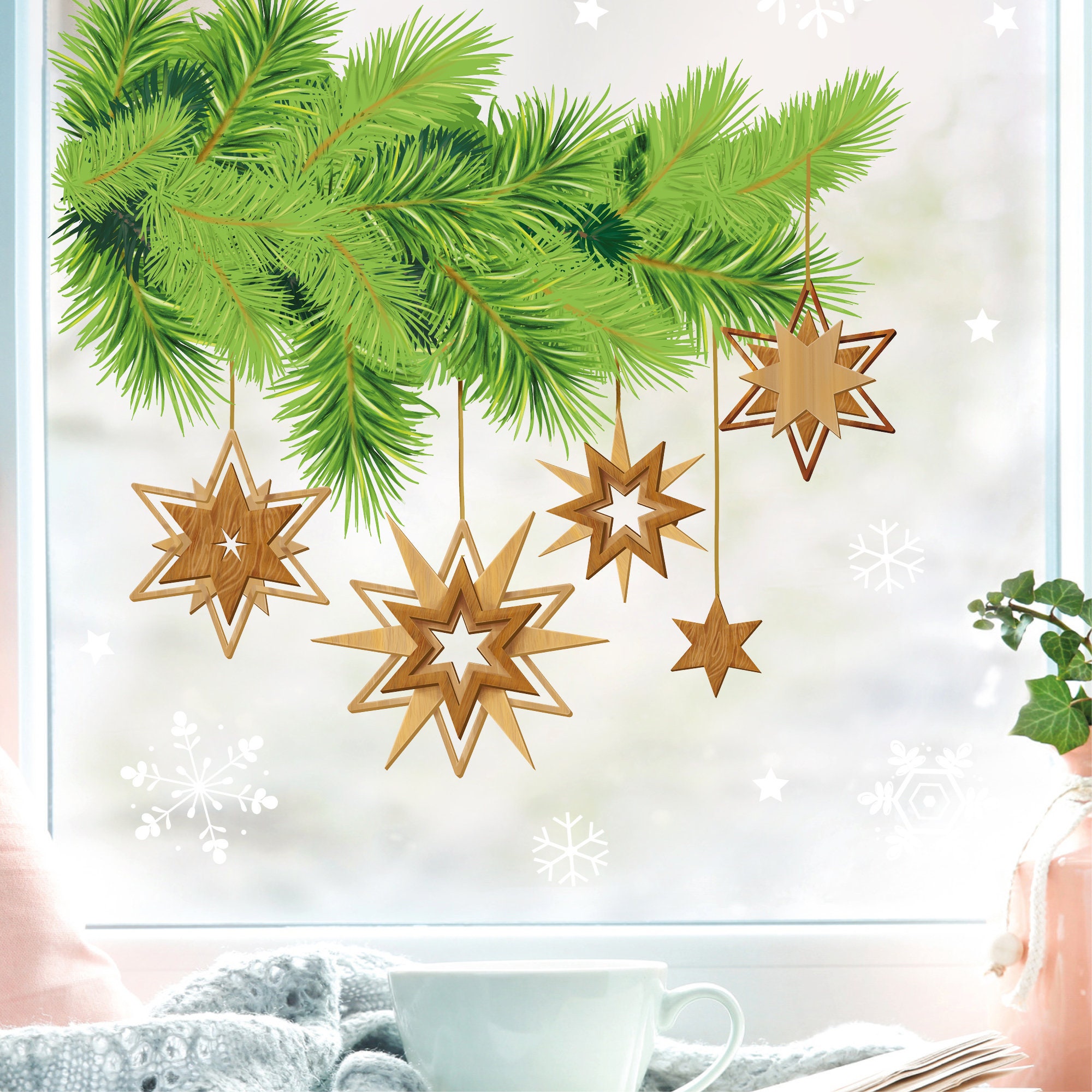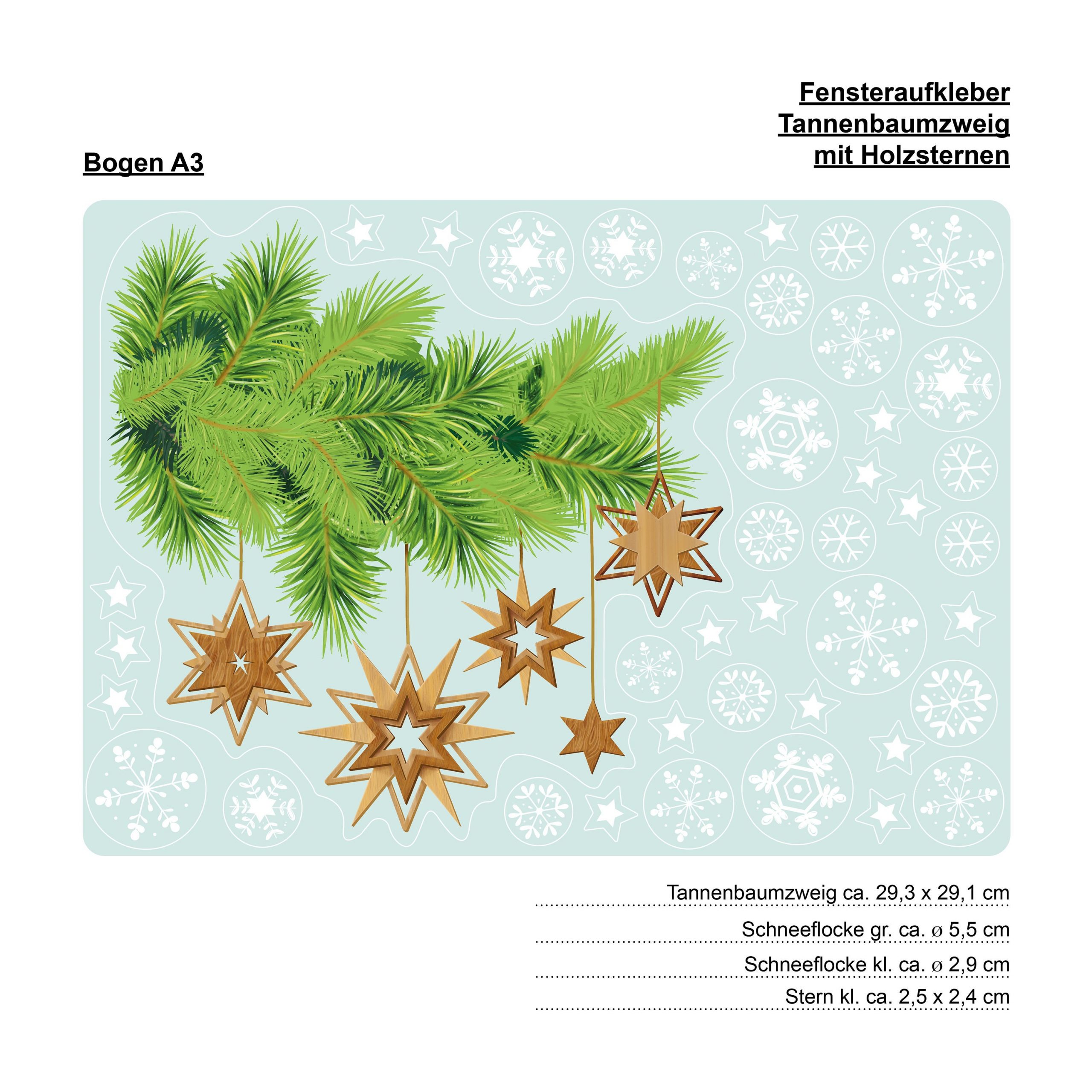 Fensterbild Weihnachten Tannenzweige mit Sterne in Holzoptik und Schneeflocken, Fensteraufkleber, Weihnachtsdekoration