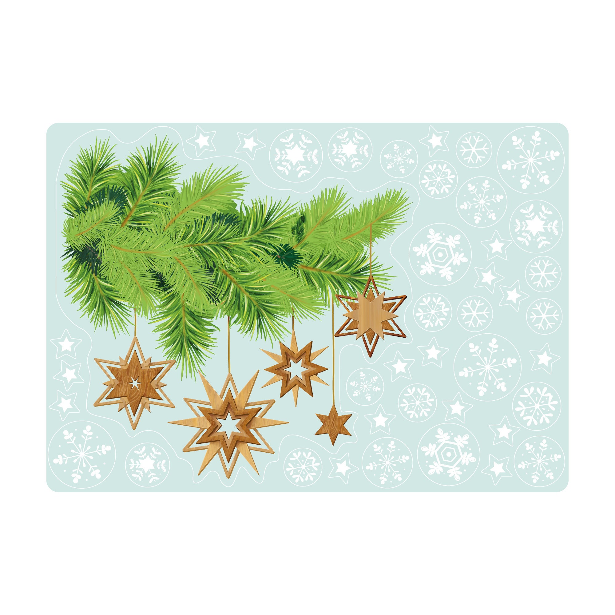 Fensterbild Weihnachten Tannenzweige mit Sternen in Holzoptik und weißen Schneeflocken, Fensteraufkleber, Weihnachtsdekoration