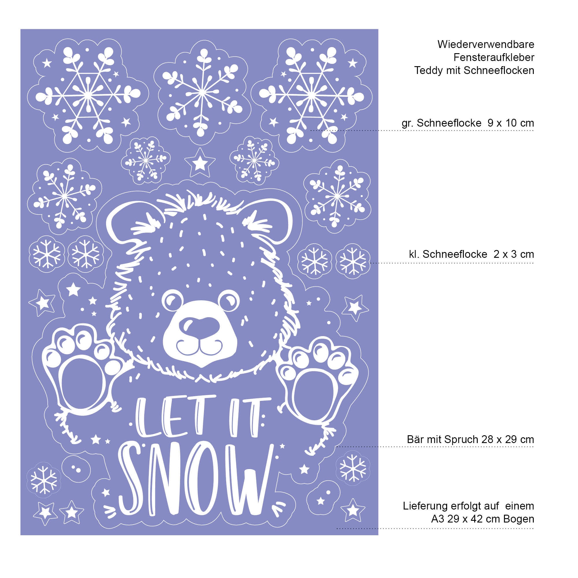 Fensterbild Weihnachten Weihnachtsbär Fensteraufkleber Schneeflocken WIEDERVERWENDBAR, Winterdekoration