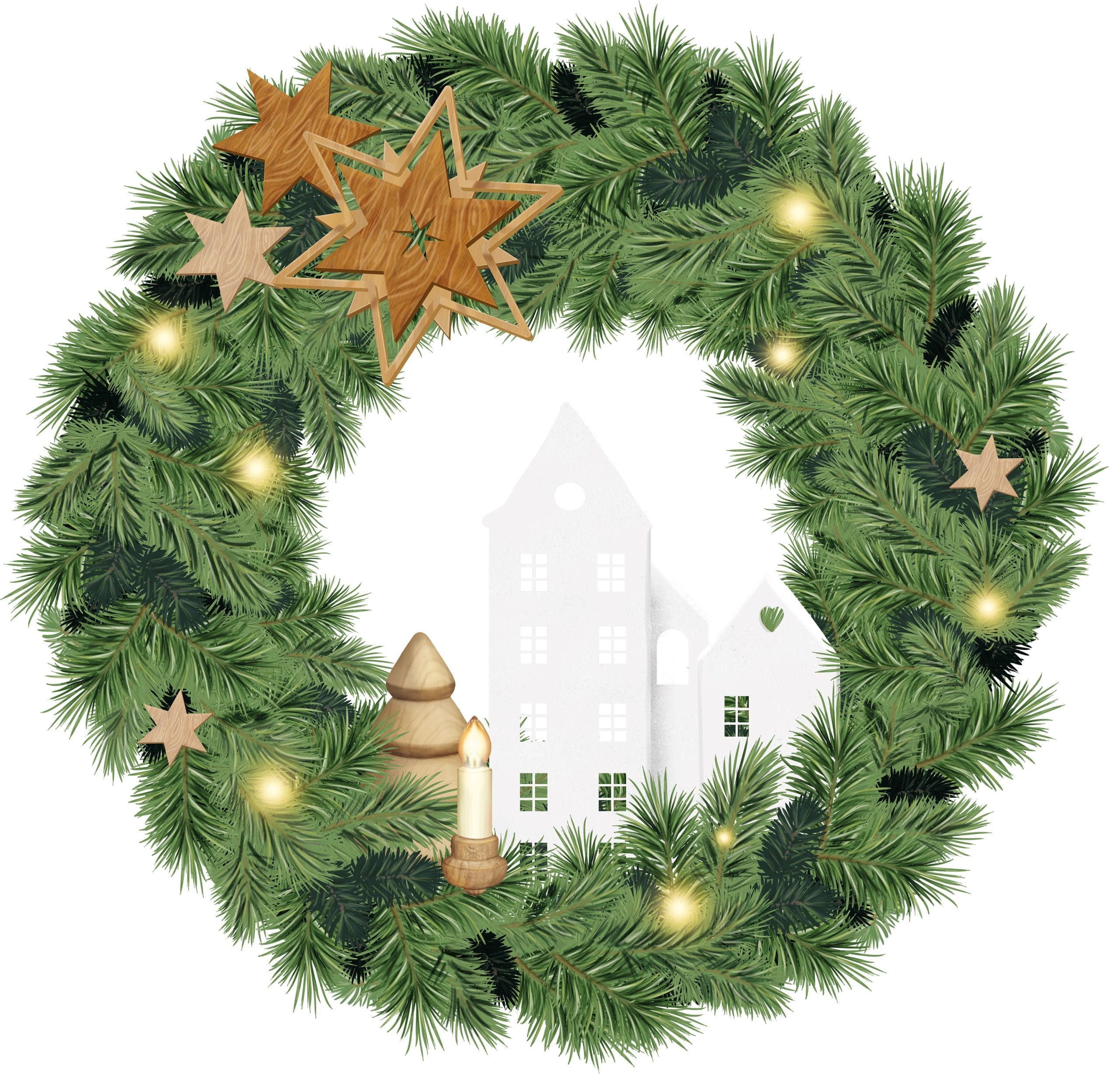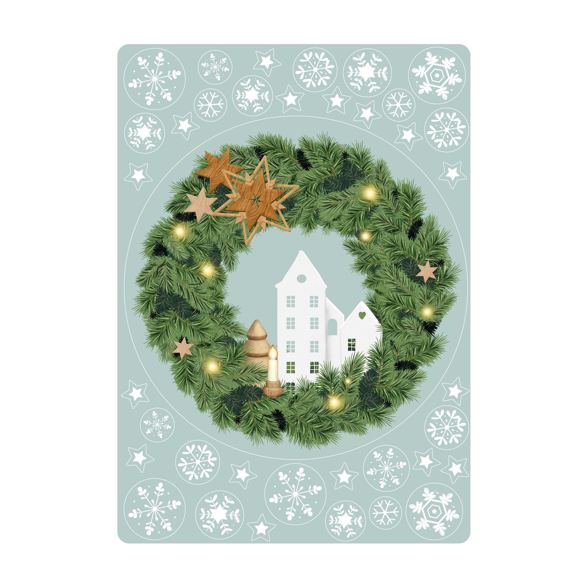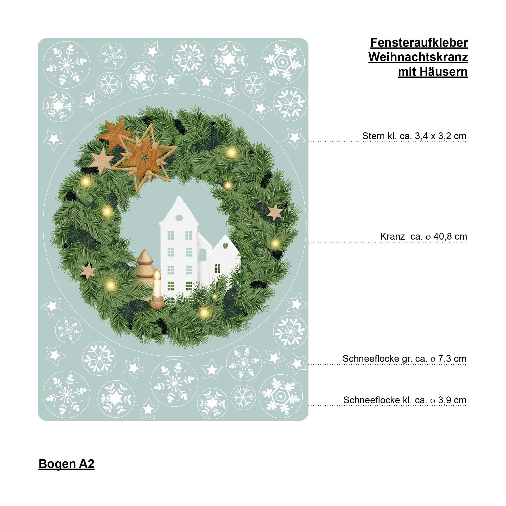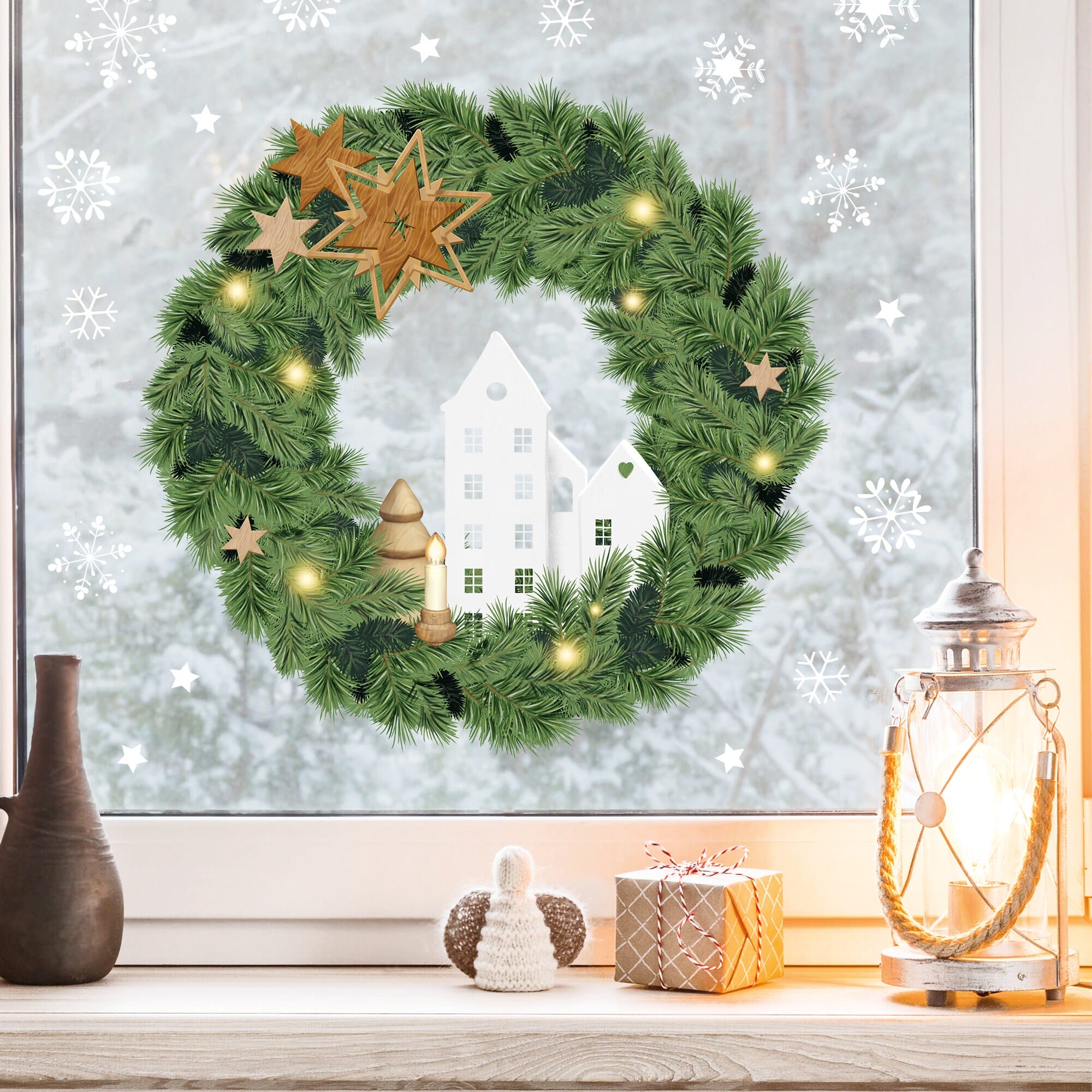 Fensterbild Weihnachten Weihnachtskranz Deko Winter Schneeflocken Stern Holzoptik Häuser Fensteraufkleber Fensterdeko