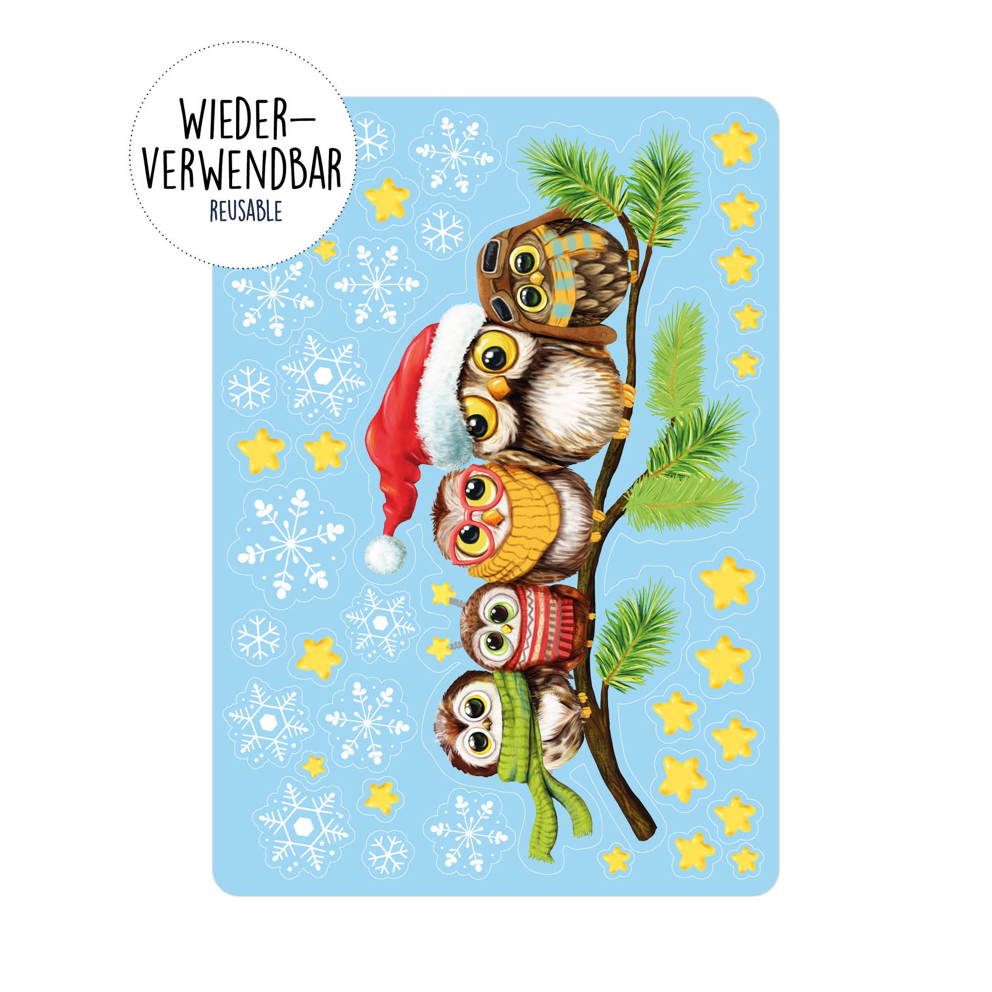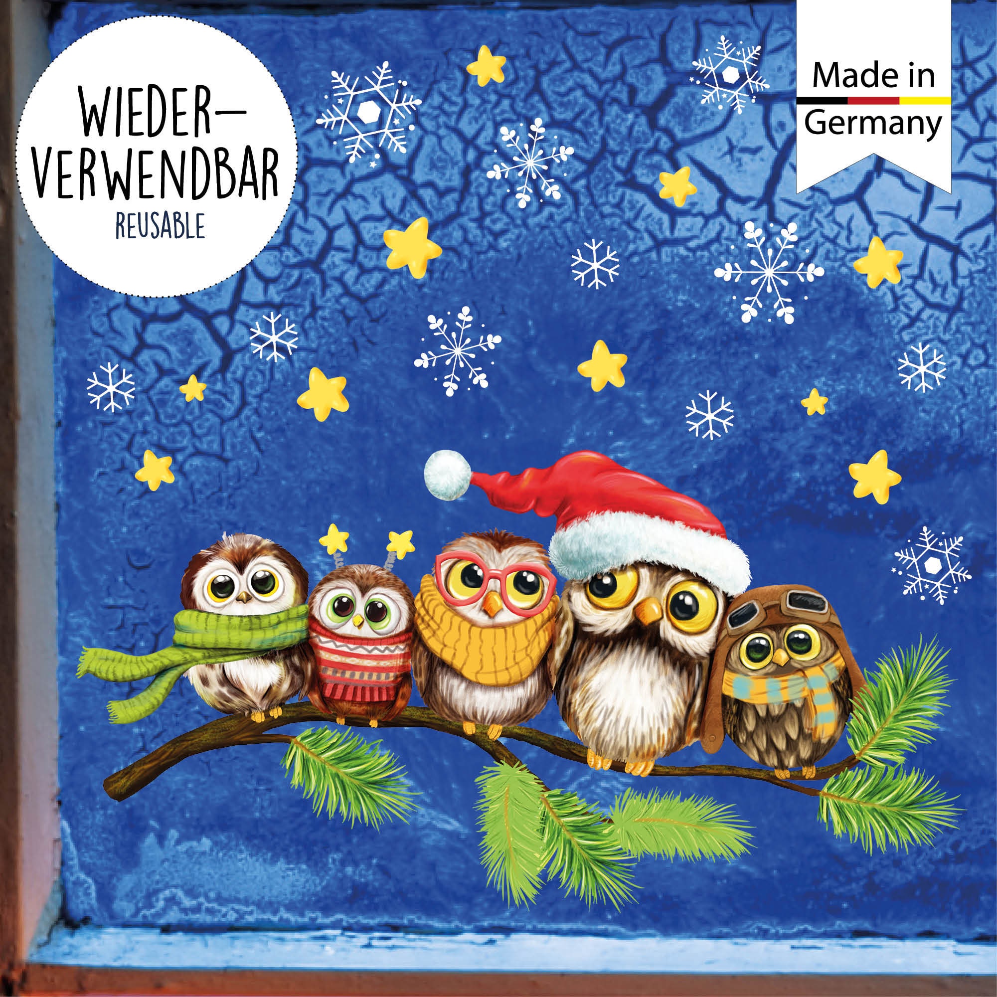 Fensterbild Weihnachten Winter 5 Eulen auf Ast Schneeflocken Fensteraufkleber Weihnachtsdeko wiederverwendbar