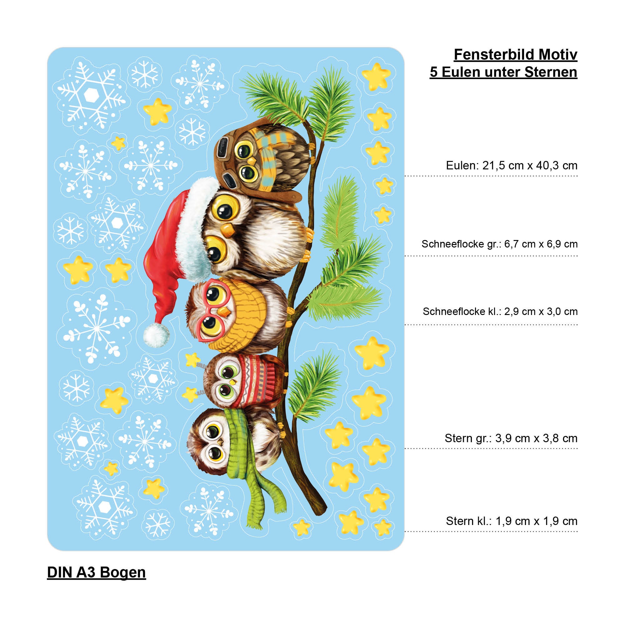 Fensterbild Weihnachten Winter 5 Eulen auf Ast Schneeflocken