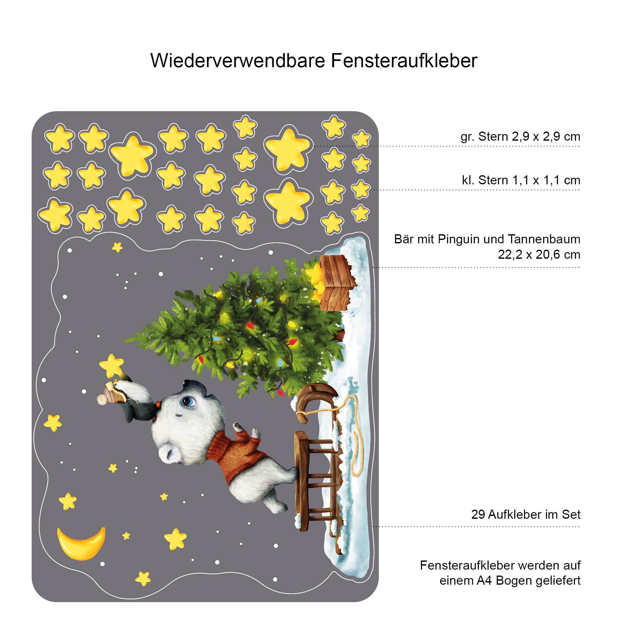 Wiederverwendbares Fensterbild Weihnachten Winter Bär und Pinguin mit Sternen Fensteraufkleber winterliche Fensterdeko, 29 Aufkleber im Set