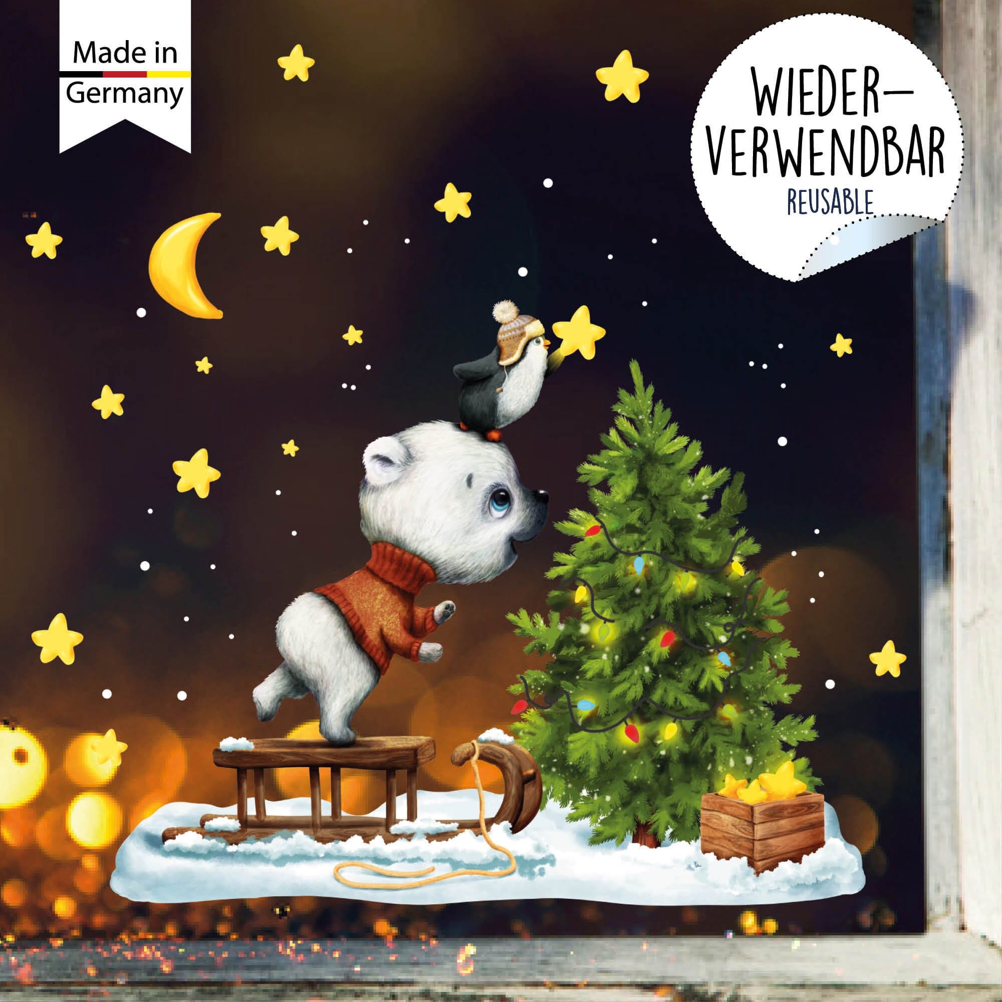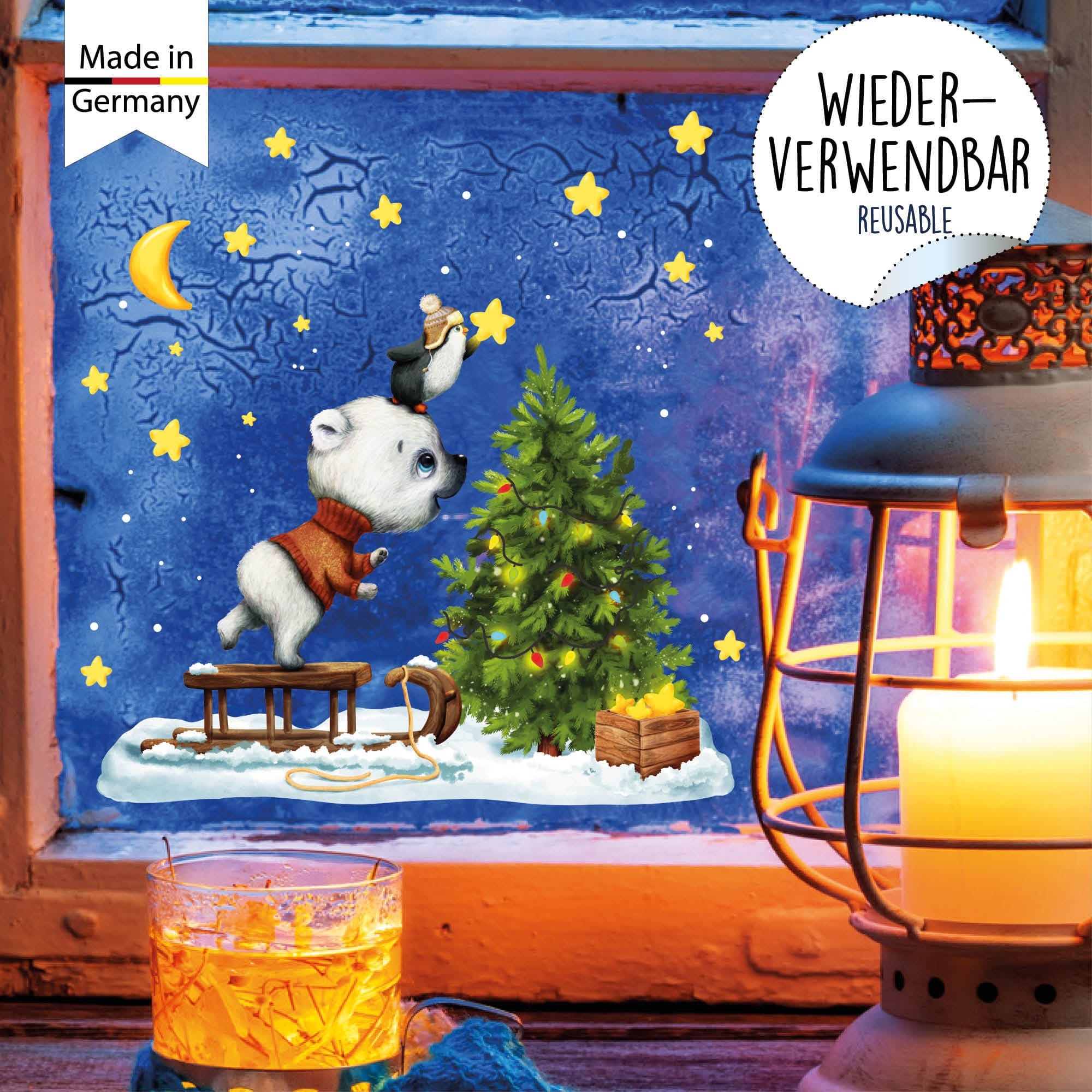 Fensterbild Weihnachten Winter Bär und Pinguin mit Sternen Fensteraufkleber Fensterdeko wiederverwendbar