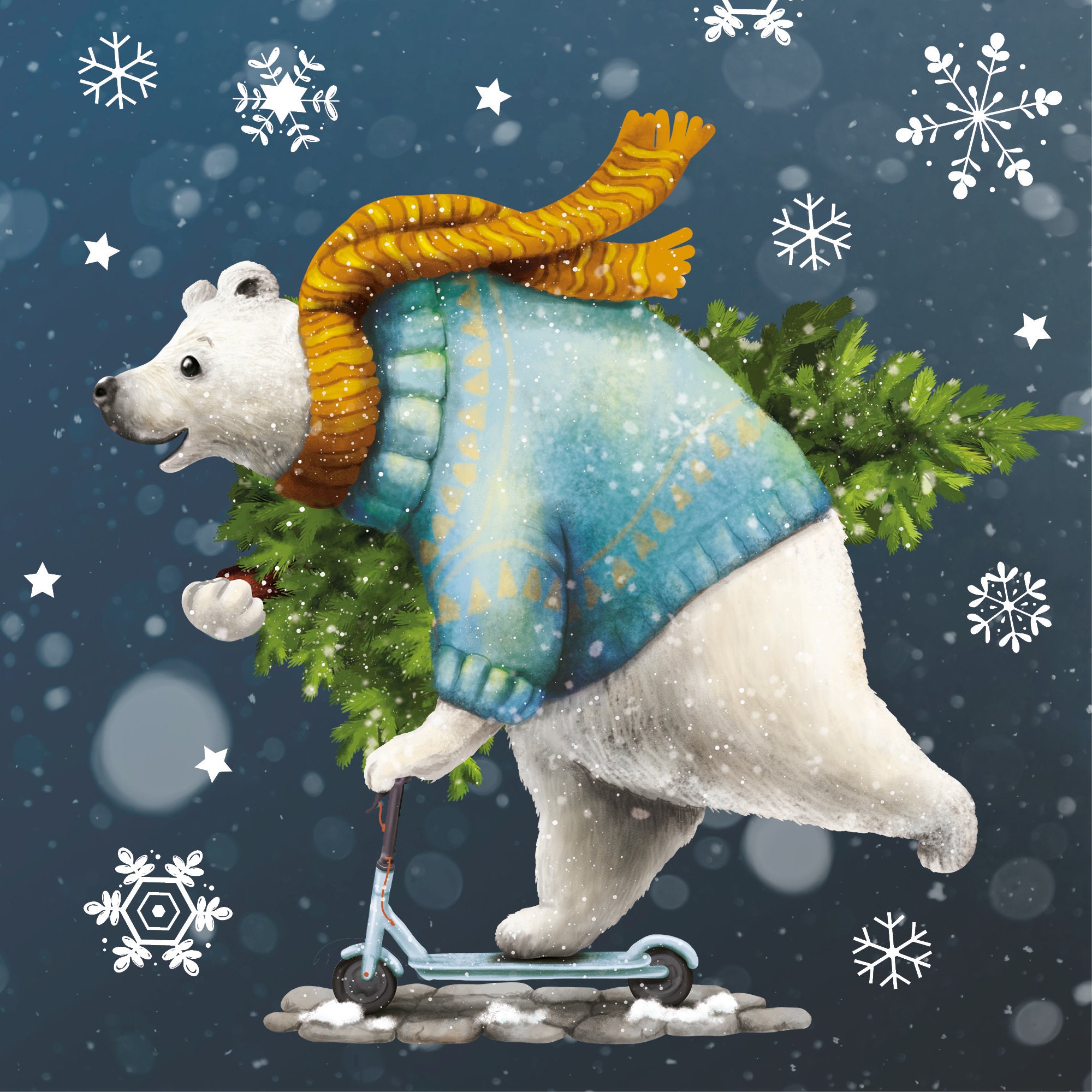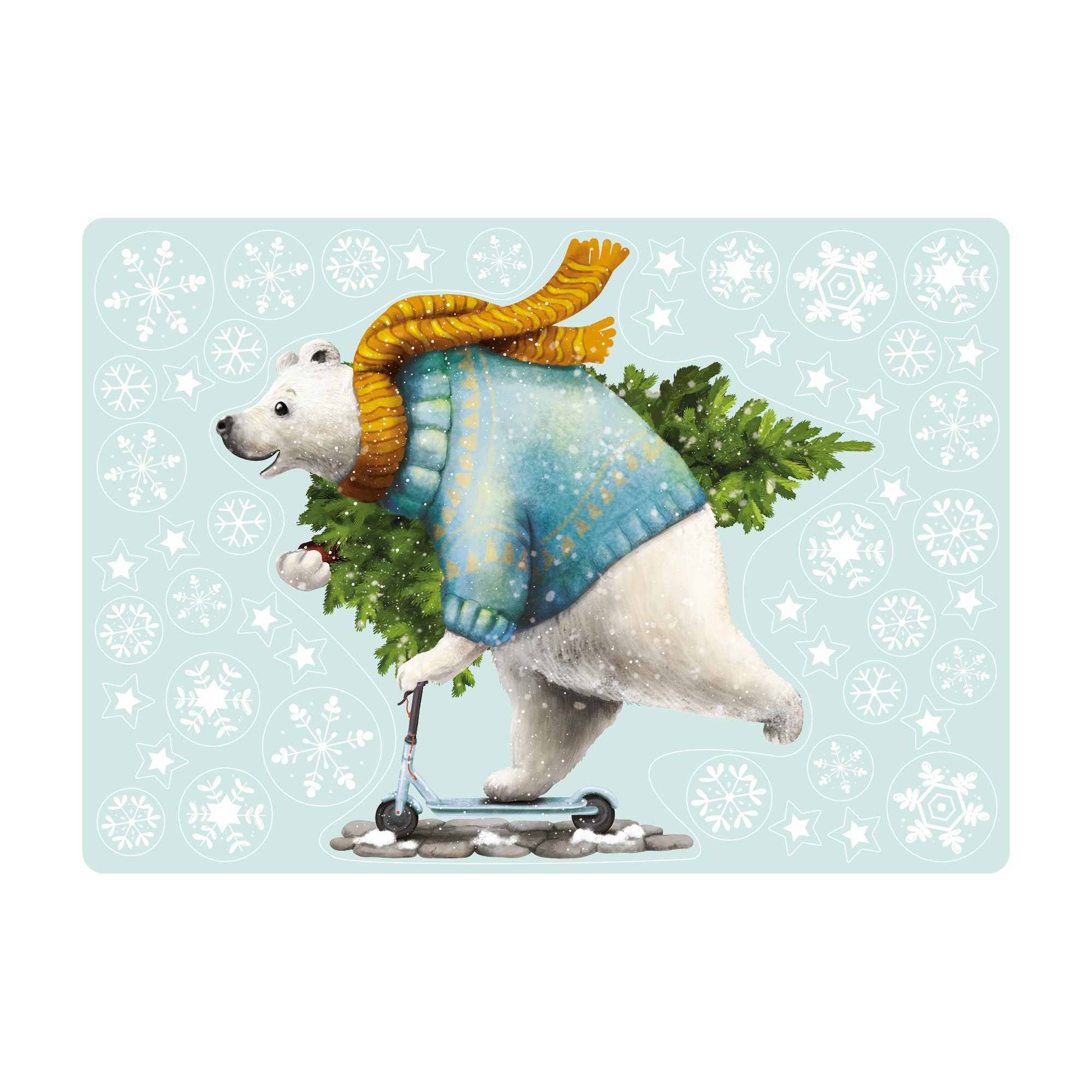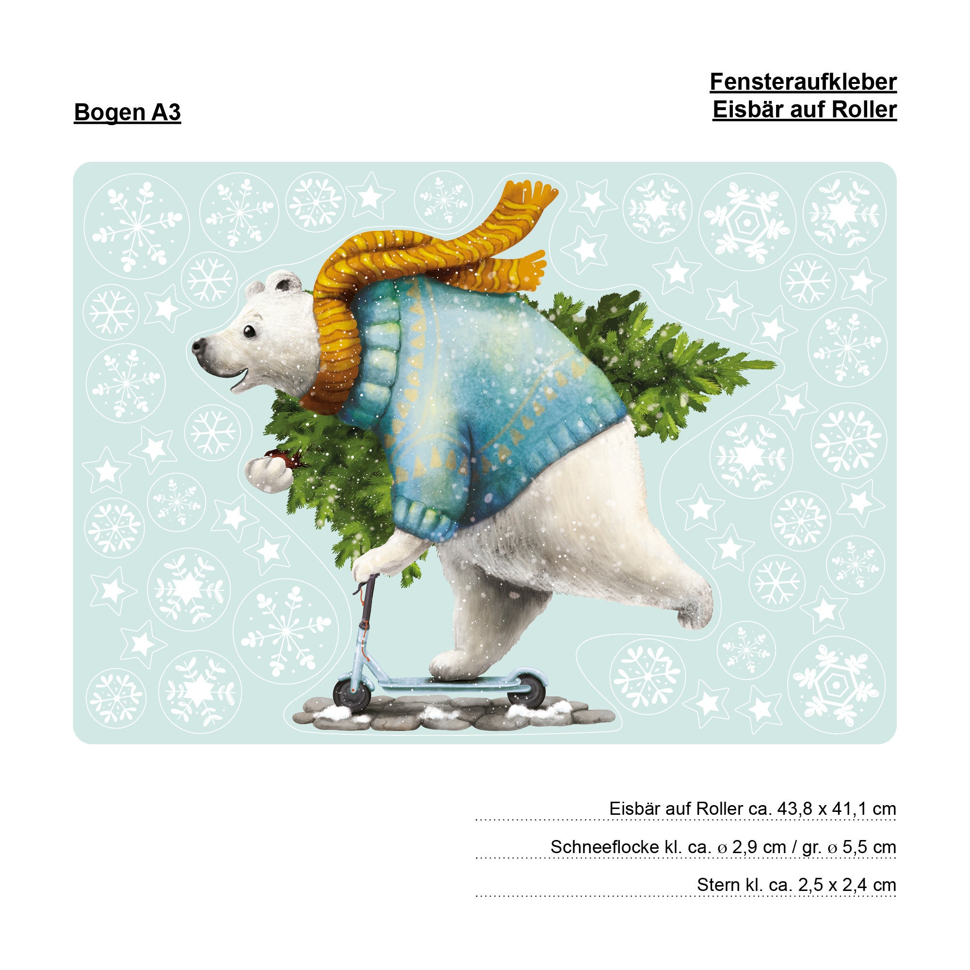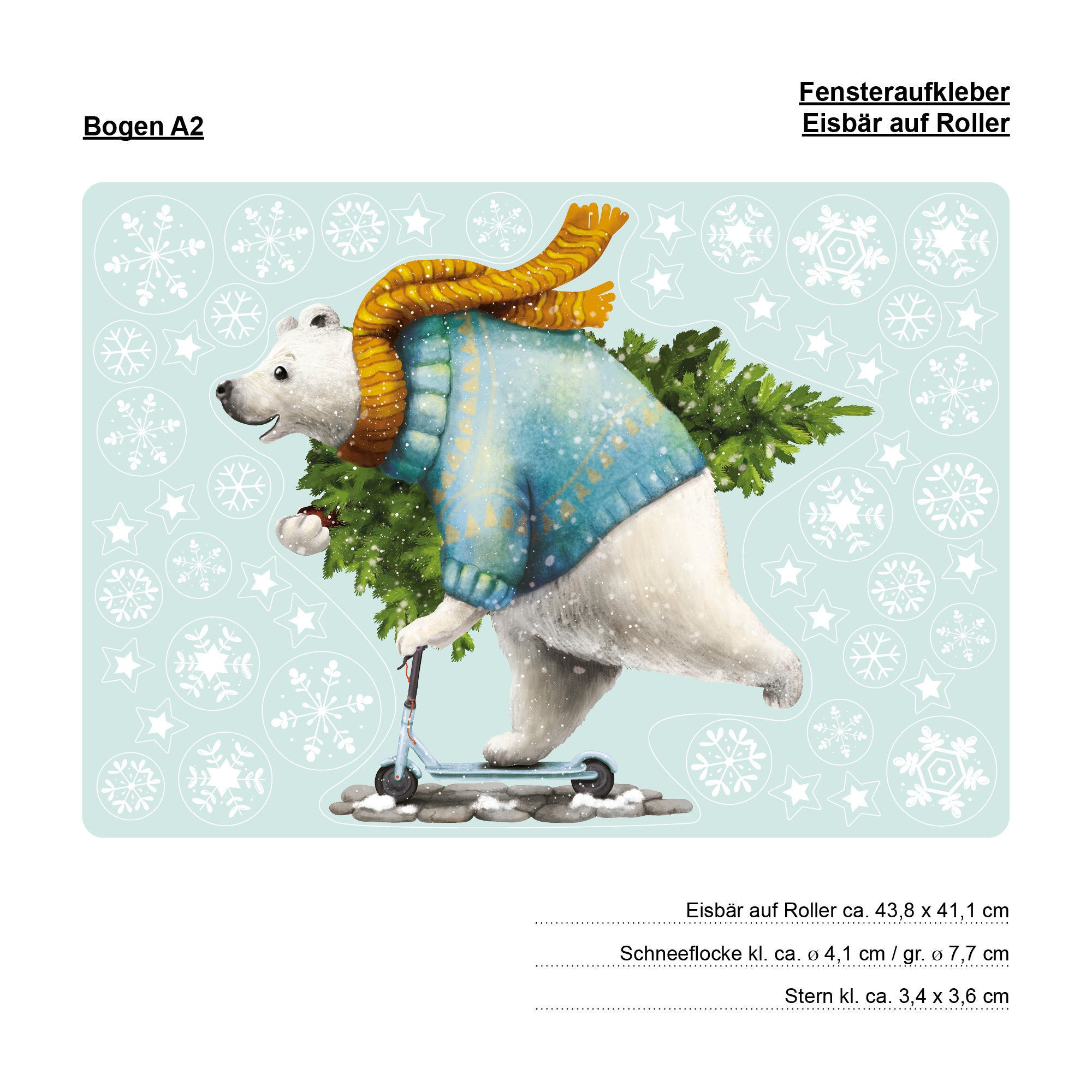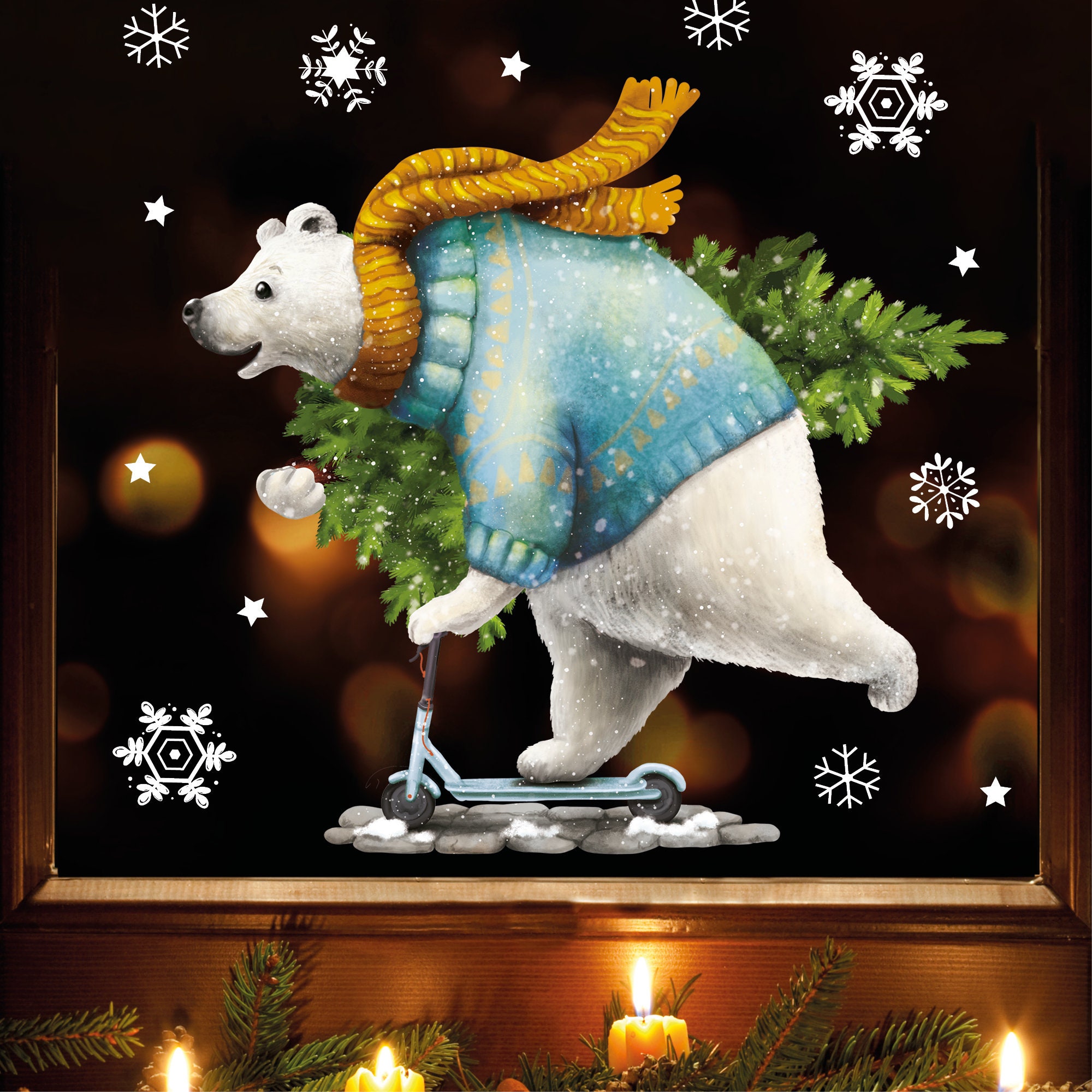 Fensterbild Weihnachten Winter Eisbär mit Tannenbaum auf Roller und Schneeflocken Kinderzimmer Fenster Weihnachtsdeko