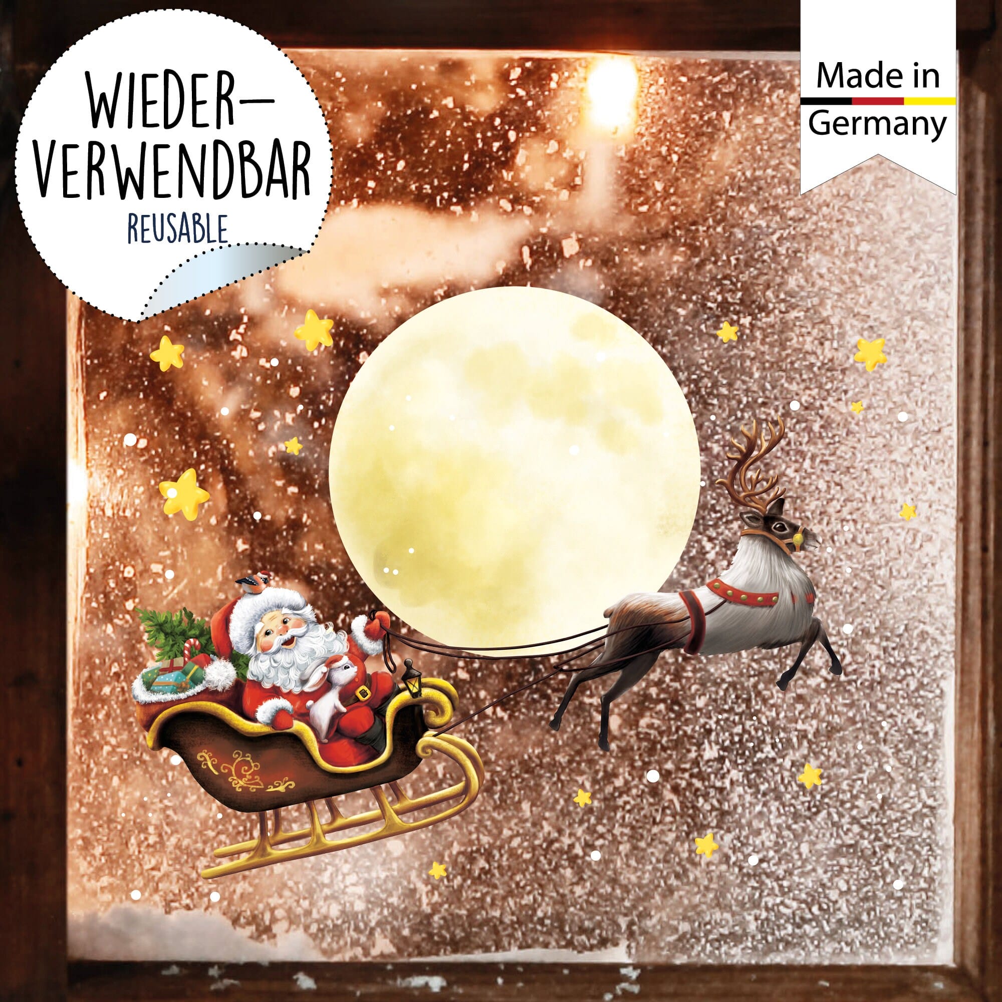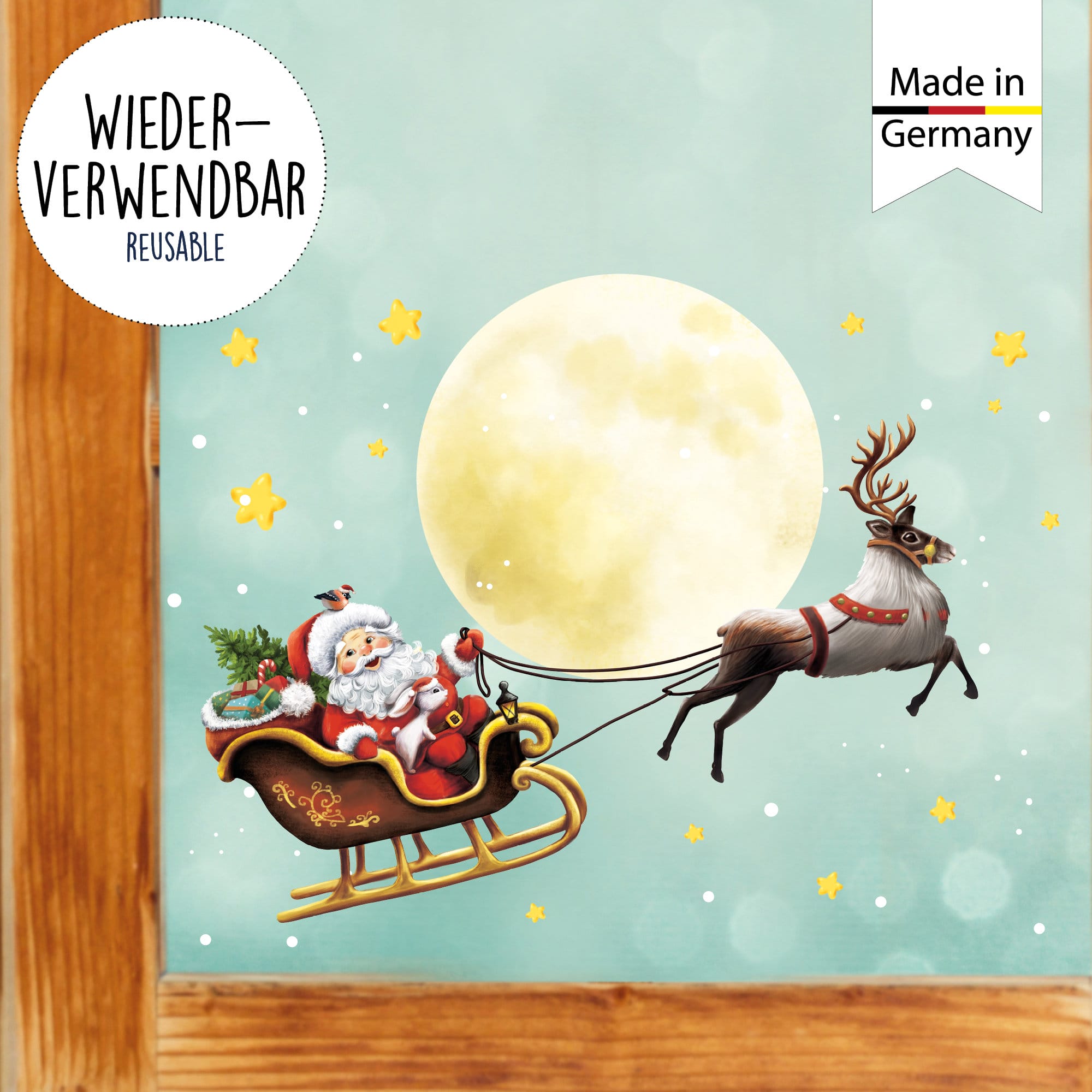 Fensterbild Weihnachten Winter Weihnachtsmann Schlitten Elch Rentier Fensterdeko Kinder wiederverwendbar