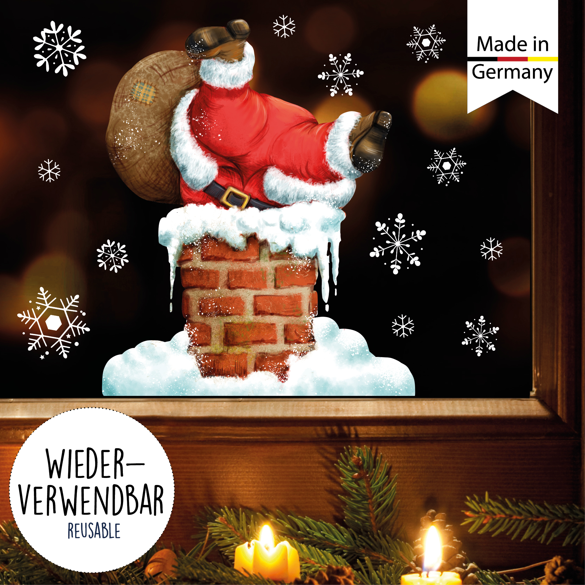 Fensterbild Weihnachten Winter Weihnachtsmann Schornstein mit Schneeflocken Adventsdeko wiederverwendbar