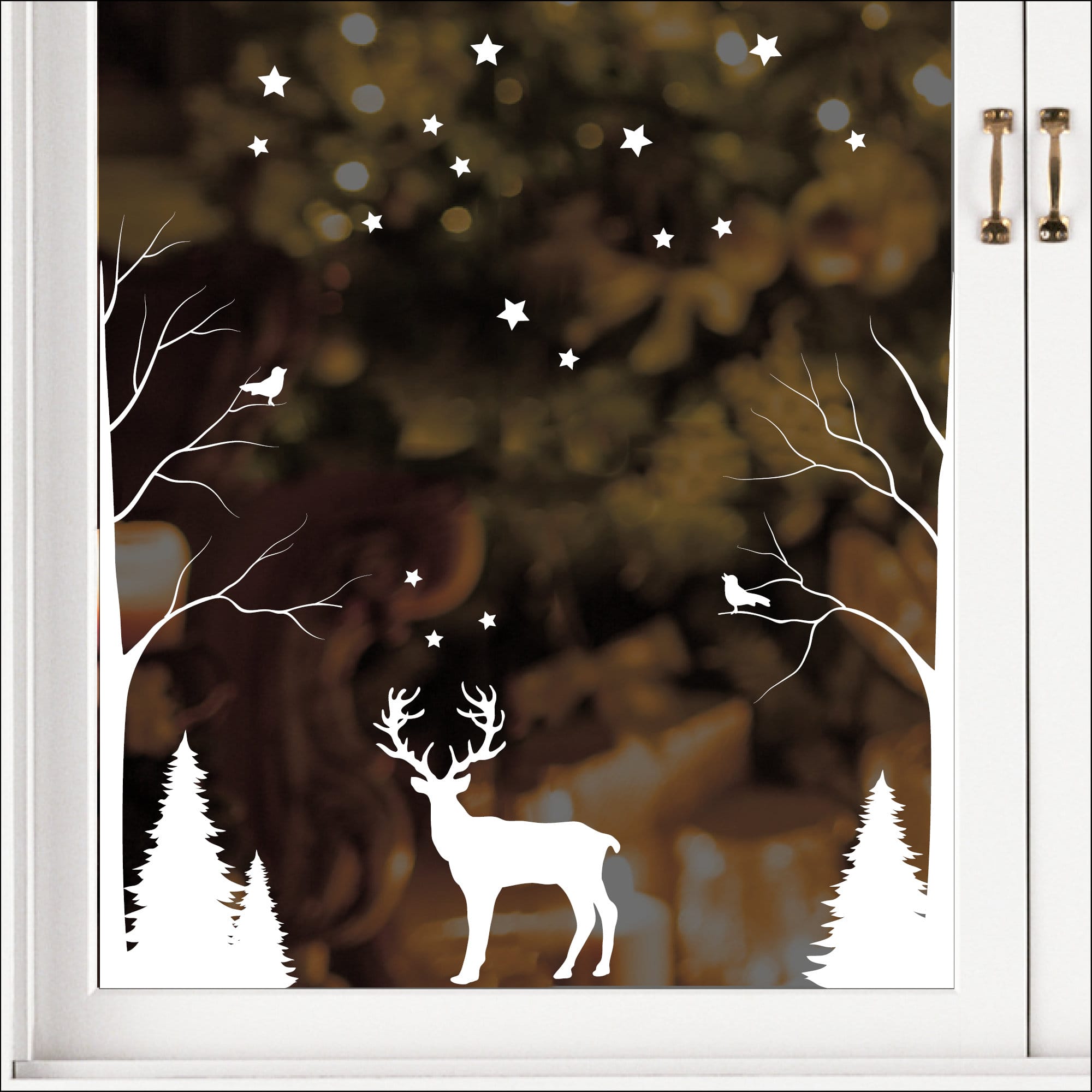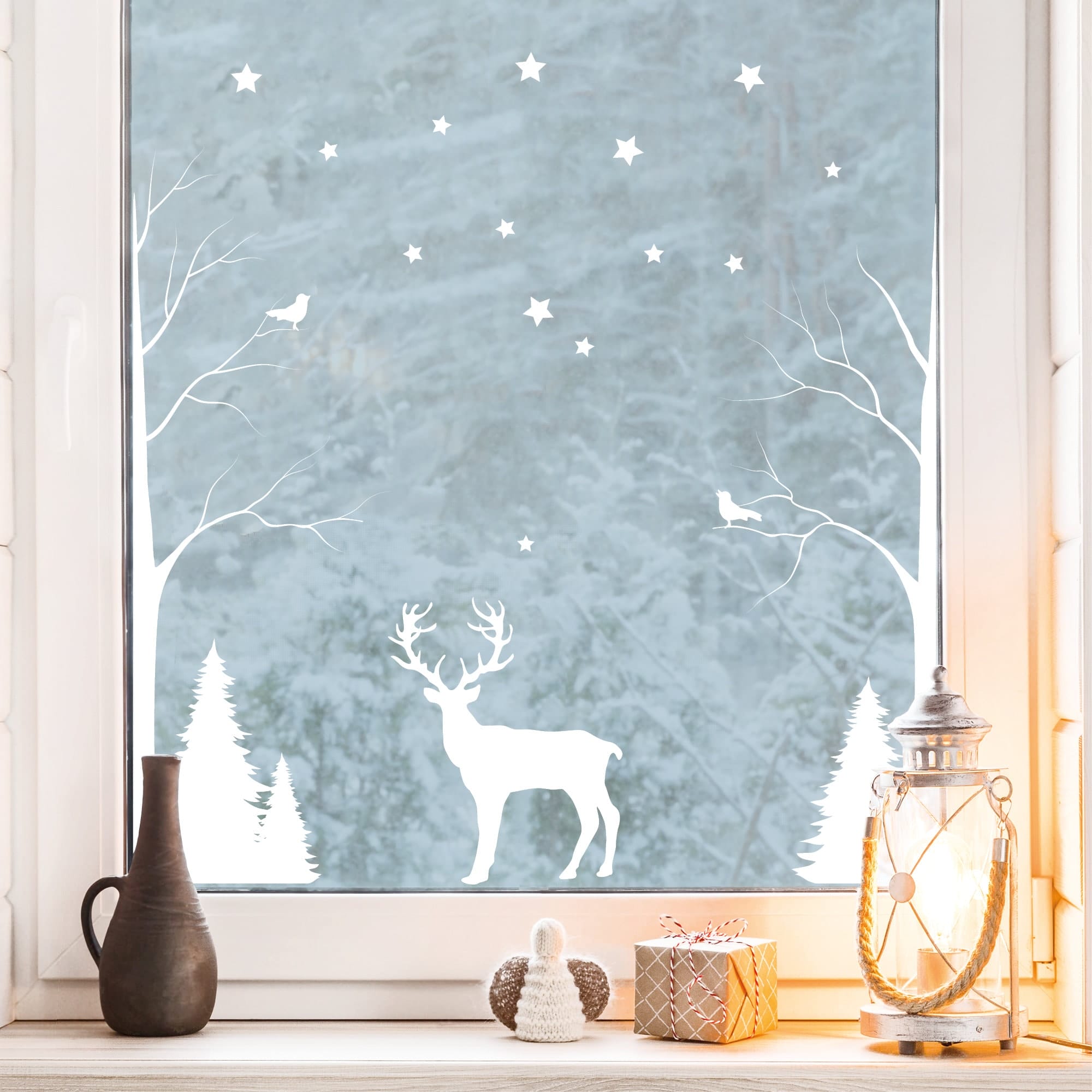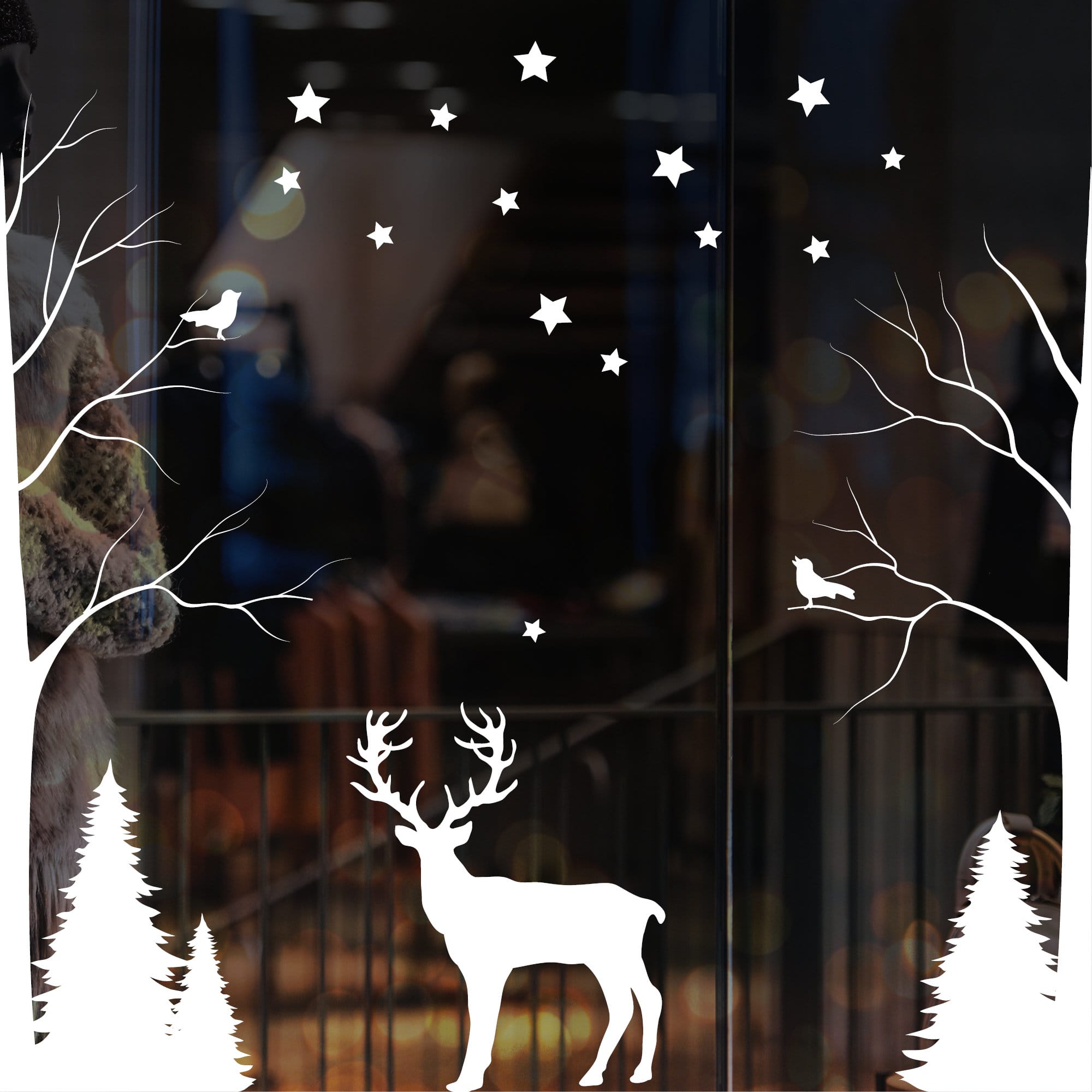 Fensterbild Weihnachten Winter weißer Hirsch mit Bäumen Fensteraufkleber Weihnachtsdekoration wiederverwendbar