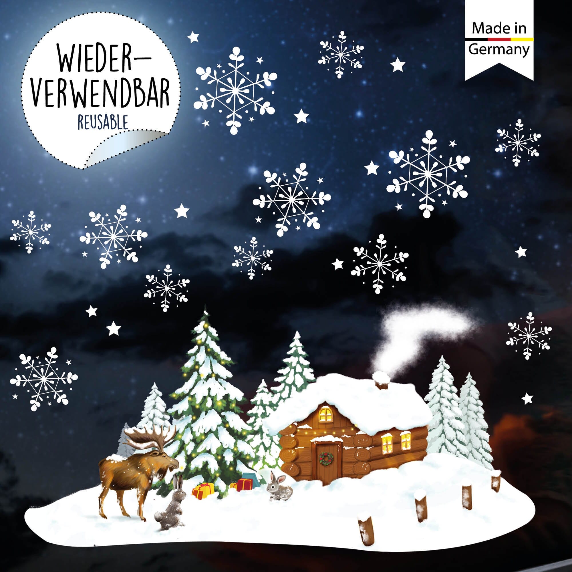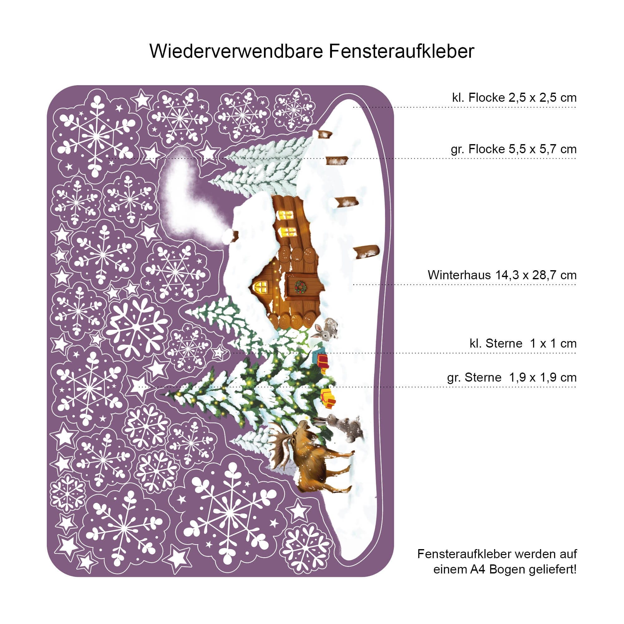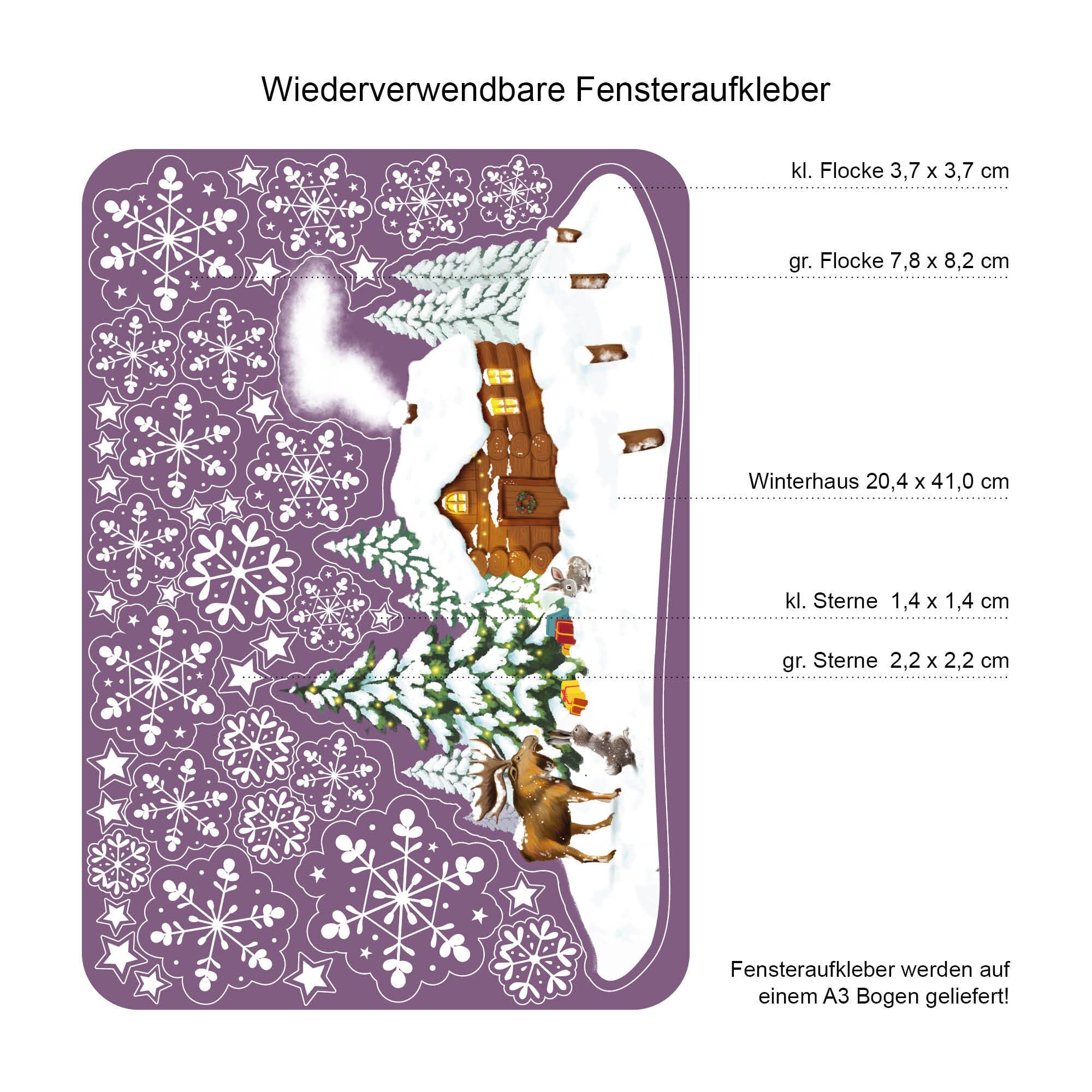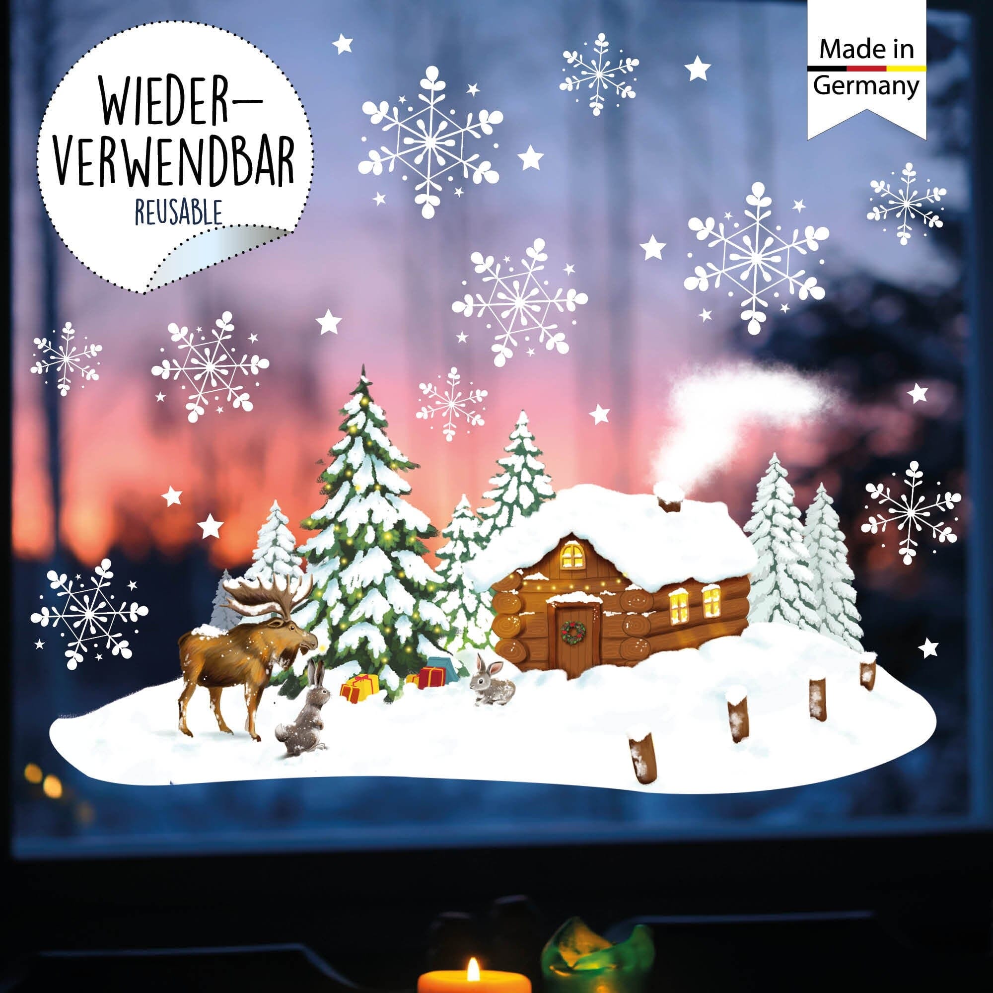 Wiederverwendbarer Fensteraufkleber Winterhäuschen mit Elch und zahlreichen Schneeflocken und Sternen