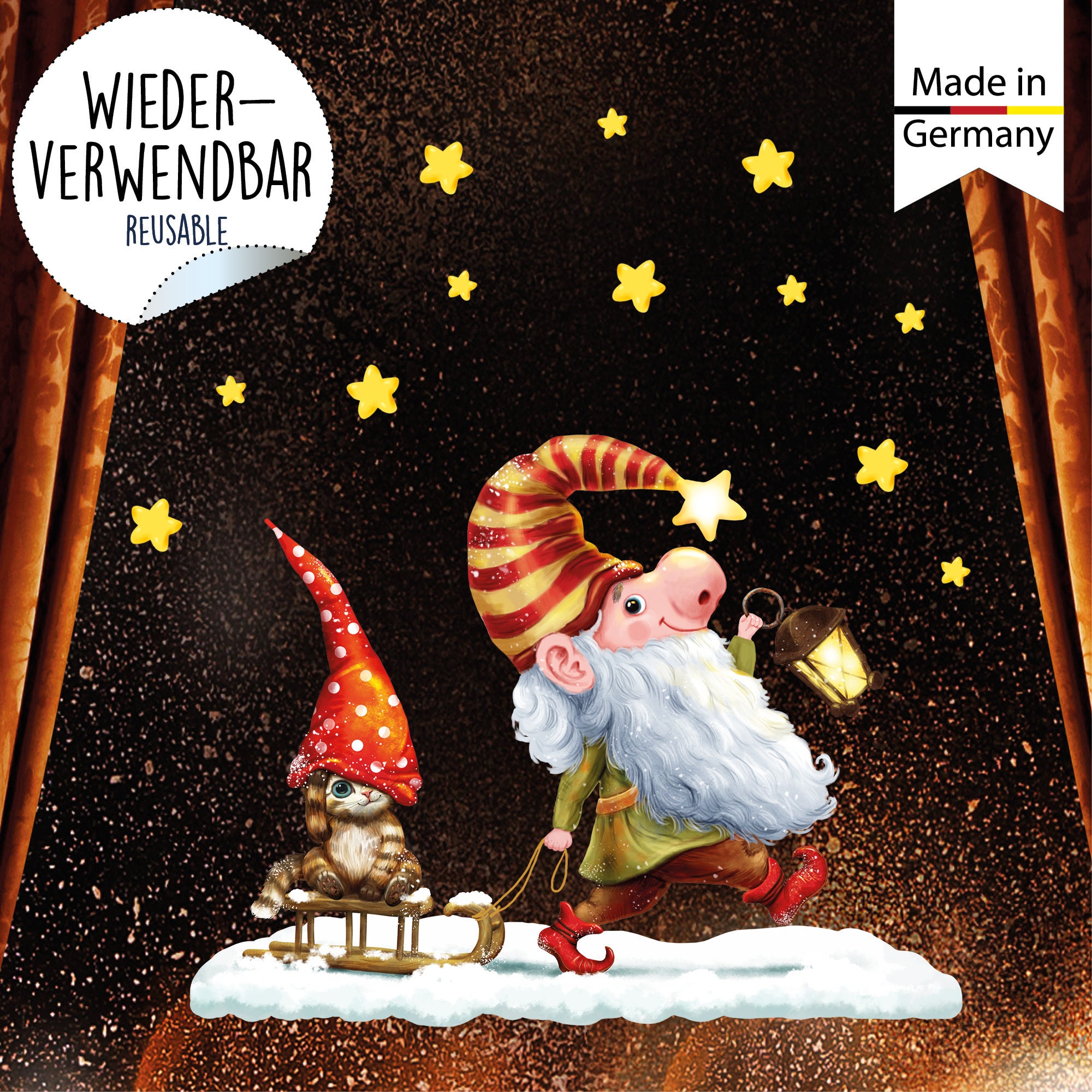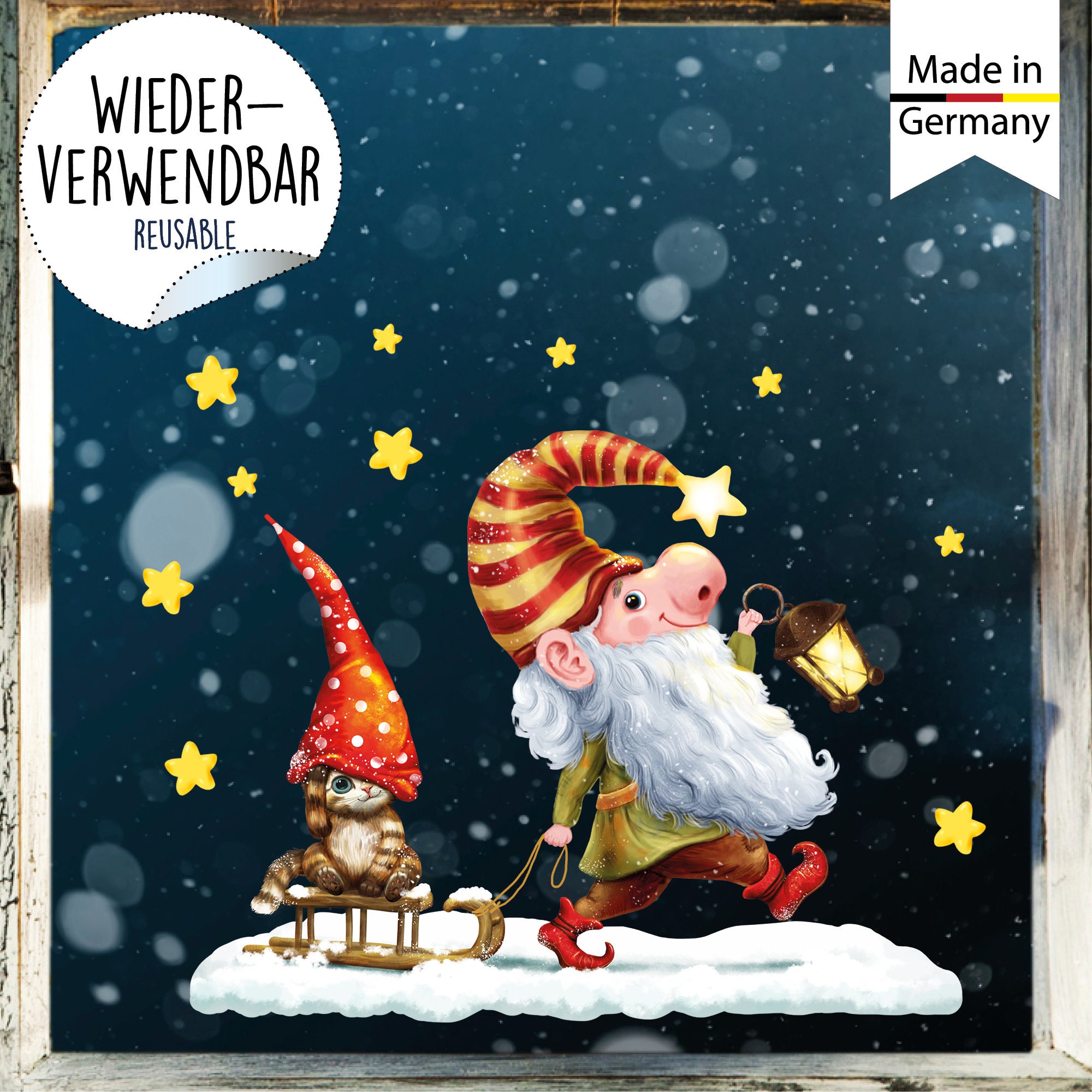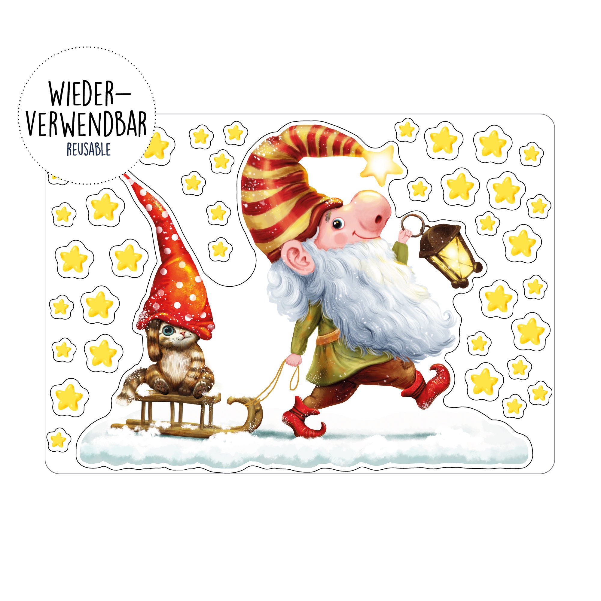 Wiederverwendbares Fensterbild Weihnachten Winter Zwerg mit Katze auf Schlitten und Sternen