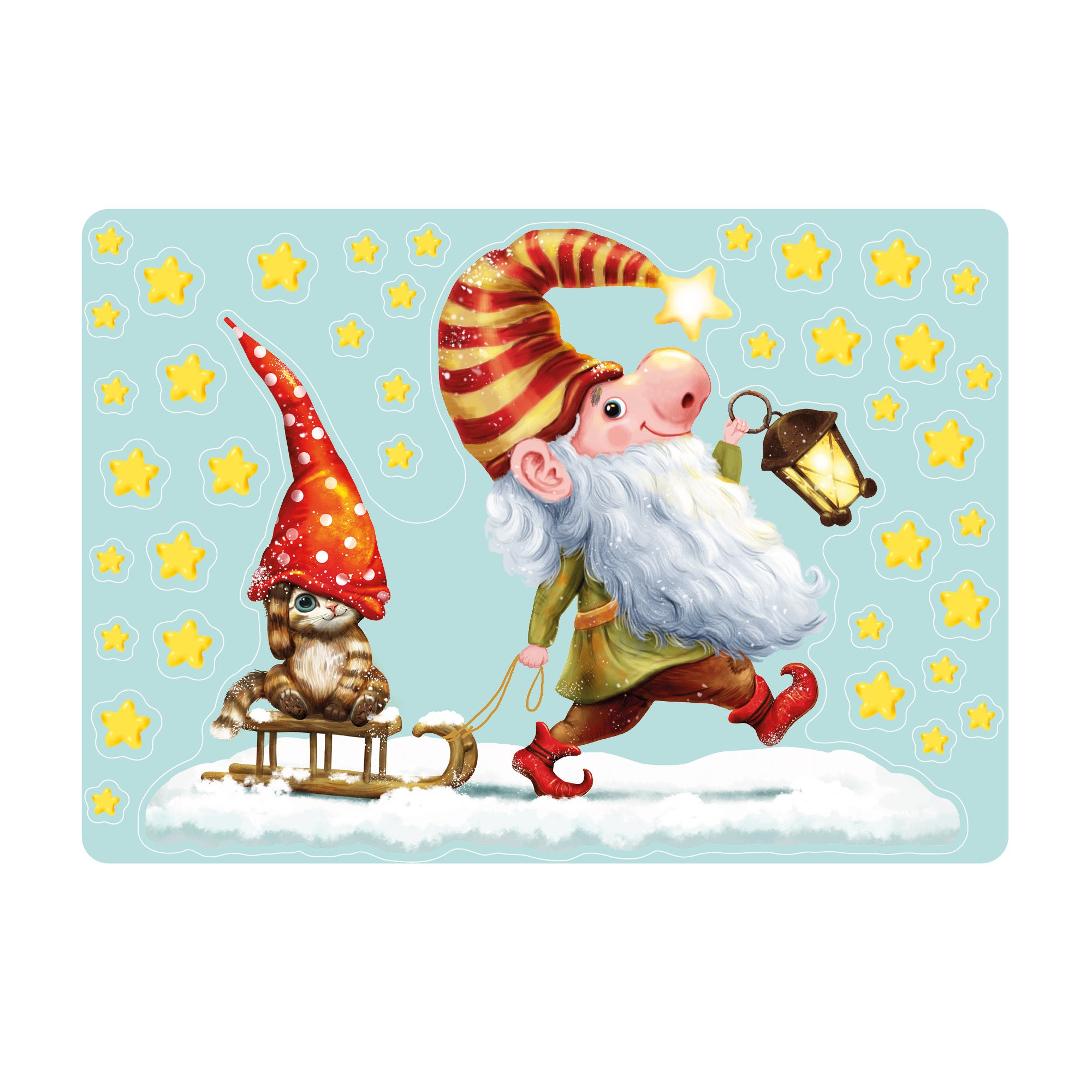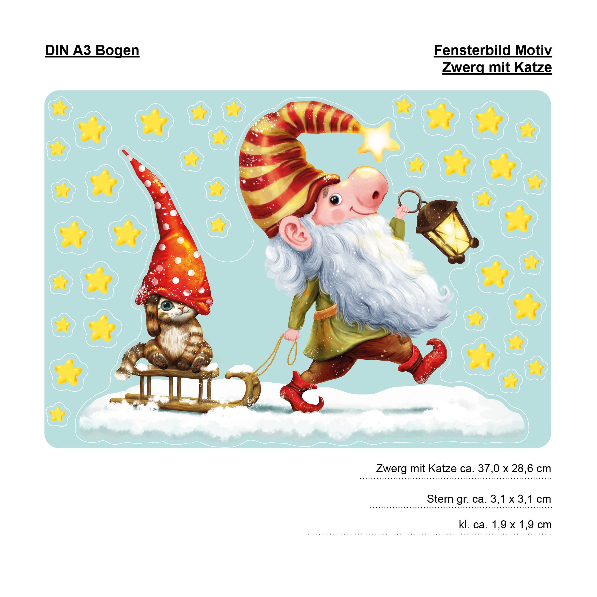 Auf dem Bild ist das Produkt: Fensterbild Weihnachten Winter Zwerg mit Katze auf Schlitten und Sternen zum Preis von €13.90 abgebildet.