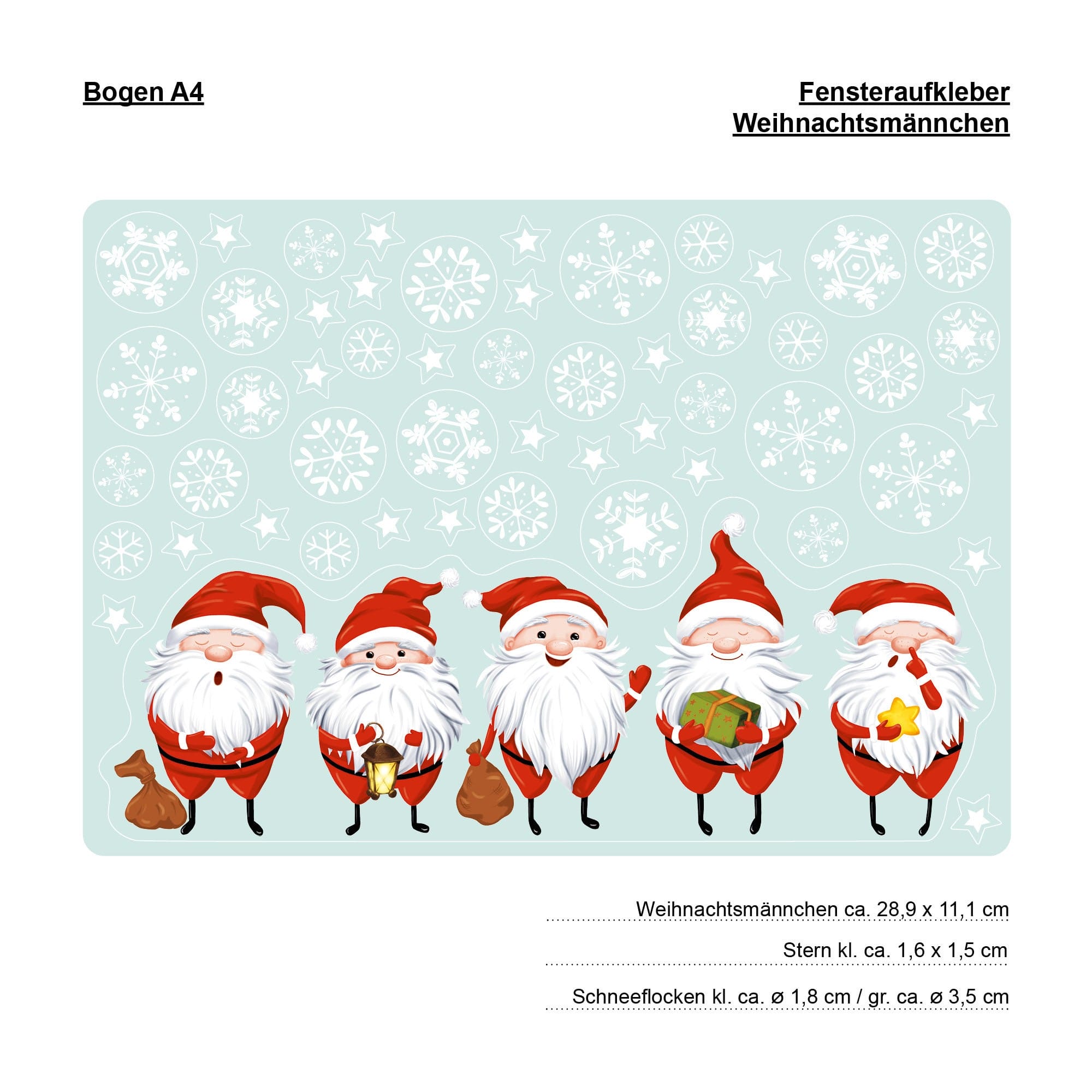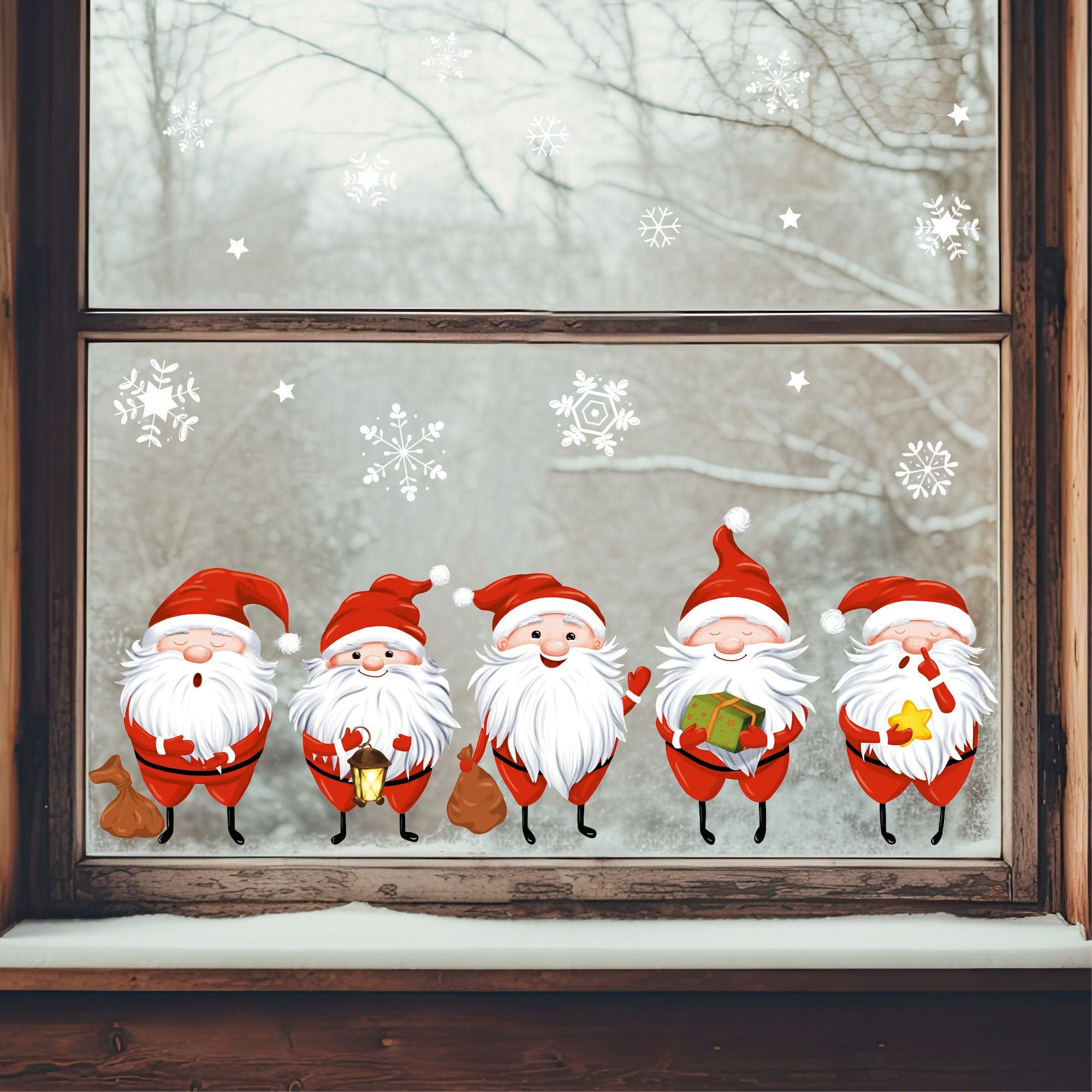 Fensterbild Weihnachtsmänner Wichtel 5 kleine Weihnachtsmänner und Schneeflocken Fensteraufkleber