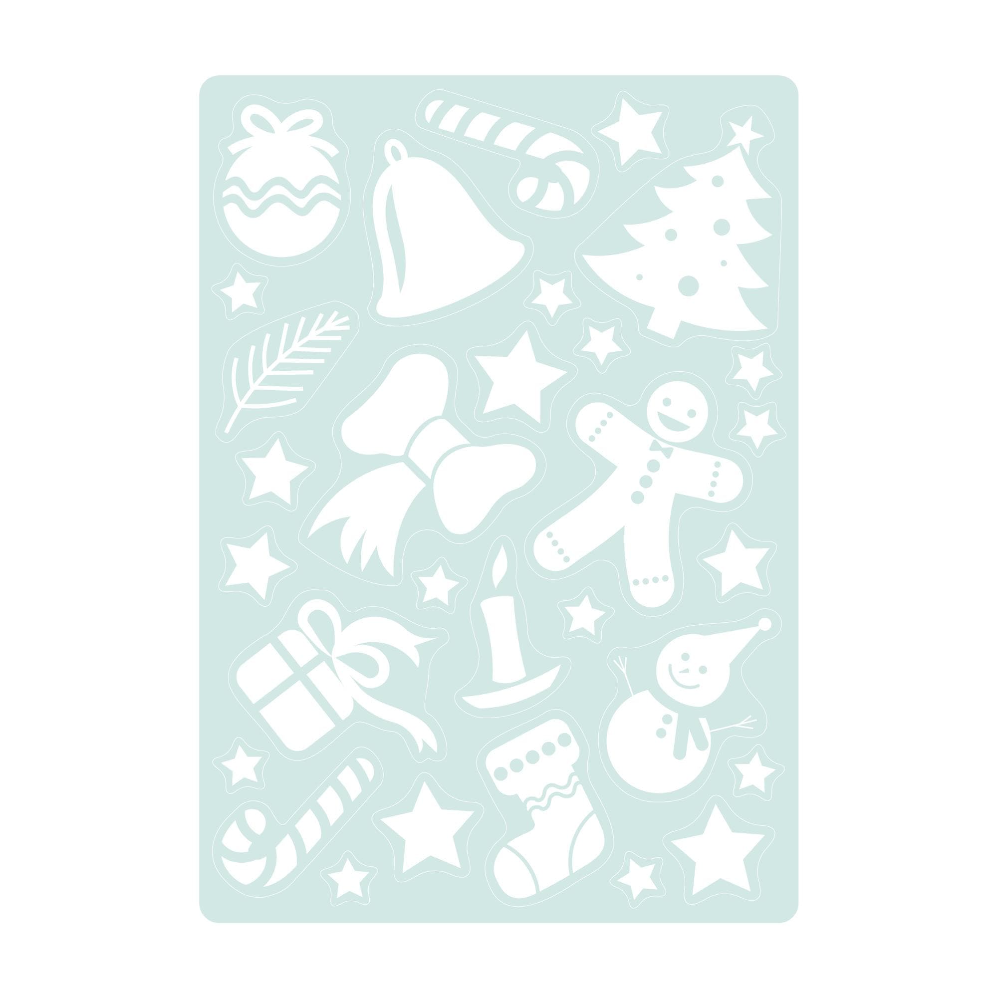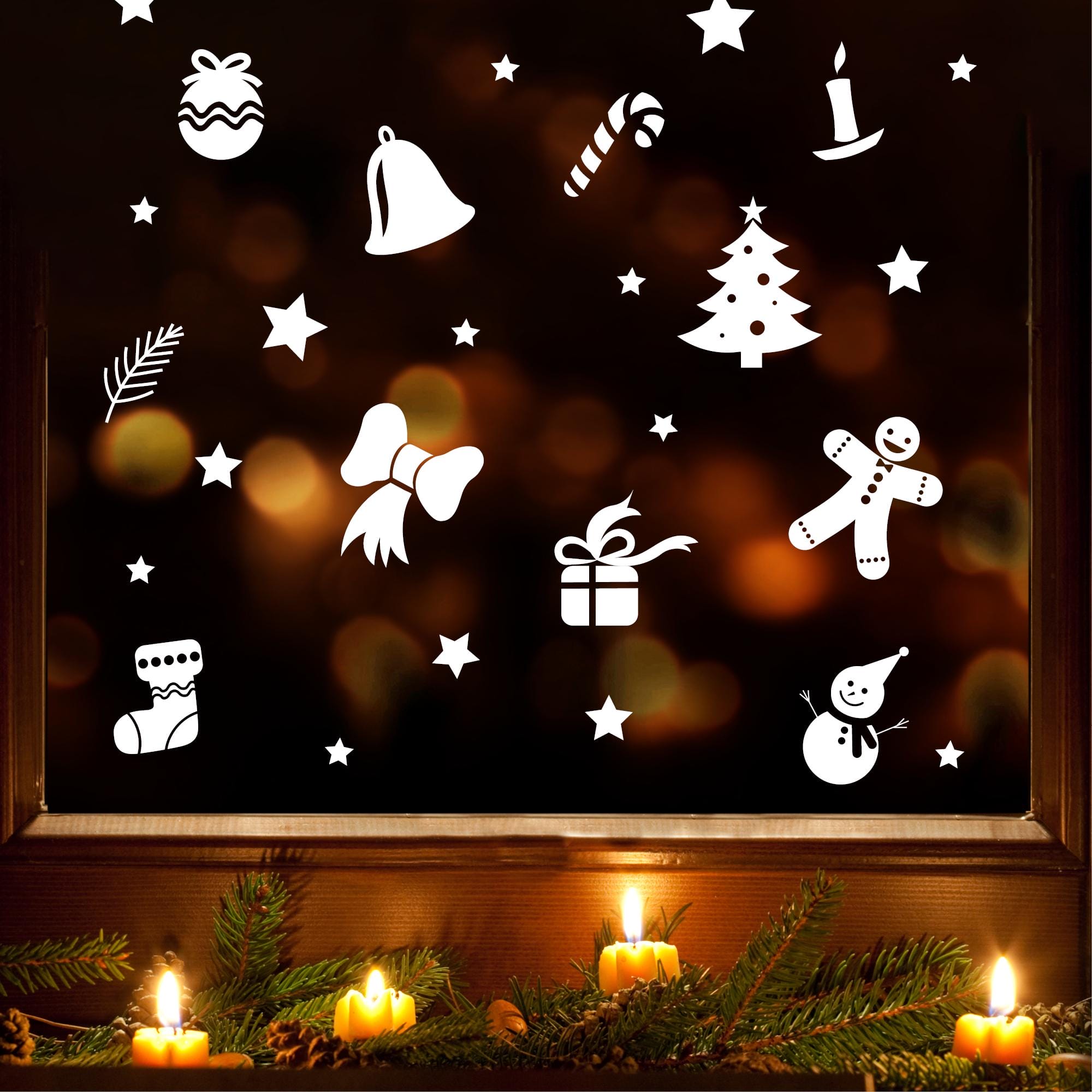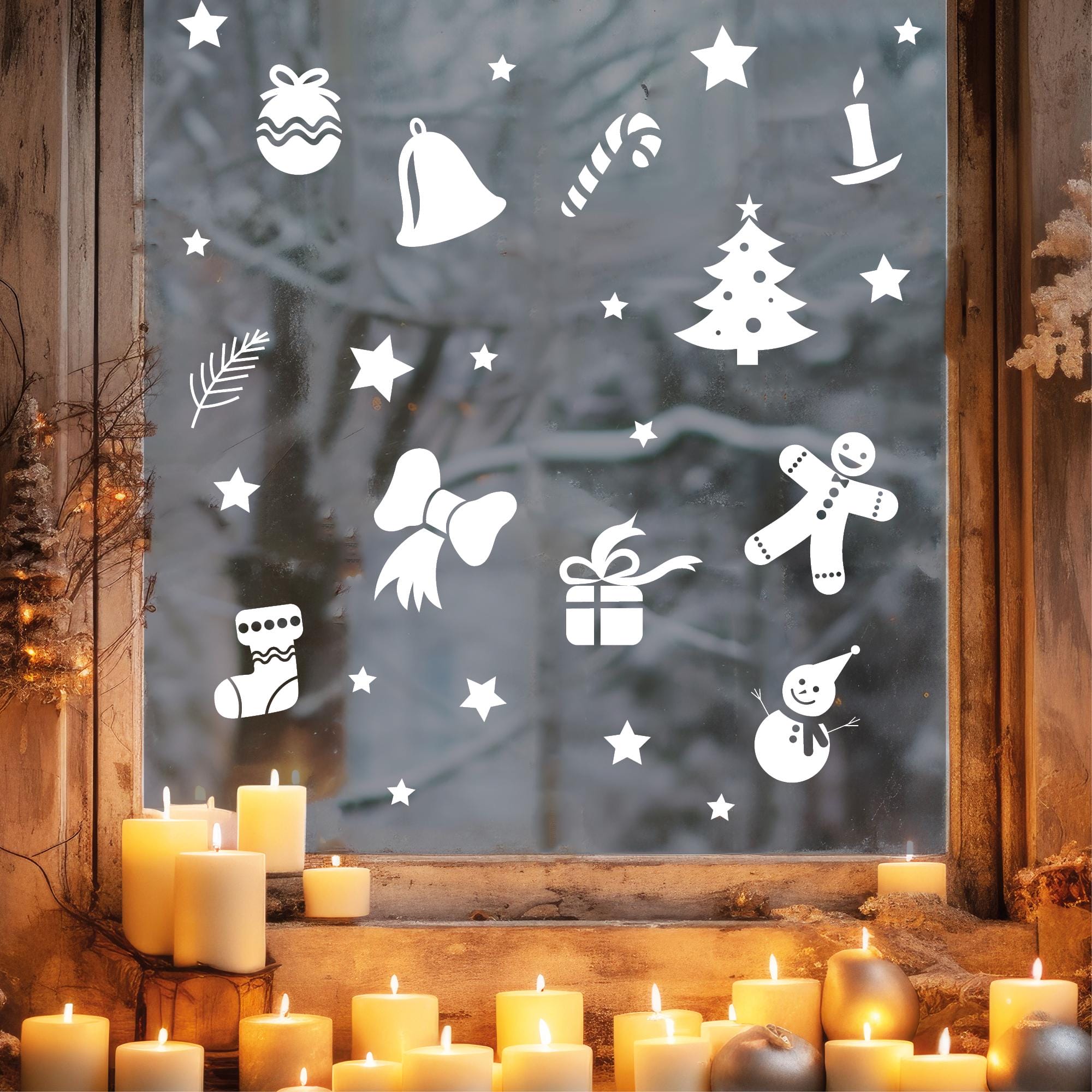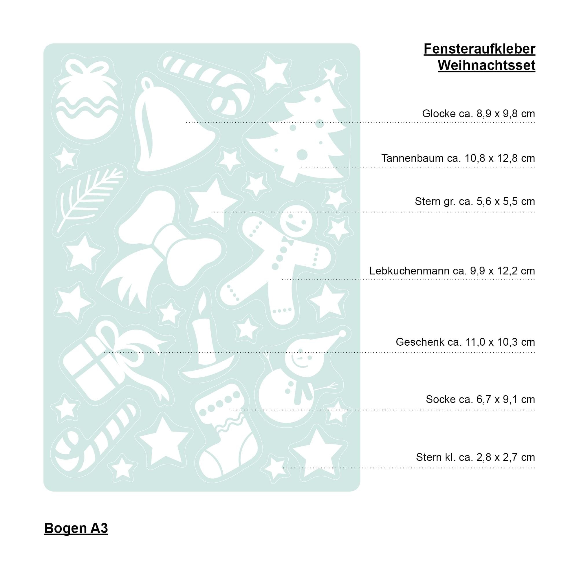 Fensterbild Weihnachtsset Lebkuchenmann Zuckerstange Glocke Schleife Stiefel Kerze Schneemann Tanne Sterne Geschenk Weihnachtskugel weiß Weihnachtsdekoration wiederverwendbar