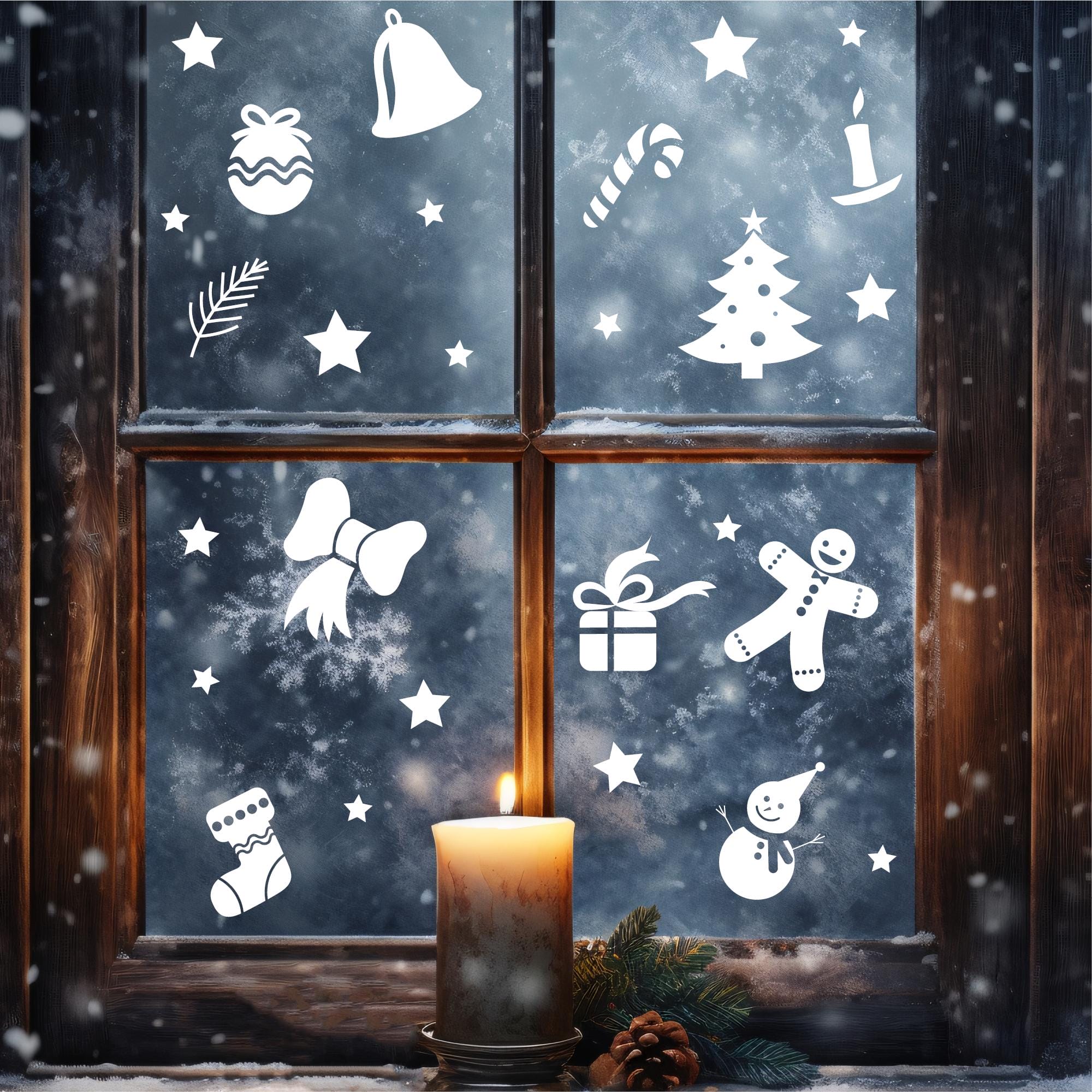 Fensterbild Weihnachtsset Lebkuchenmann Zuckerstange Glocke Schleife Stiefel Kerze Schneemann weiß Weihnachtsdekoration wiederverwendbar