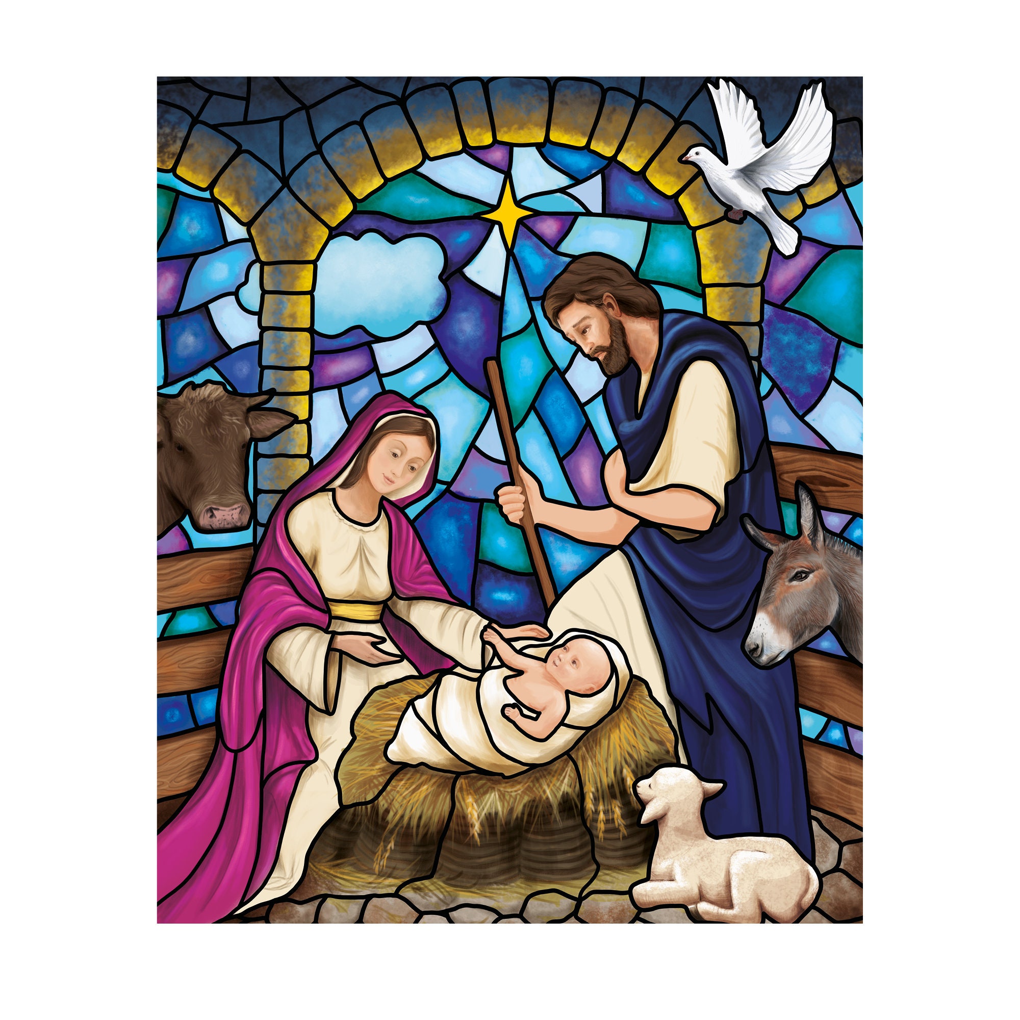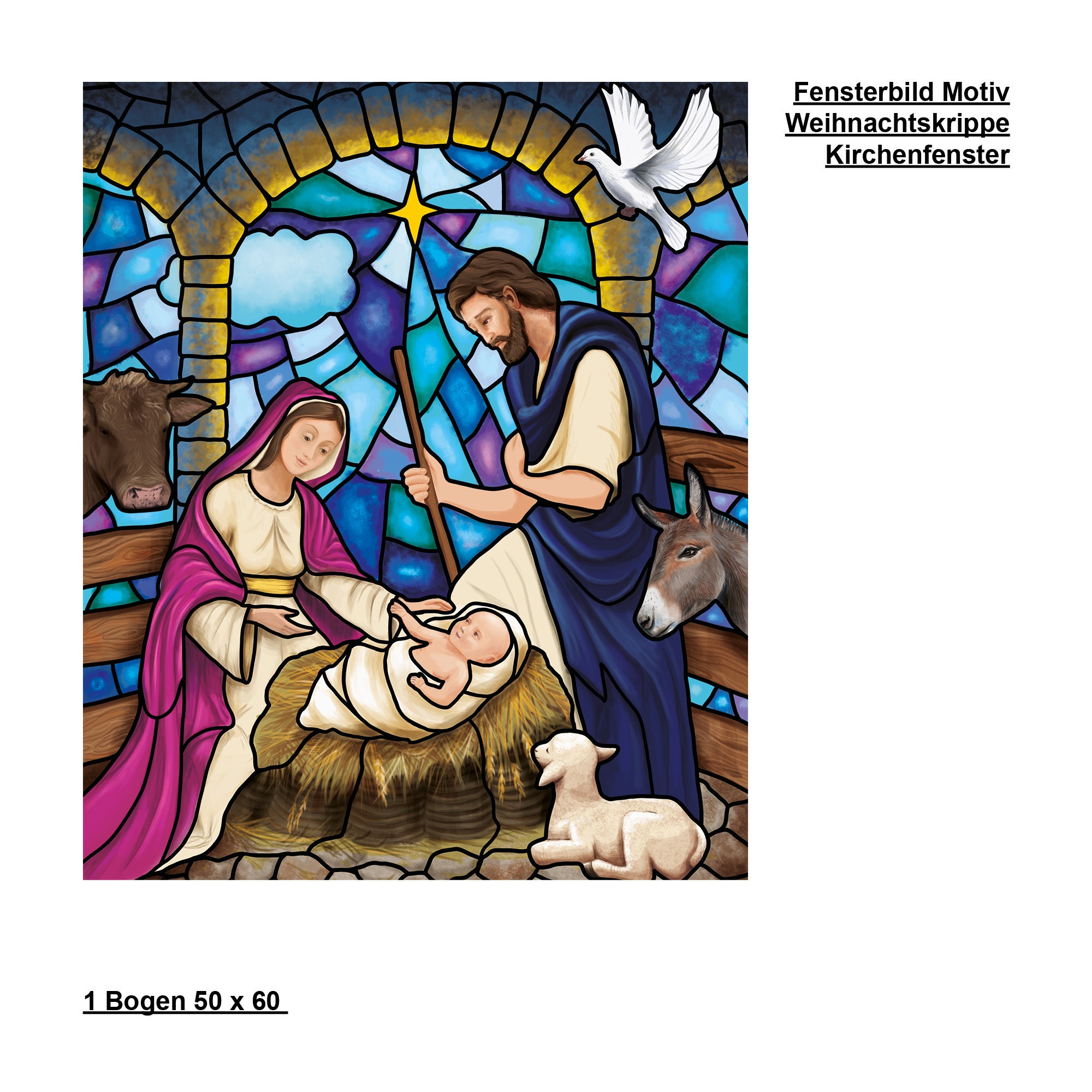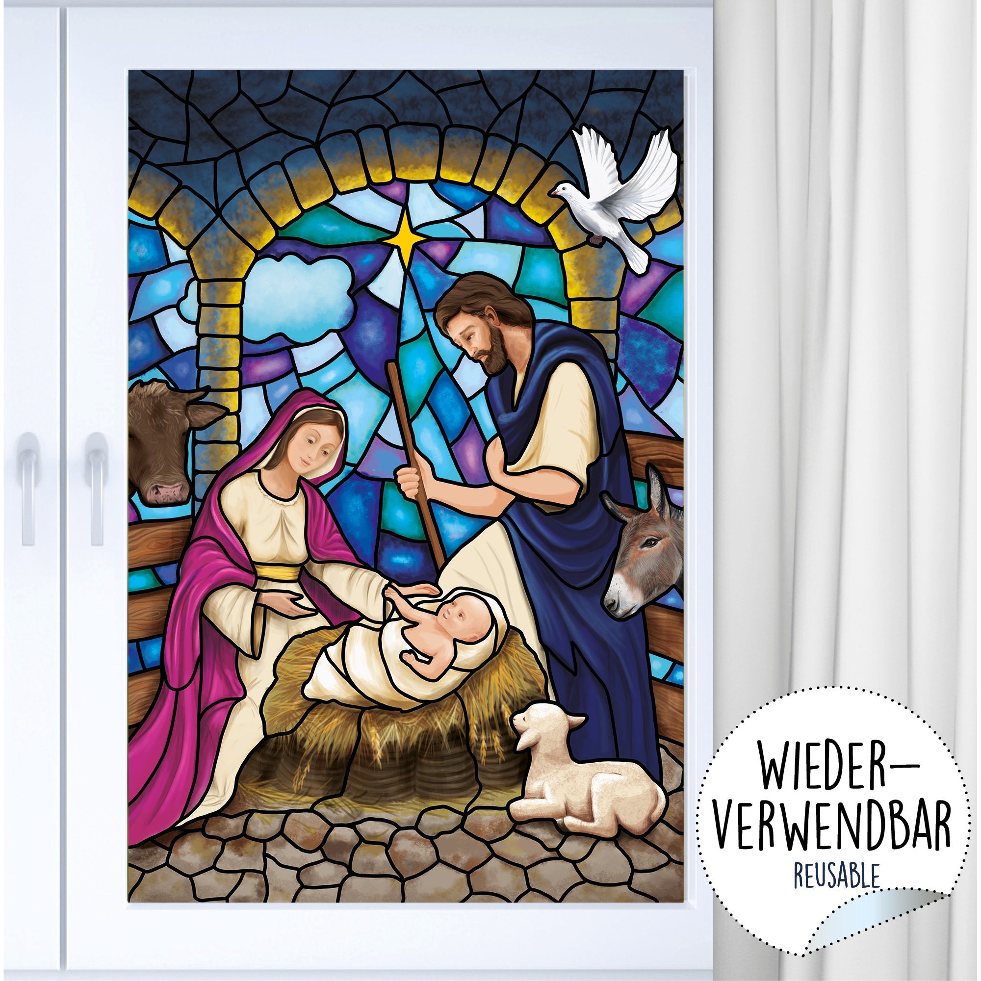 Fensterbild Winter Kirche Krippenbild Maria und Josef wiederverwendbare Fensteraufkleber Mosaik Weihnachten