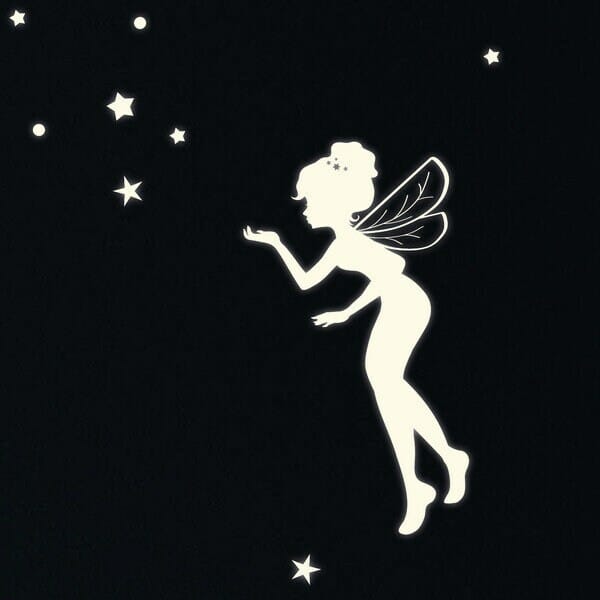 Sie erhalten ein Wandtattoo Set, bestehend aus einer nachtleuchtenden Elfe und 70 Sternen und 60 Punkten