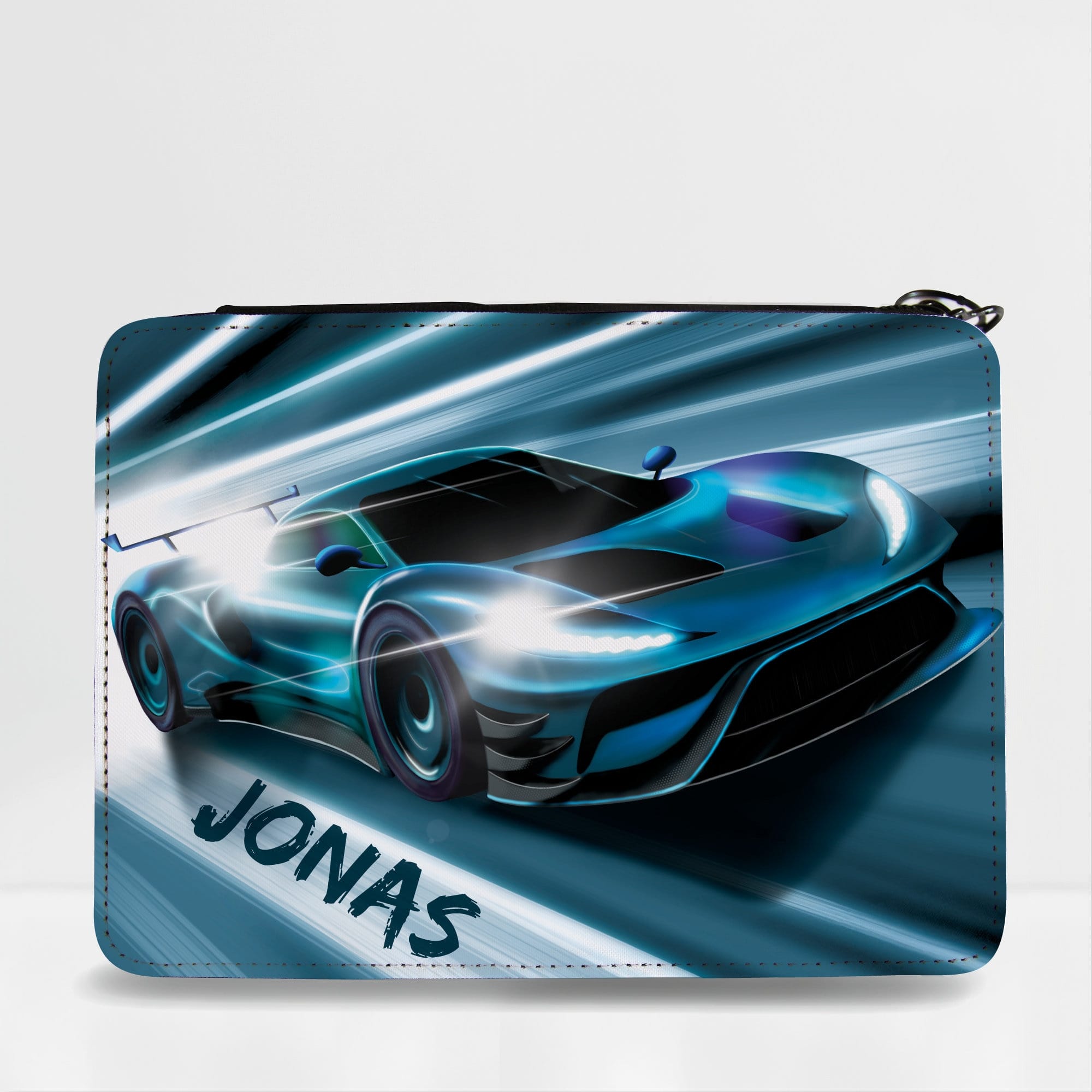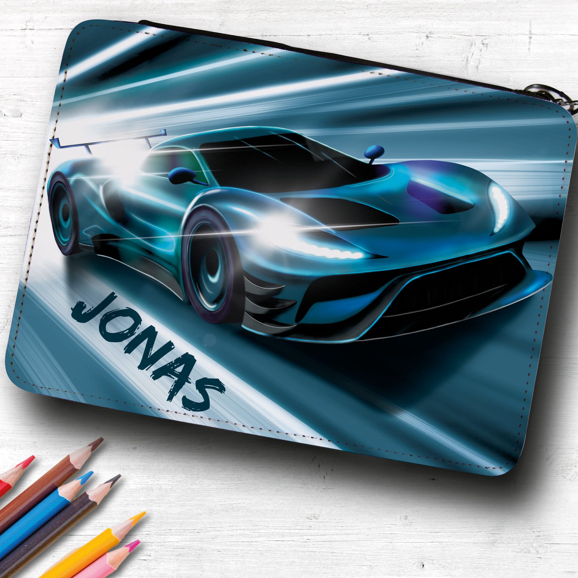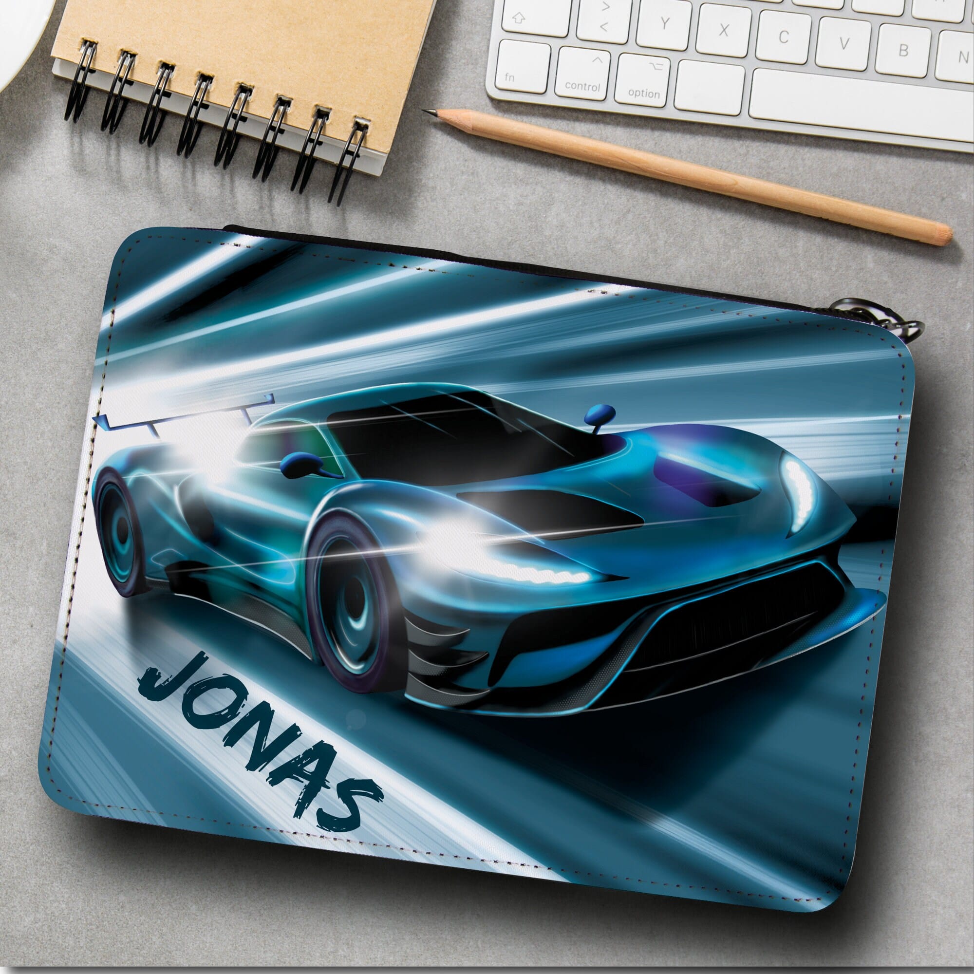 Diese zauberhaft gestaltete Federmappe mit einem Rennauto in Blau kann auf Wunsch – ohne Aufpreis- mit einem Wunschnamen personalisiert werden und bietet eine Menge Platz für Stifte und Schulzubehör.