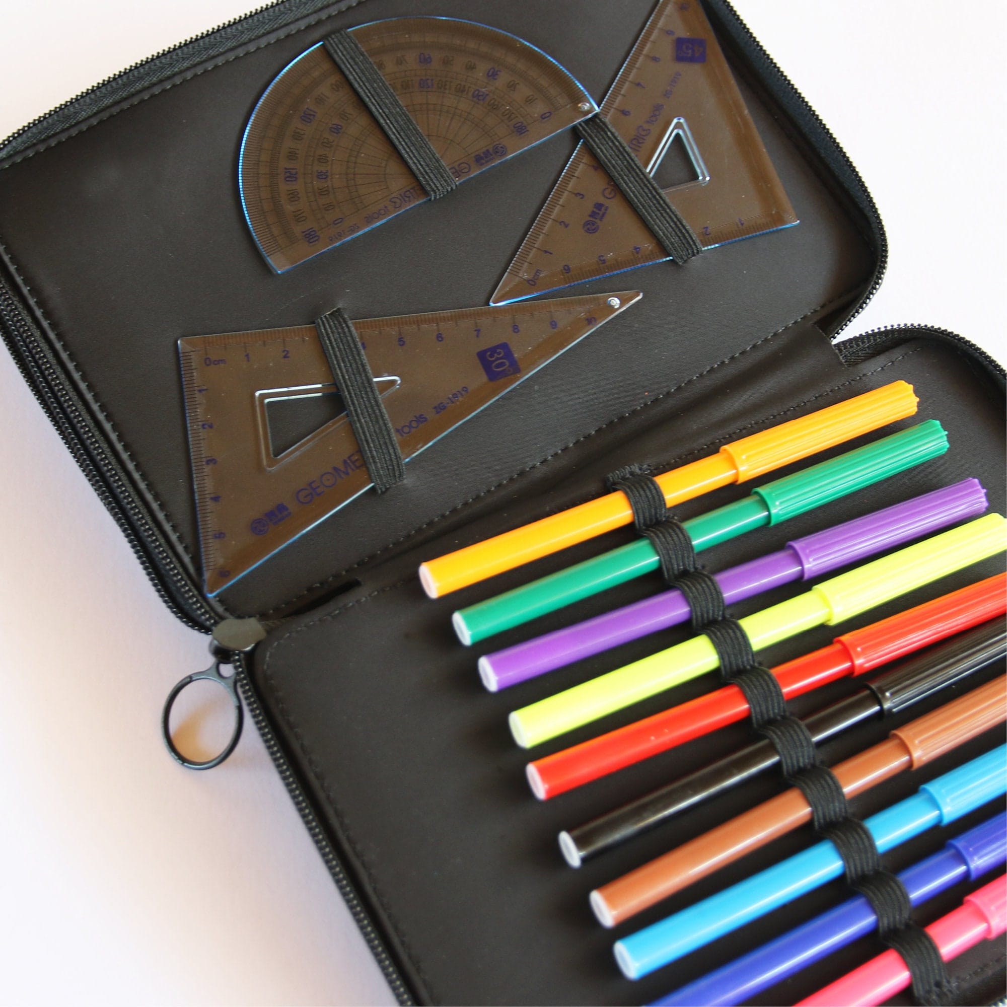 Inkl. 12 Buntstiften, 10 Filzstiften, 1 Lineal, 2 Dreiecken, 1 Winkelmesser, 1 Bleistift, 1 Kugelschreiber mit Kappe in blau, 1 Kugelschreiber mit Kappe in rot, Spitzer, Radierer