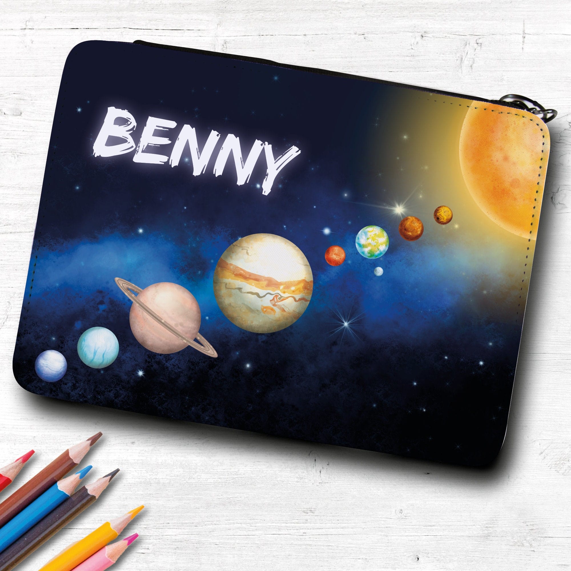Diese zauberhaft gestaltete Federmappe ist mit dem Sonnensystem im Weltall versehen und kann auf Wunsch – ohne Aufpreis- mit einem Wunschnamen personalisiert werden und bietet eine Menge Platz für Stifte und Schulzubehör, Geschenk zur Einschulung