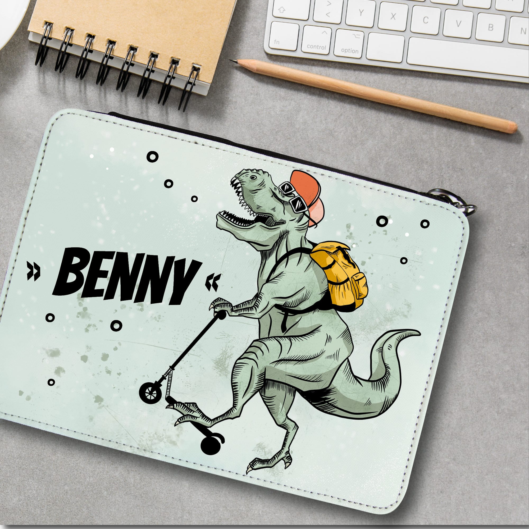 Gefüllte Federtasche Federmäppchen T-Rex auf Roller Dinosaurier personalisiert Wunschname Schulanfang Schule