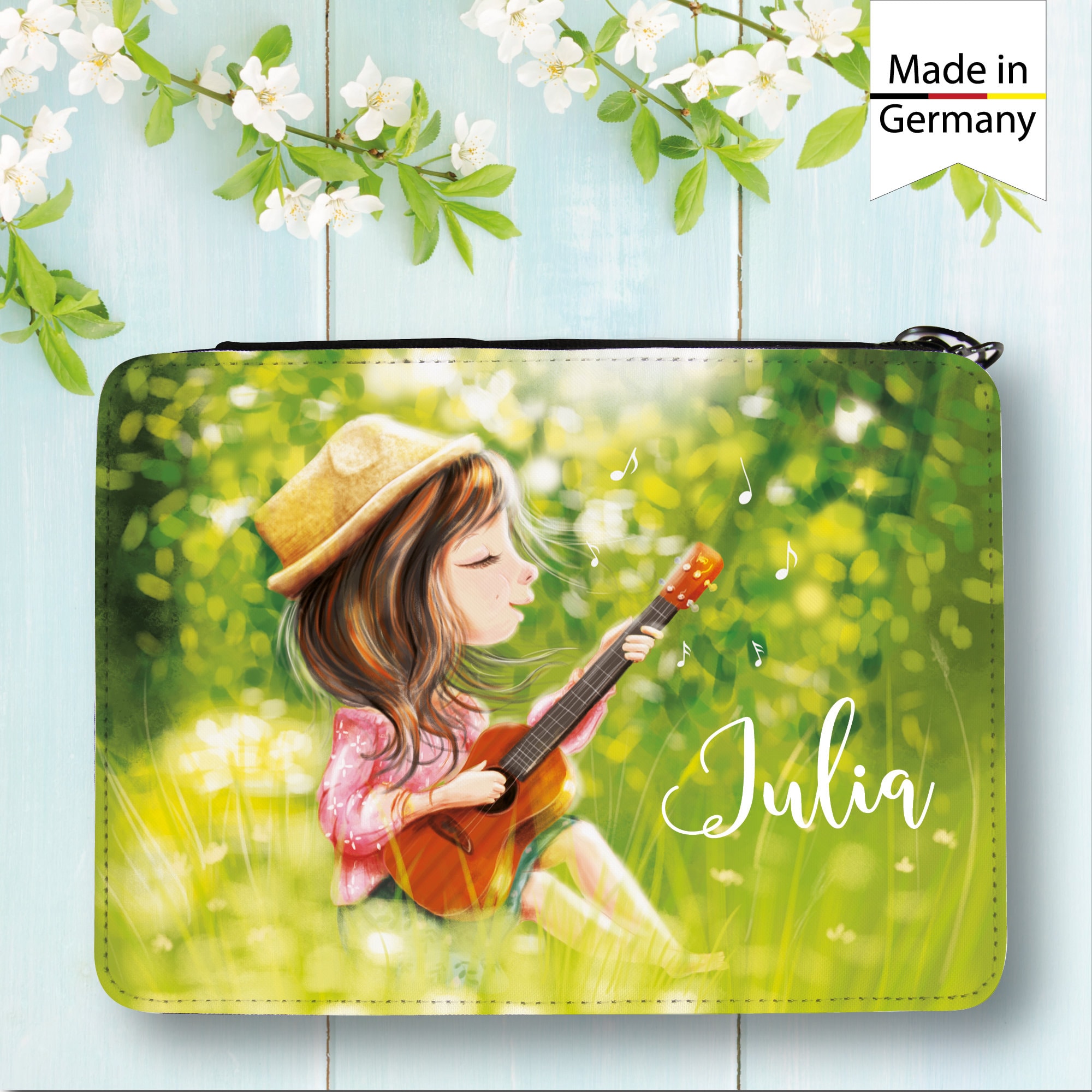 Diese zauberhaft gestaltete Federtasche ist mit einem niedlichen Gitarre spielenden Mädchen versehen auf hellgrünem Hintergrund und kann auf Wunsch – ohne Aufpreis – mit einem Wunschnamen personalisiert werden und bietet eine Menge Platz für Stifte und Schulzubehör. Durch die Personalisierung mit einem Namen ist jede Federmappe einzigartig und eine tolle Geschenkidee zur Einschulung oder den Schulstart.