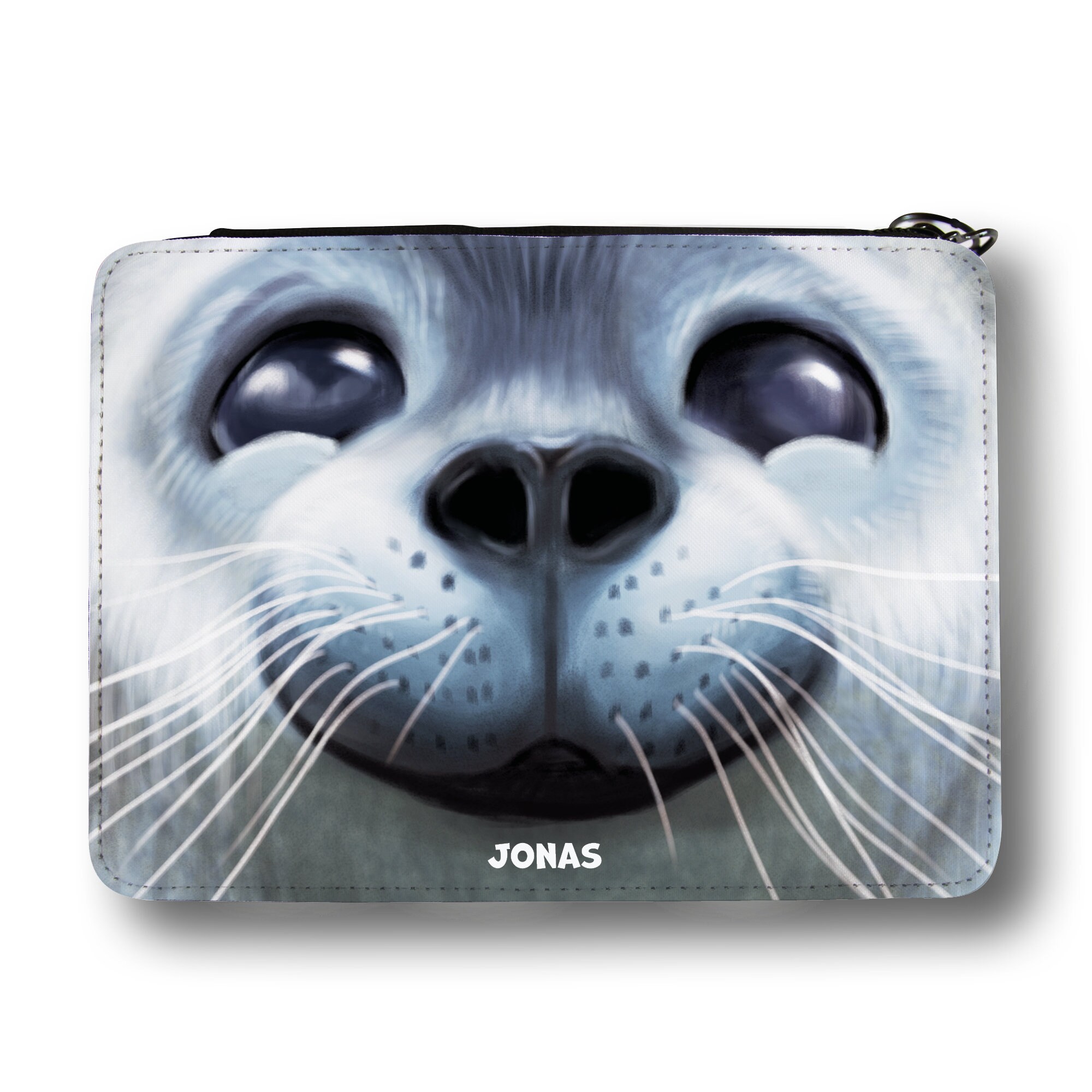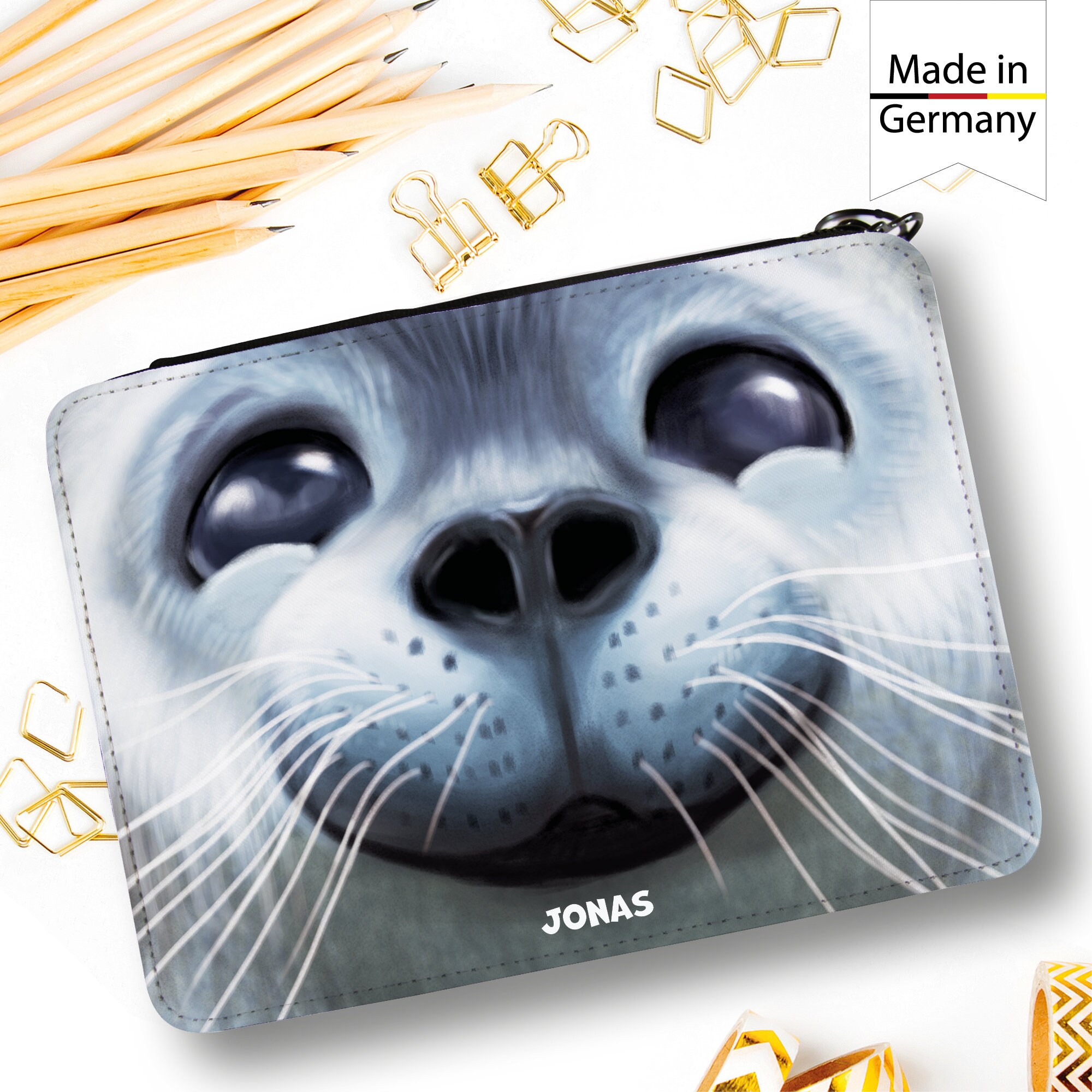 Auf dem Bild ist das Produkt: Gefüllte Federtasche Federmappe mit dem Gesicht einer Robbe personalisiert mit Wunschnamen, Geschenk Geburtstag, Einschulungsgeschenk zum Preis von €29.9 abgebildet.