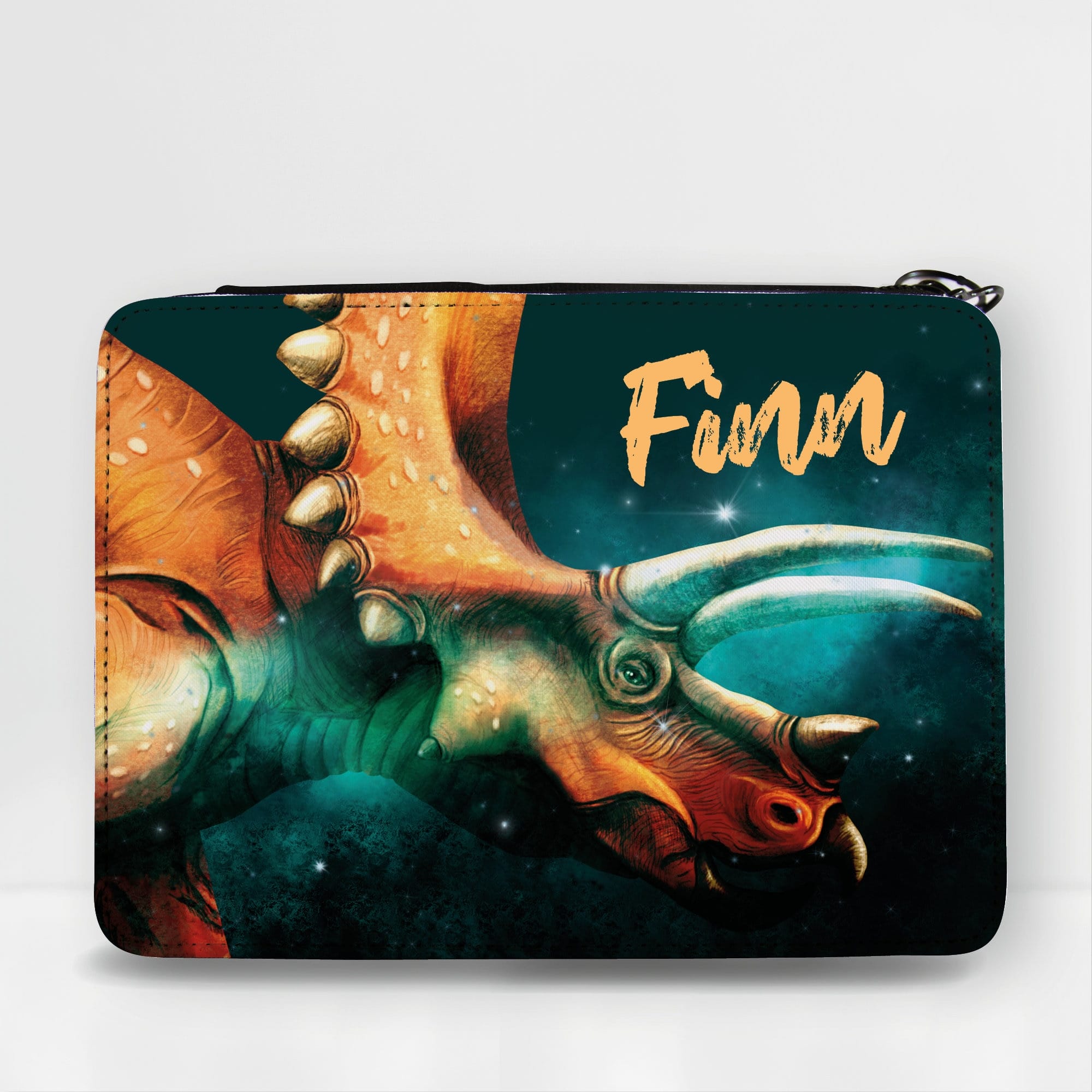 Diese zauberhaft gestaltete Federmappe mit einem Triceratops kann auf Wunsch – ohne Aufpreis – mit einem Wunschnamen personalisiert werden und bietet eine Menge Platz für Stifte und Schulzubehör.