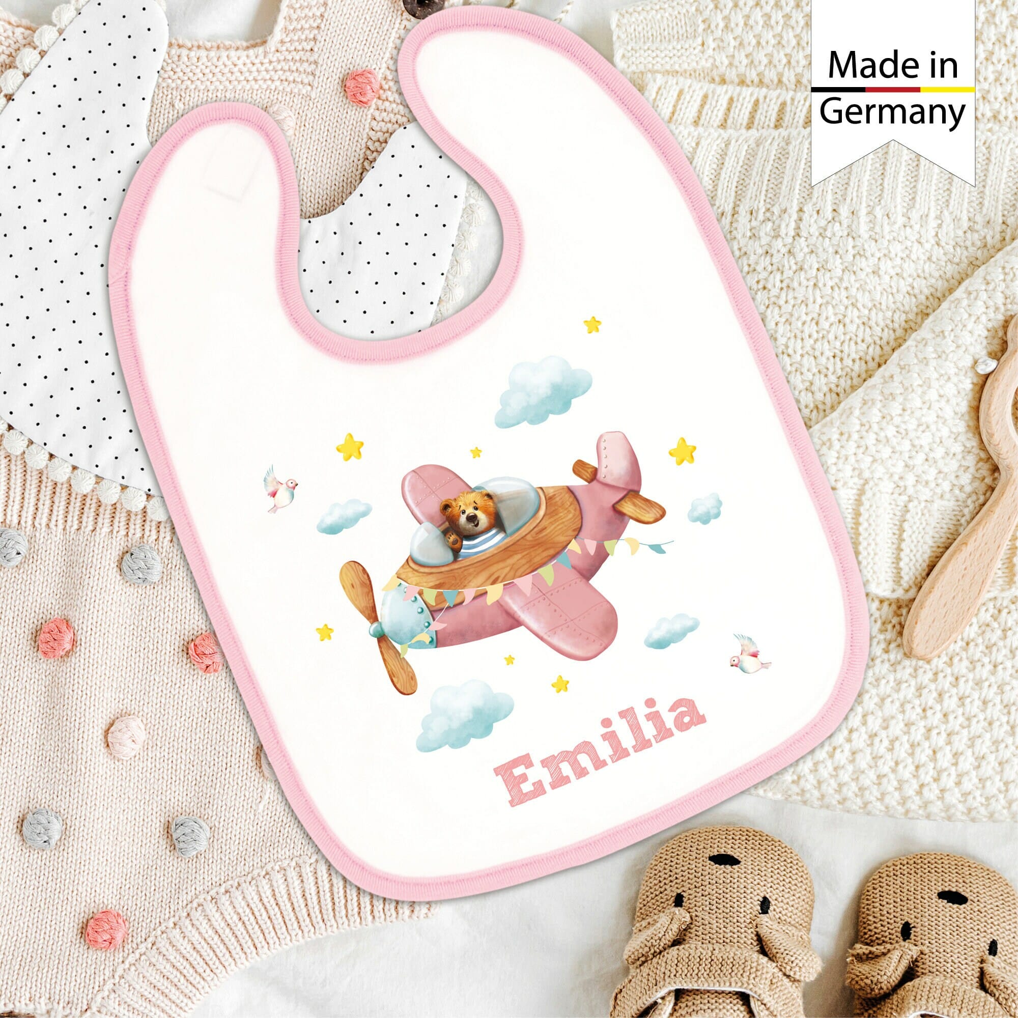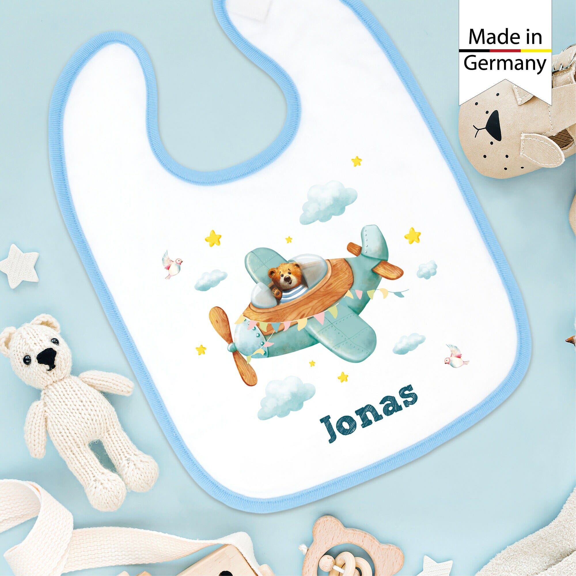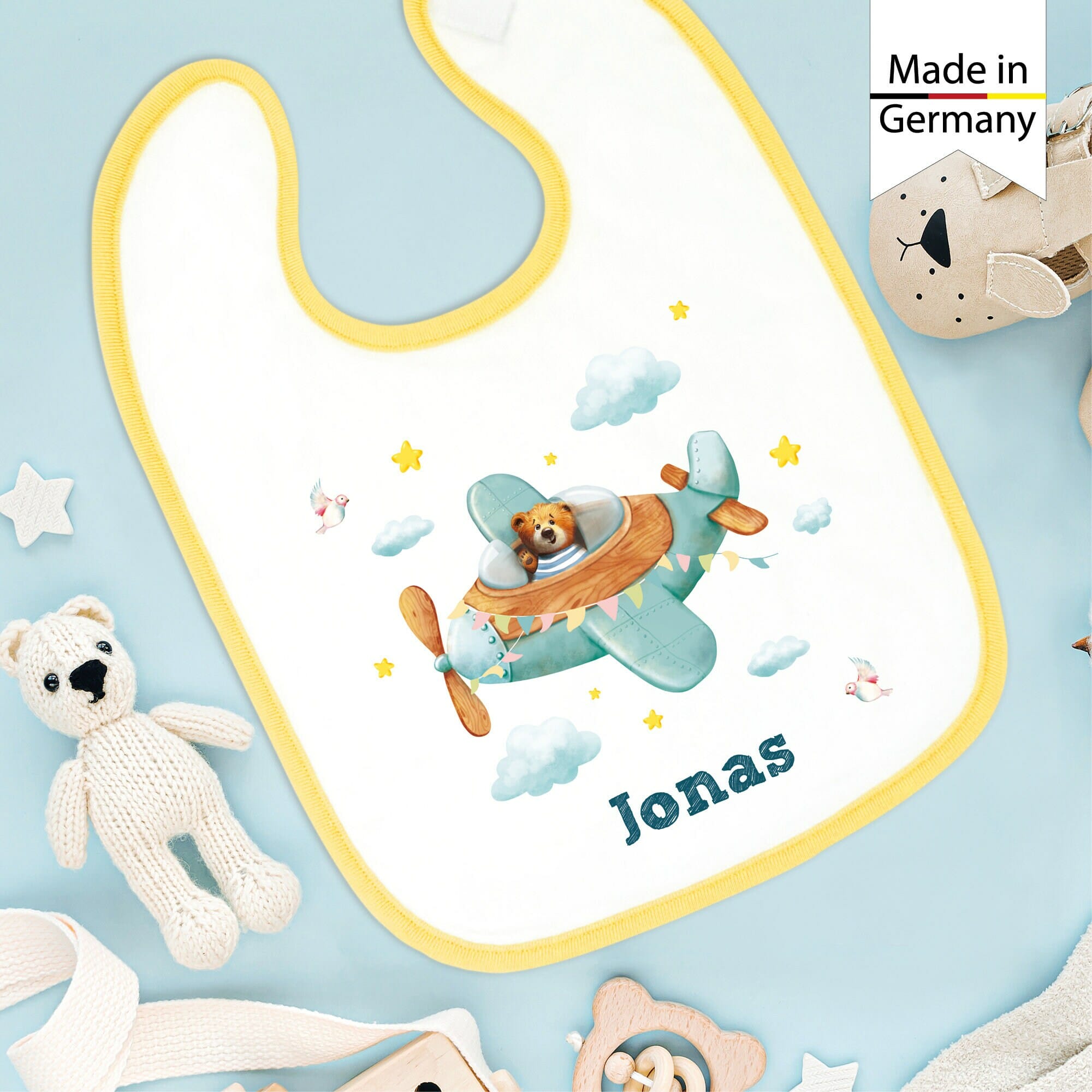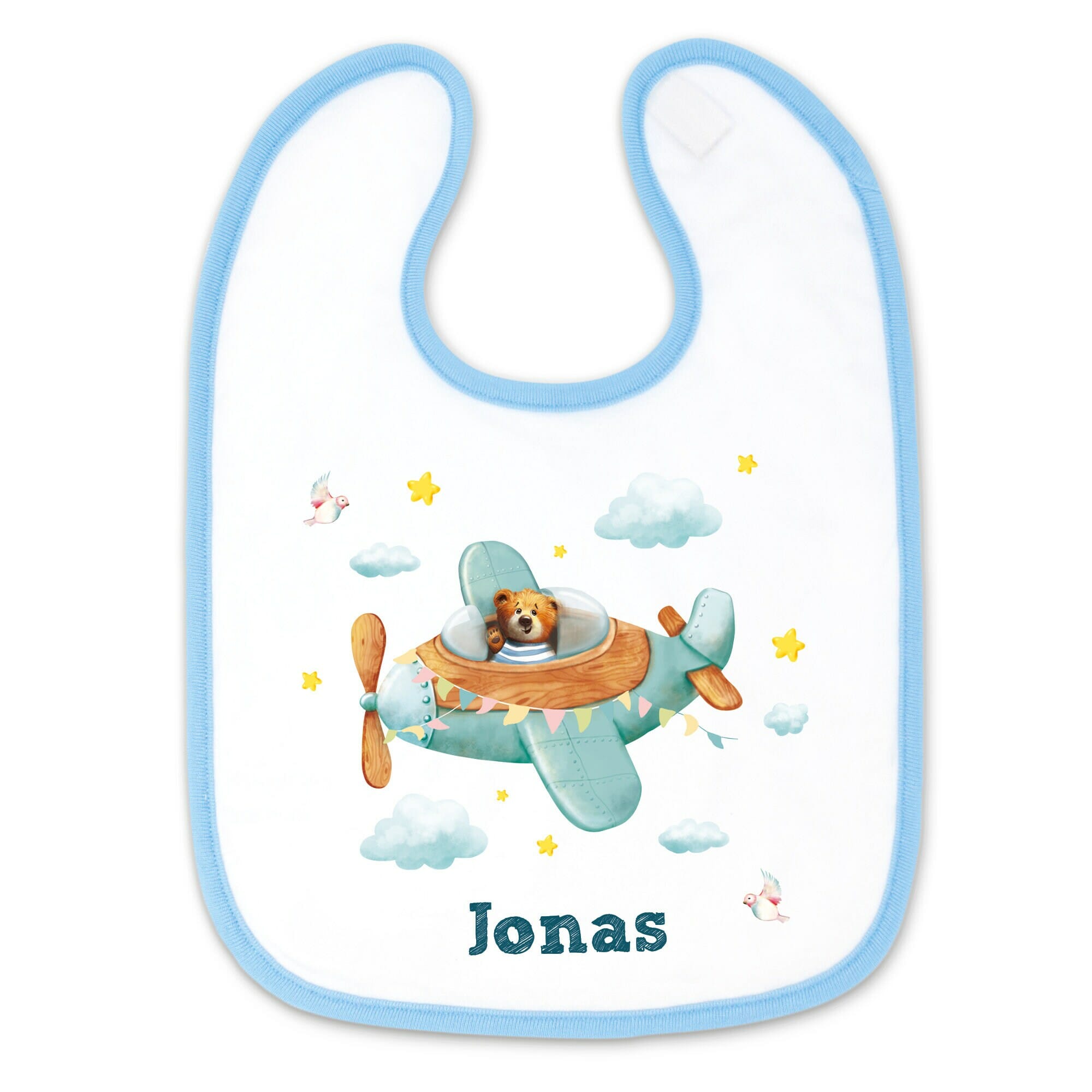 Bedrucktes Babylätzchen Flugzeug Bär Wolken mit Klettverschluss Wunschnamen Individuell Kinder Lätzchen Kleinkind