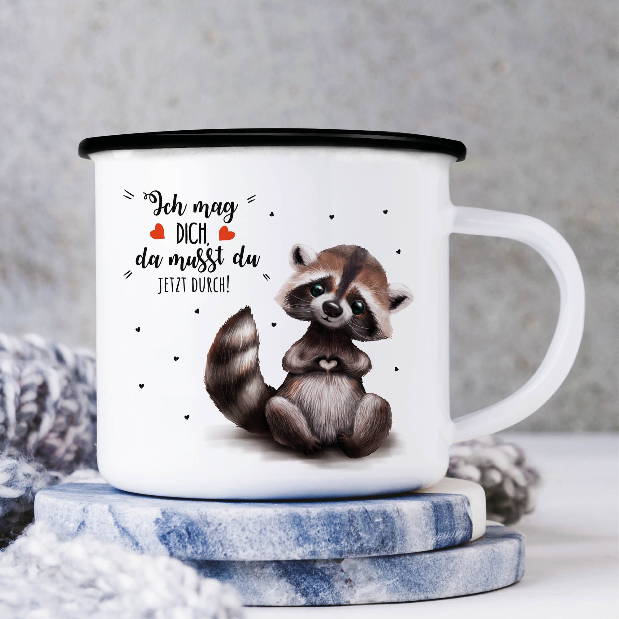 Emaille Campingbecher Waschbär Ich mag dich Da musst du jetzt durch Kaffeebecher Kindertasse Valentinstag