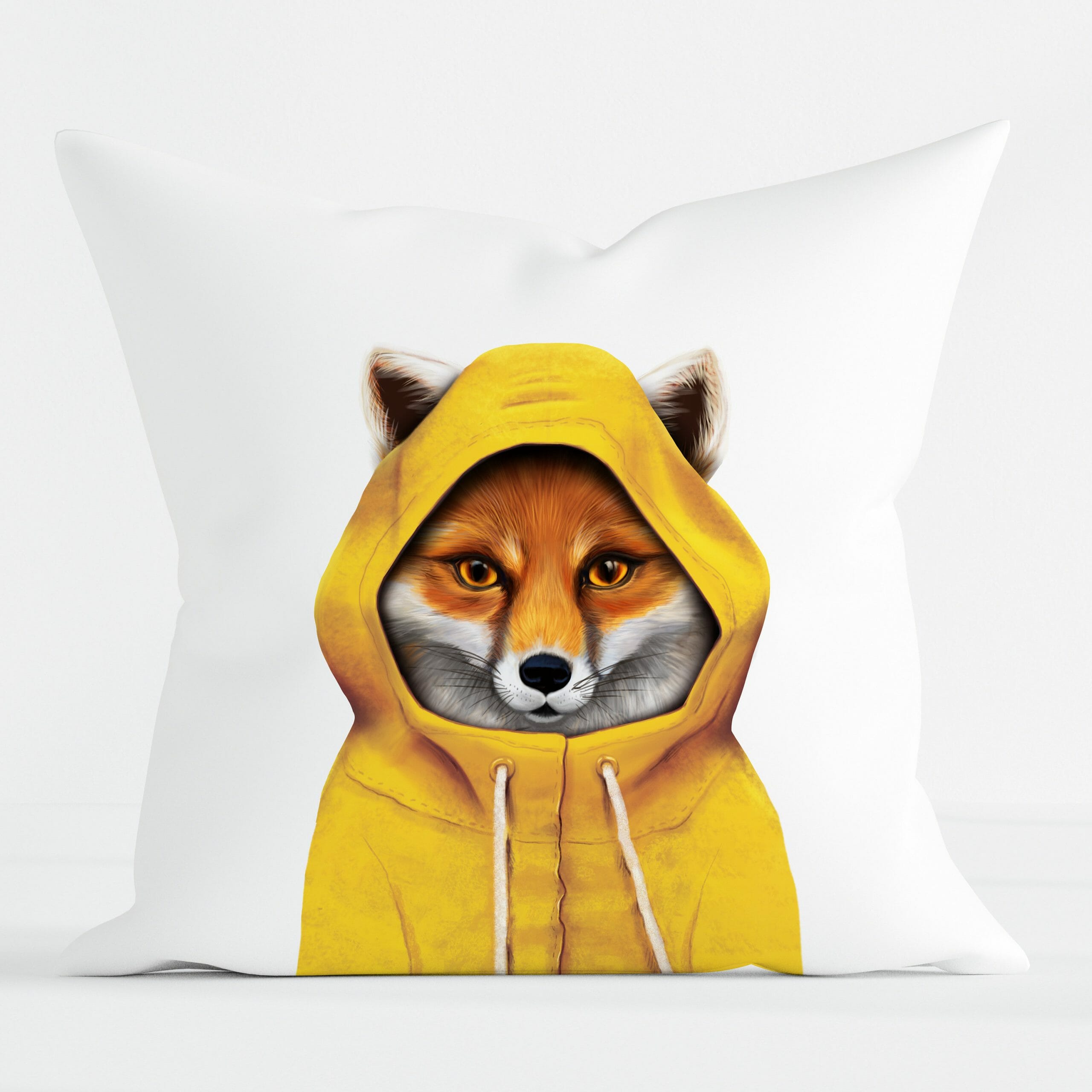 Kissen mit Fuchs im Regenmantel Aufdruck Fuchs Regen Geschenk gelbe Kaputze