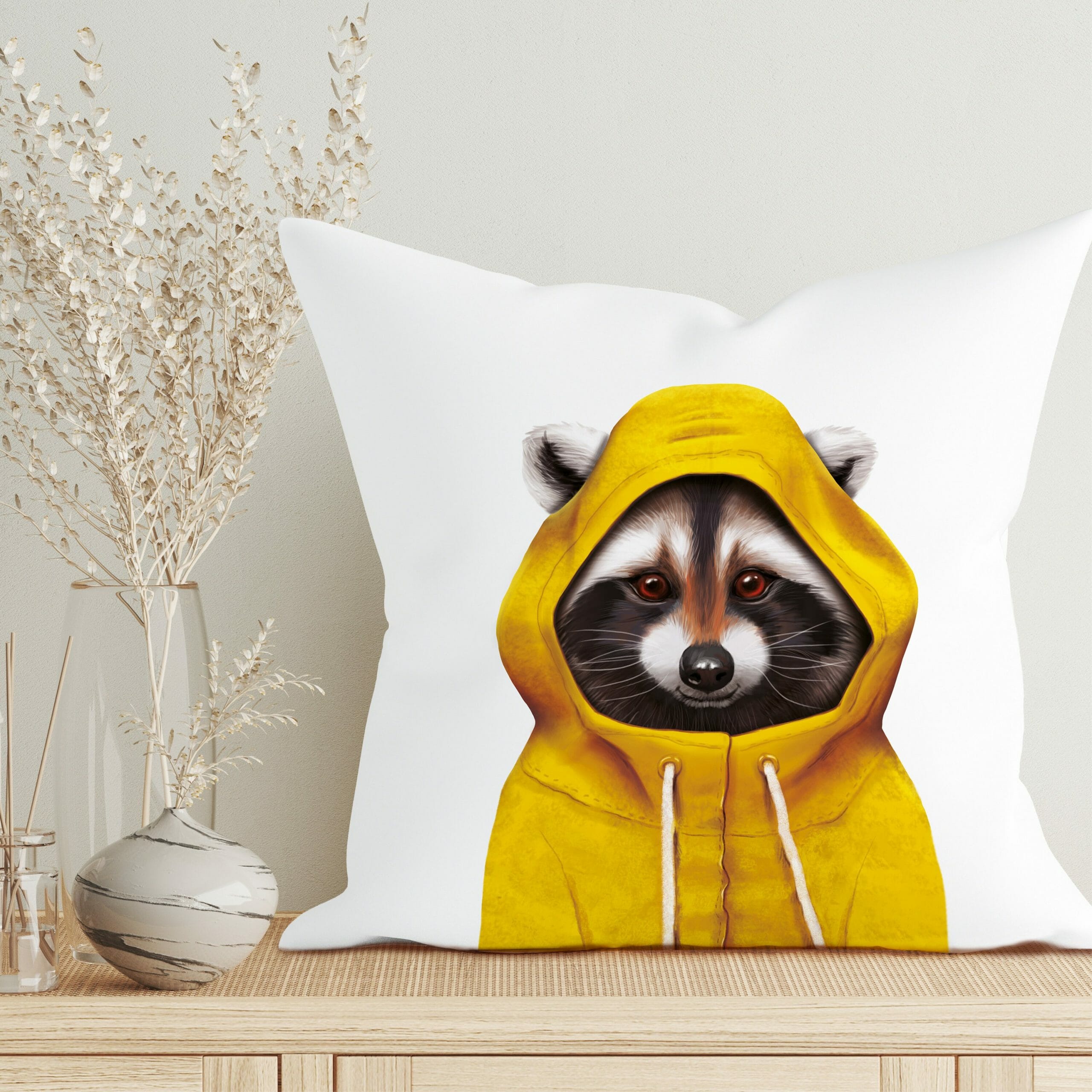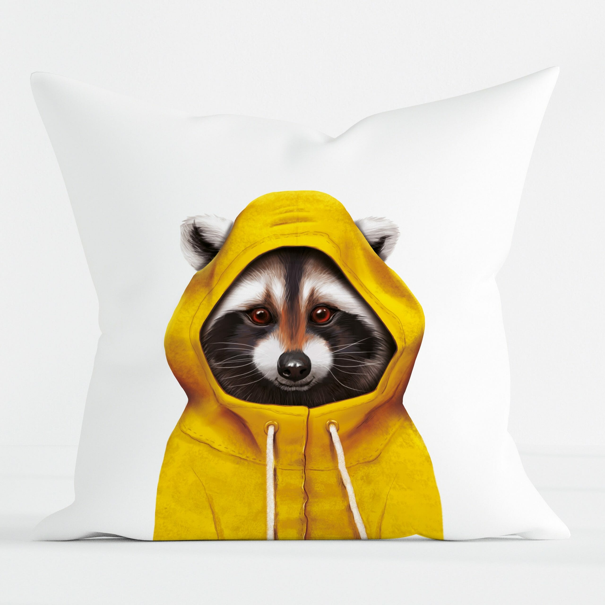 Kissen mit dem Aufdruck von einem Waschbär im Regenmantel