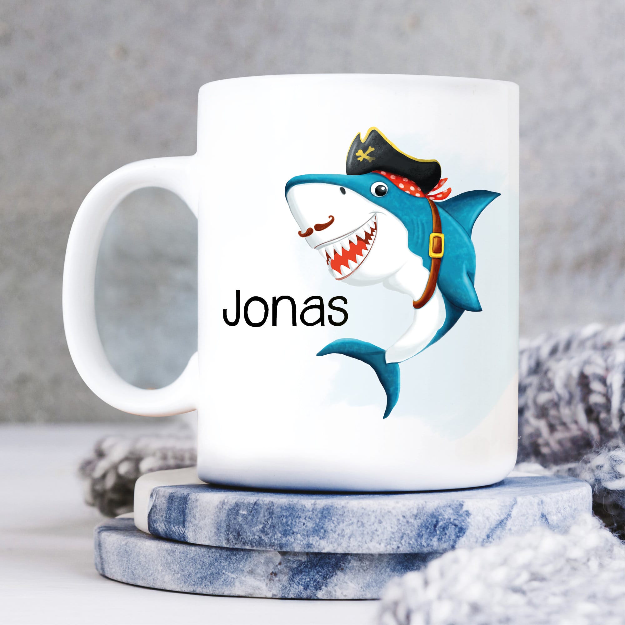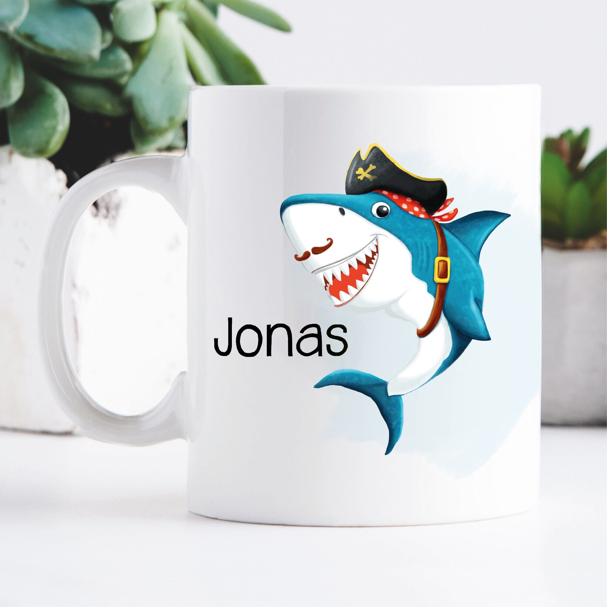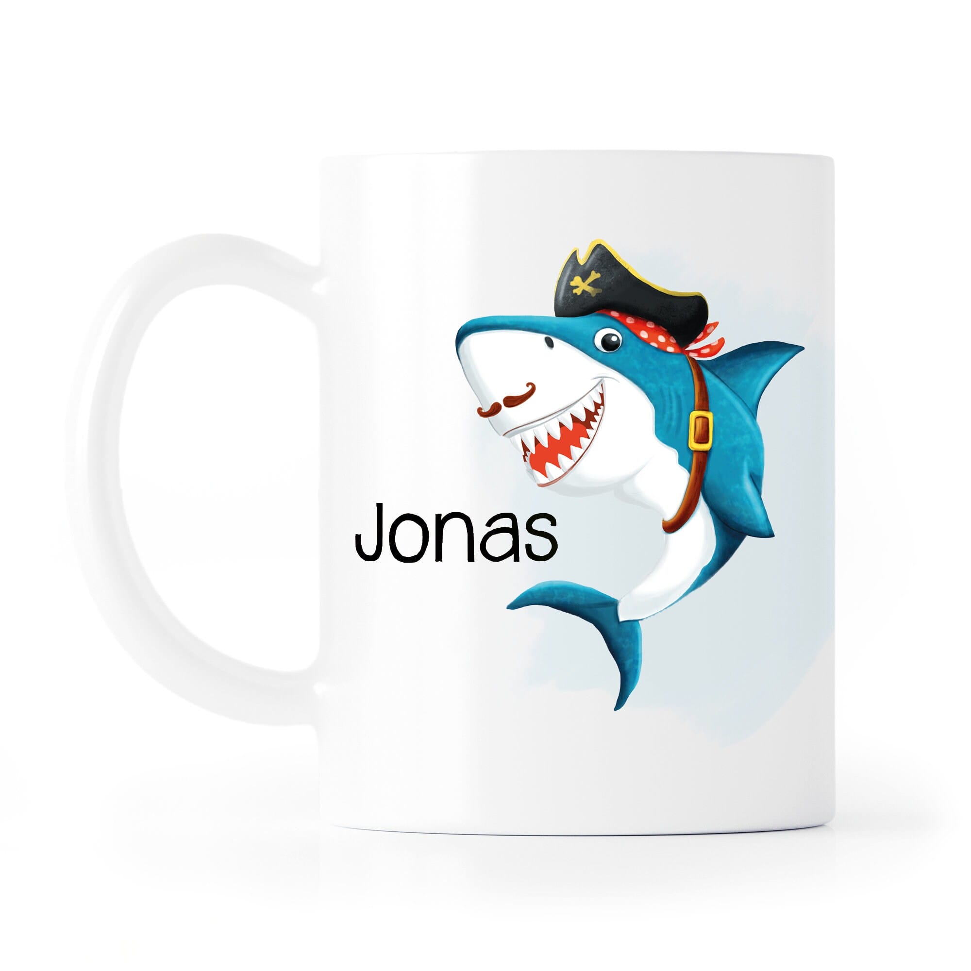Keramik Tasse bedruckt Hai Piratenhut personalisiert mit Wunschnamen Kaffeetasse Kaffeebecher 330 ml