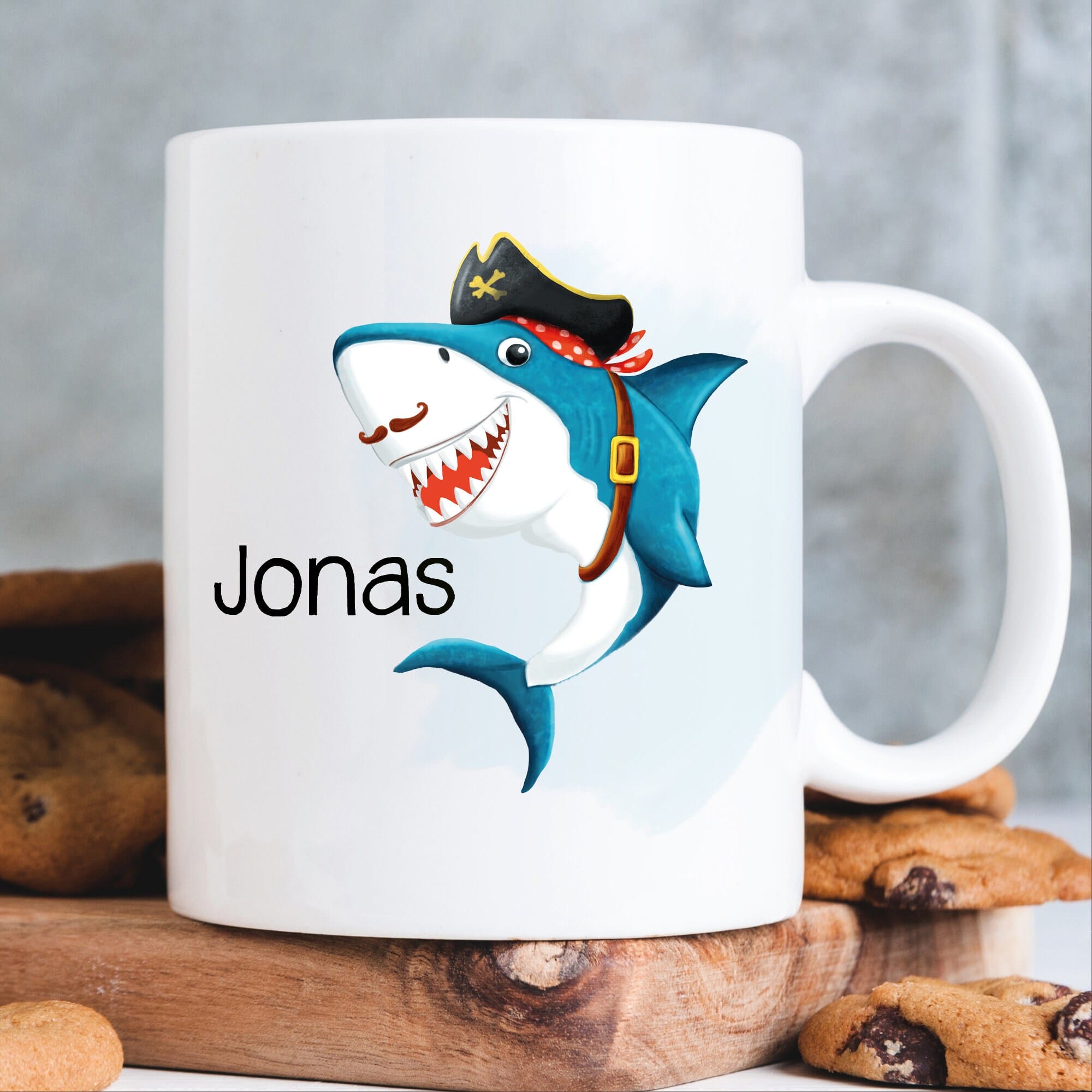 Tasse bedruckt mit einem Hai mit Piratenhut, Geburtstagsgeschenk