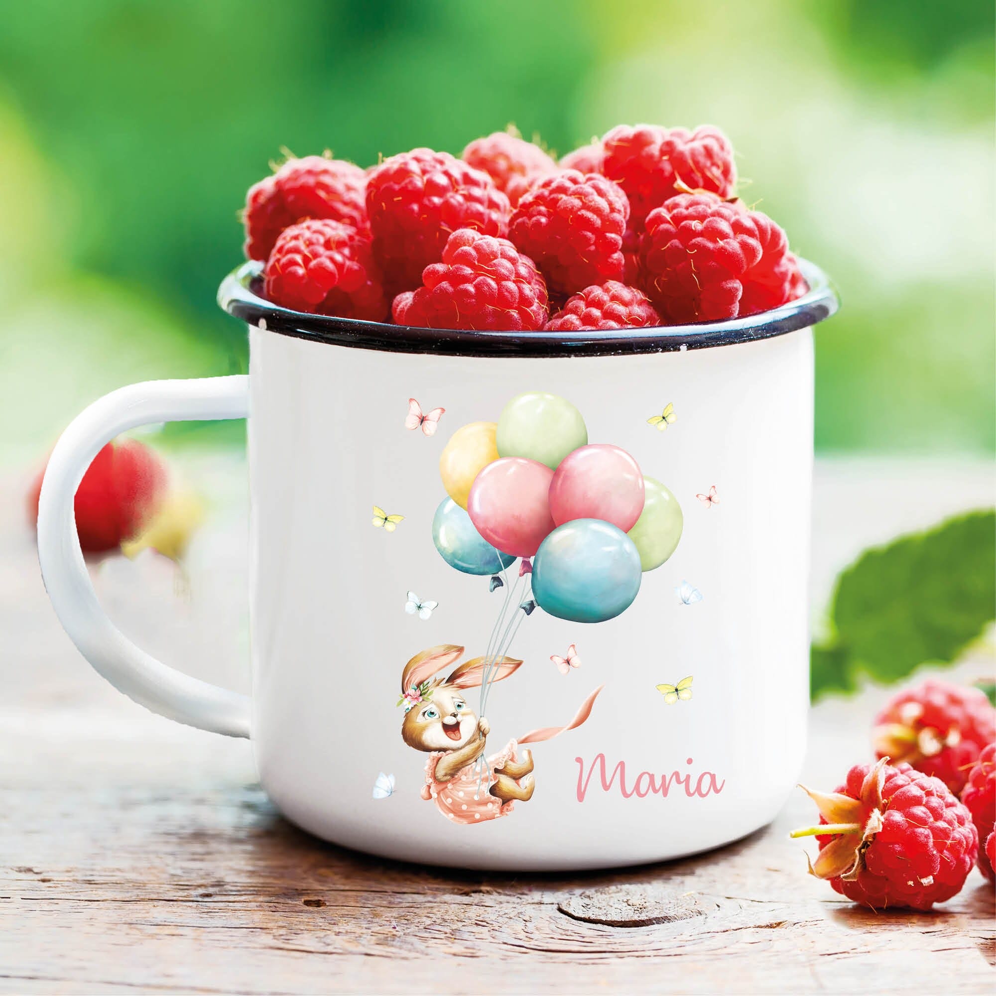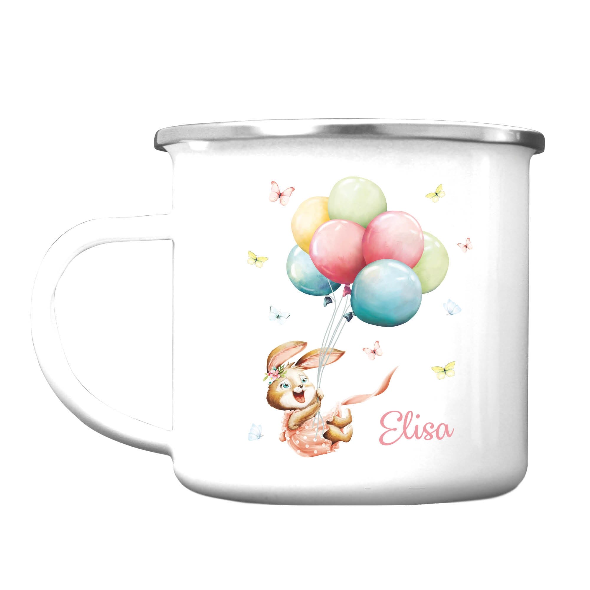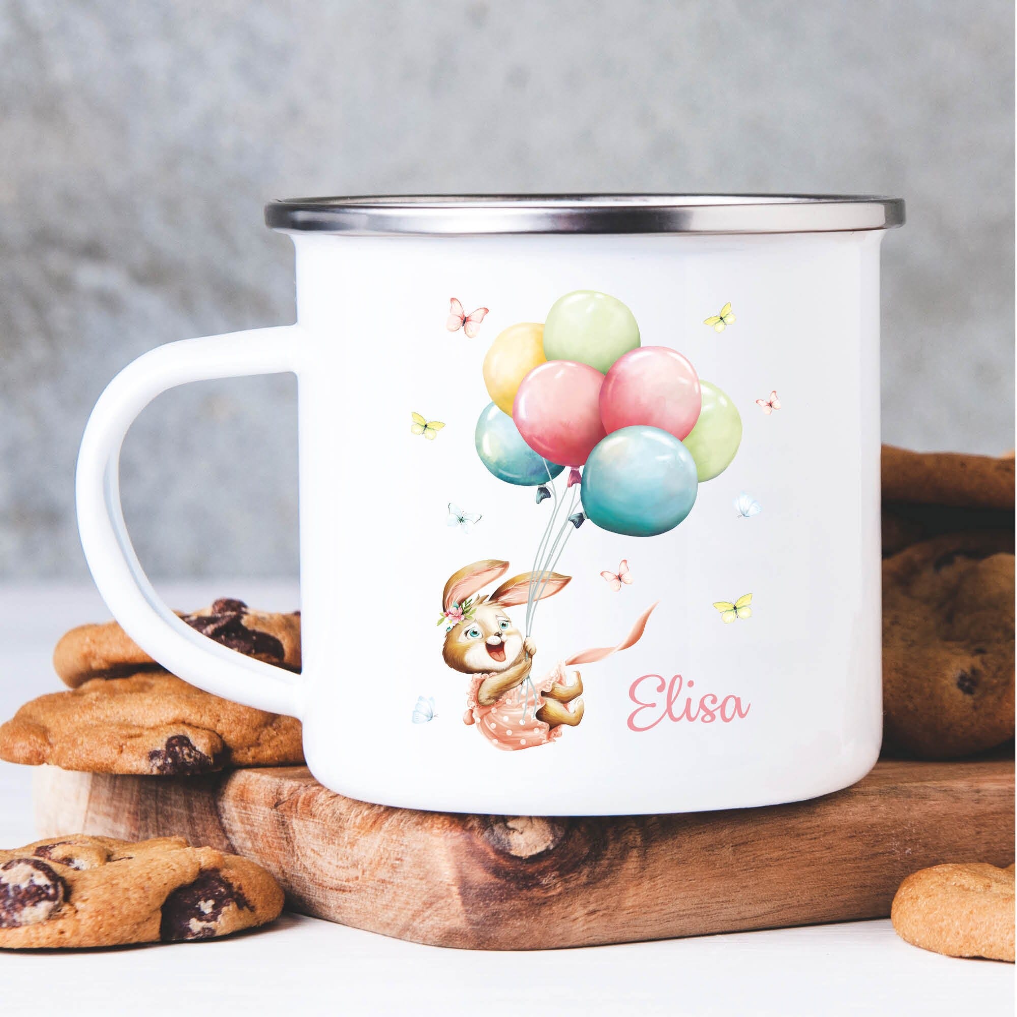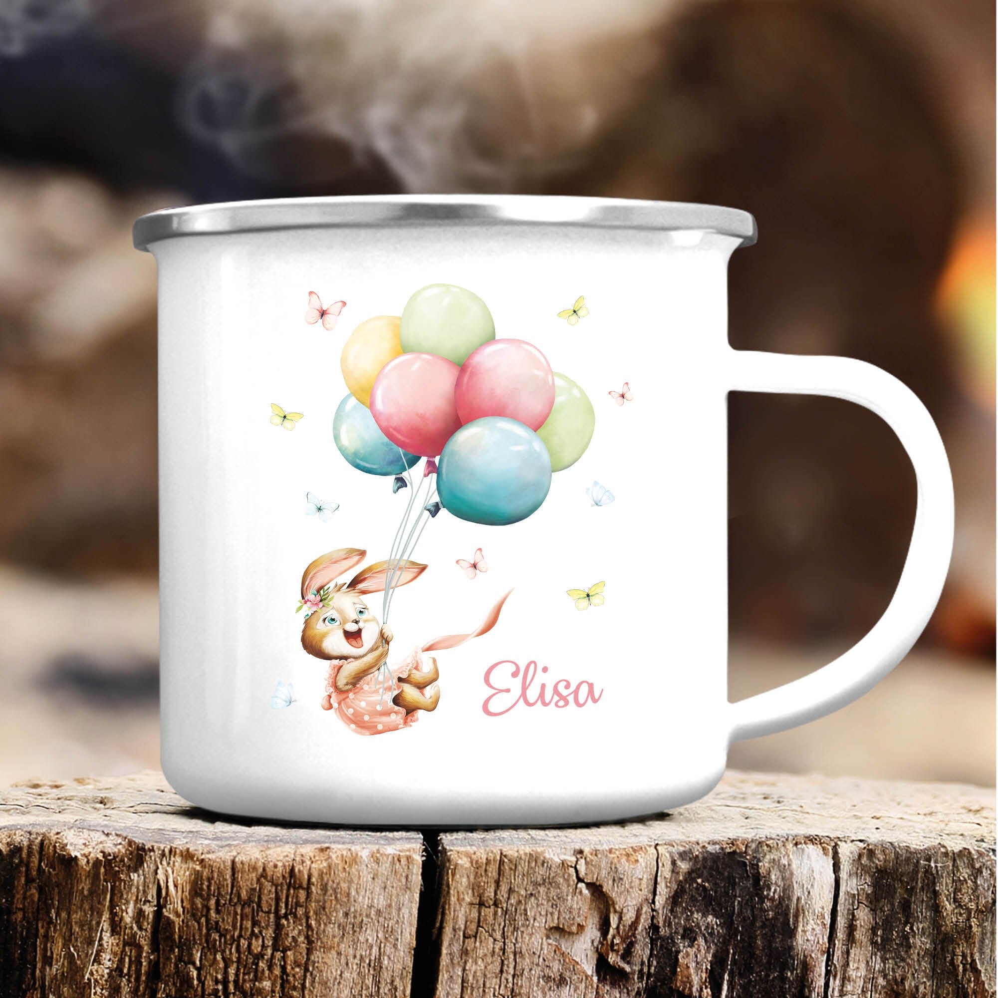 Kindertasse Campingbecher Emaille Hase mit Luftballons Geschenk Geburtstag personalisiert mit Wunschnamen, Einschulungsgeschenk