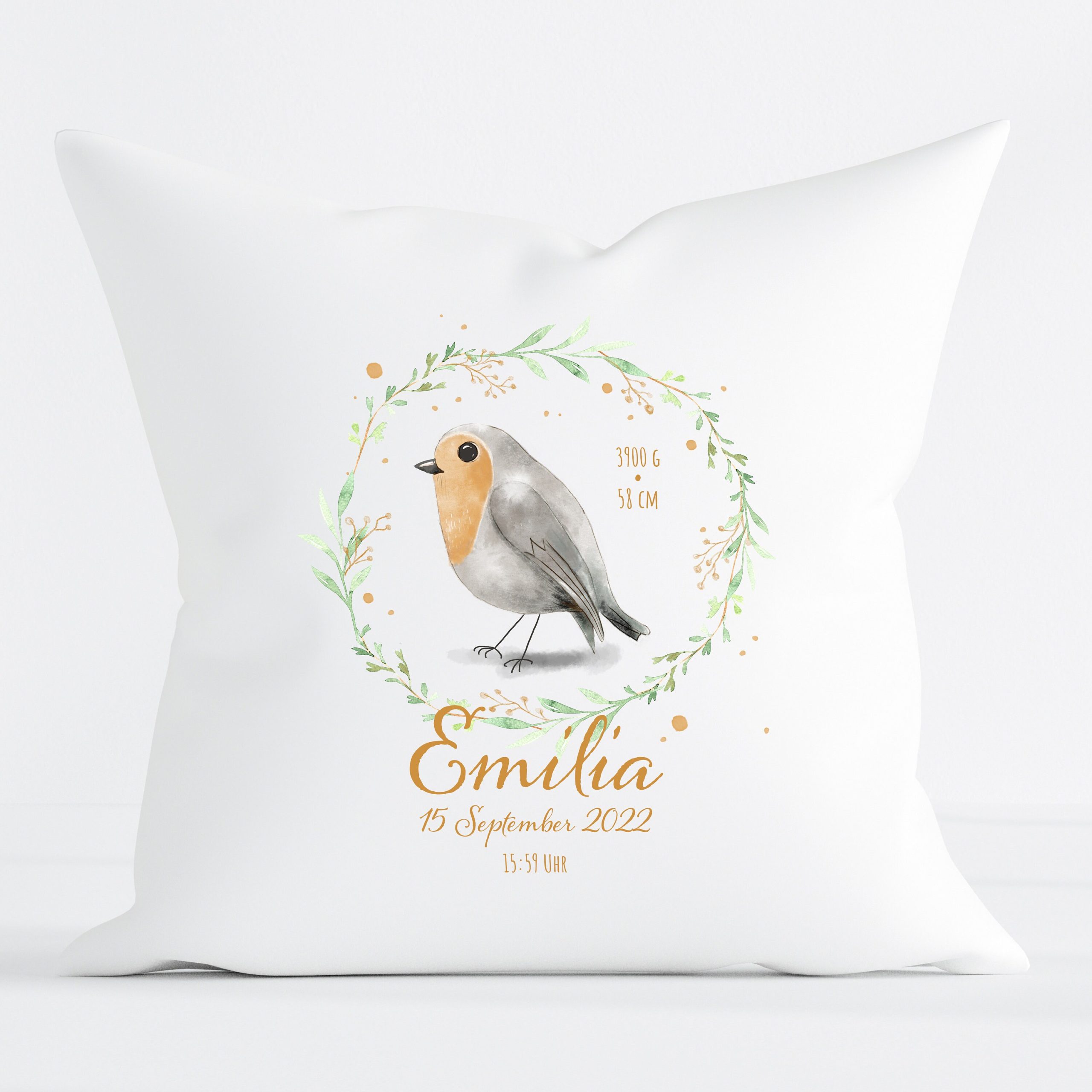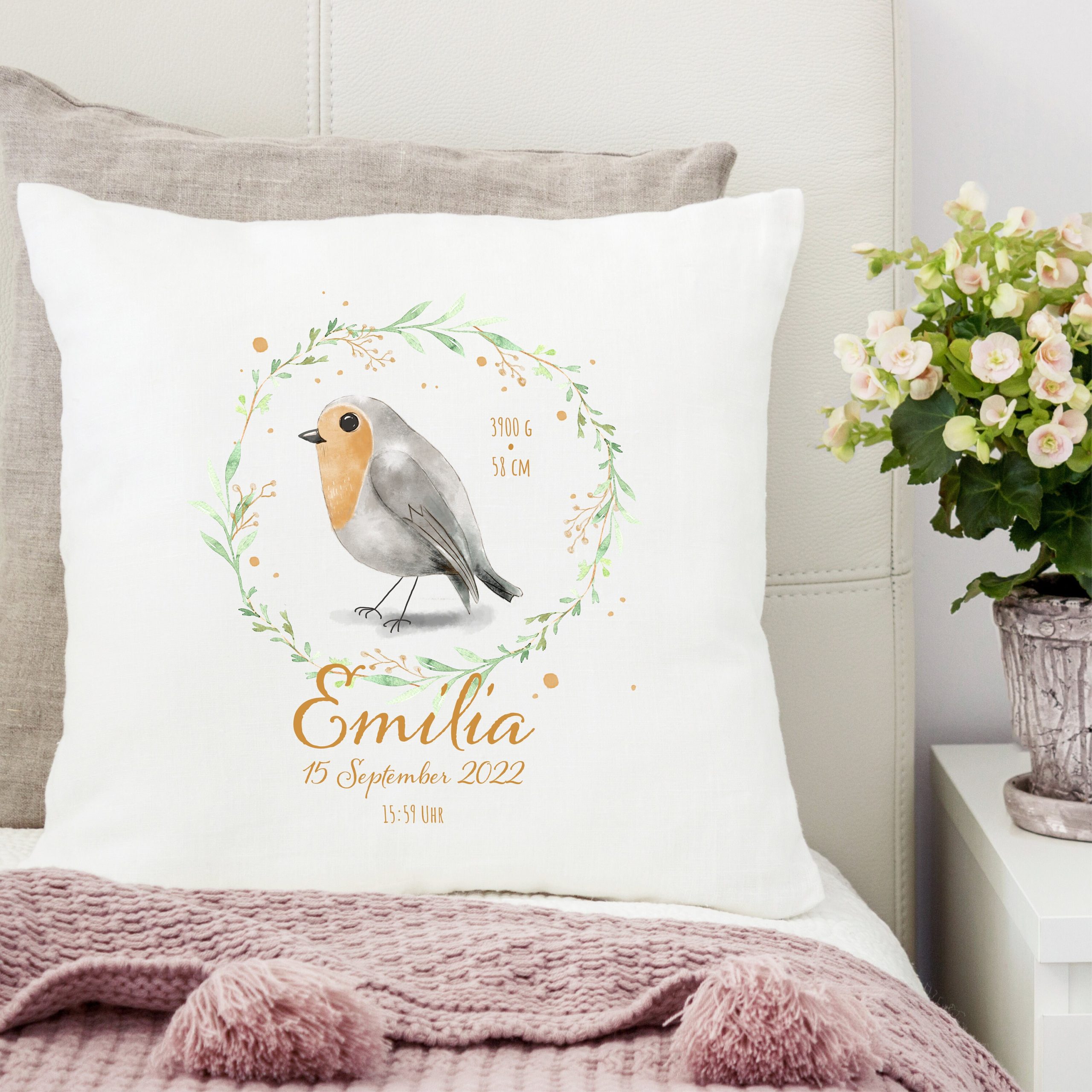 Kissen Geburt mit einem Vogel und Blätterkranz, Geschenk zur Geburt personalisiertes Geburtskissen mit Namen, Datum, Uhrzeit, Größe und Gewicht