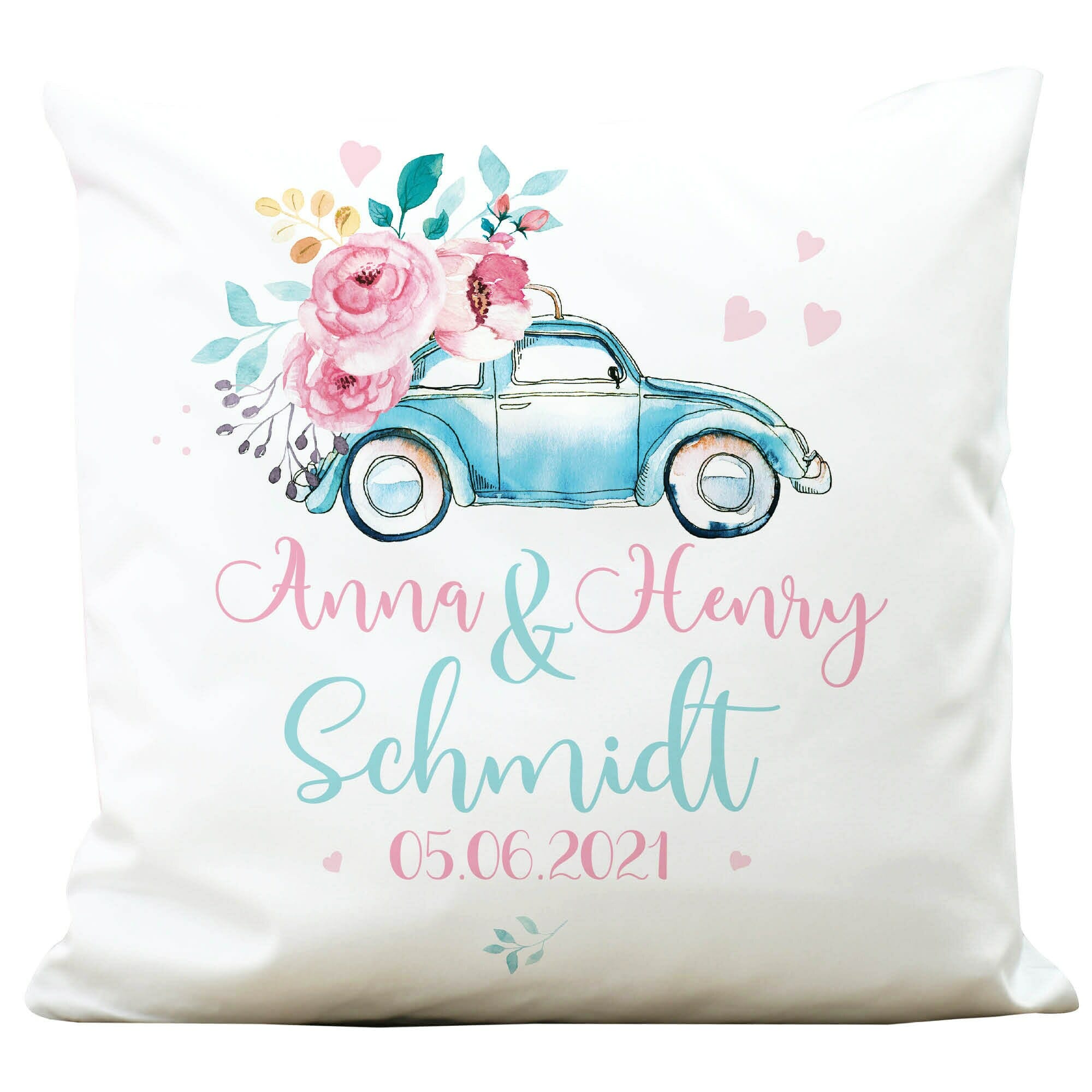 Kissen Hochzeit Auto Käfer Blumen Geschenk personalisiert mit Name und Datum, Hochzeitsgeschenk