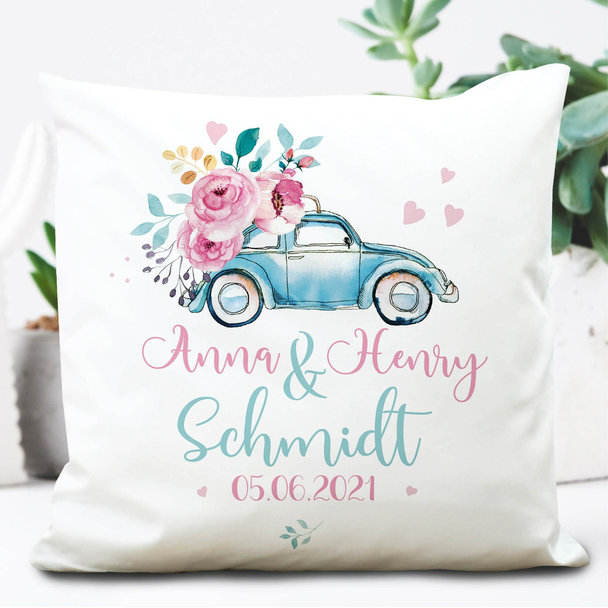 Kissen Hochzeit Auto Käfer Blumen Geschenk personalisiert mit Name und Datum Hochzeitsgeschenk