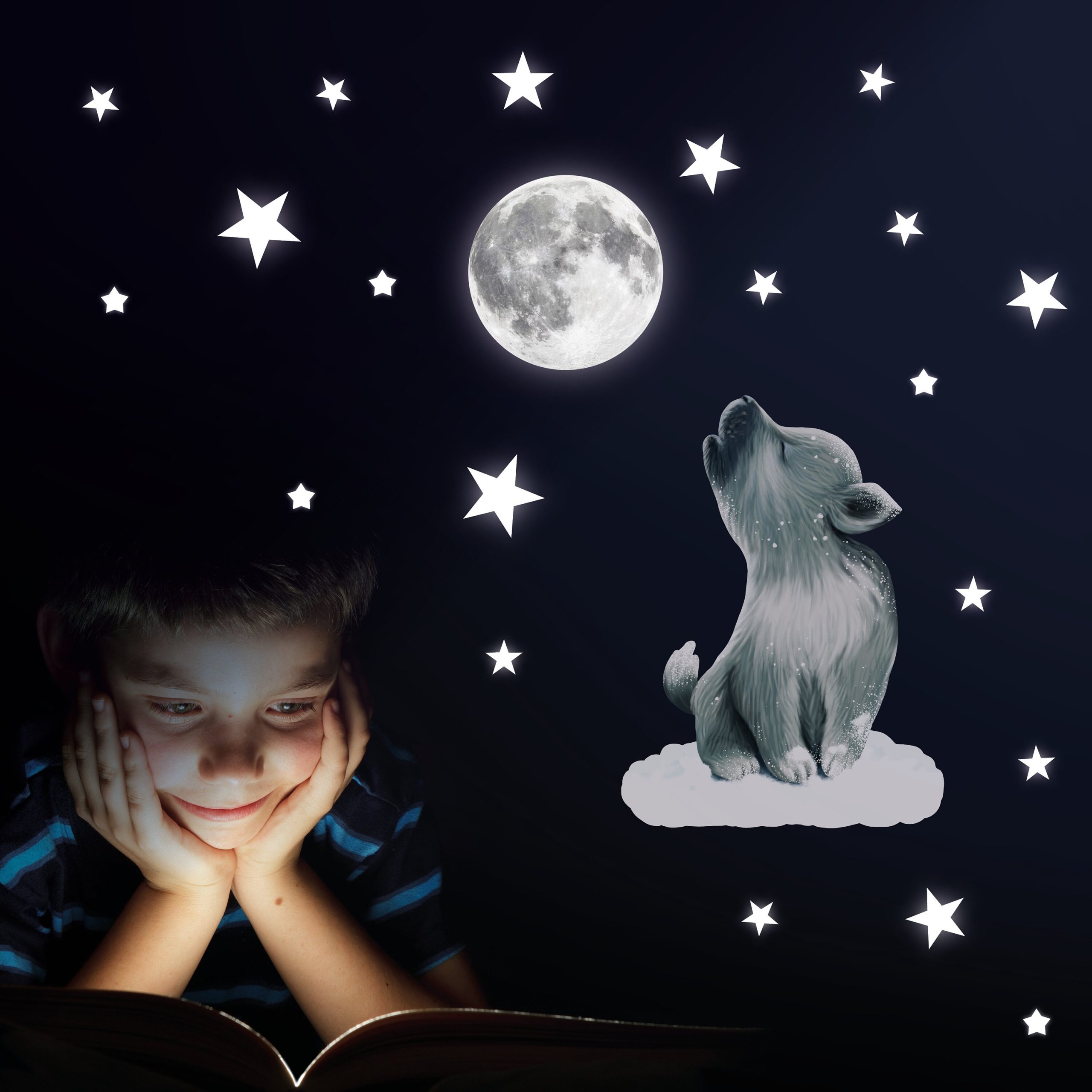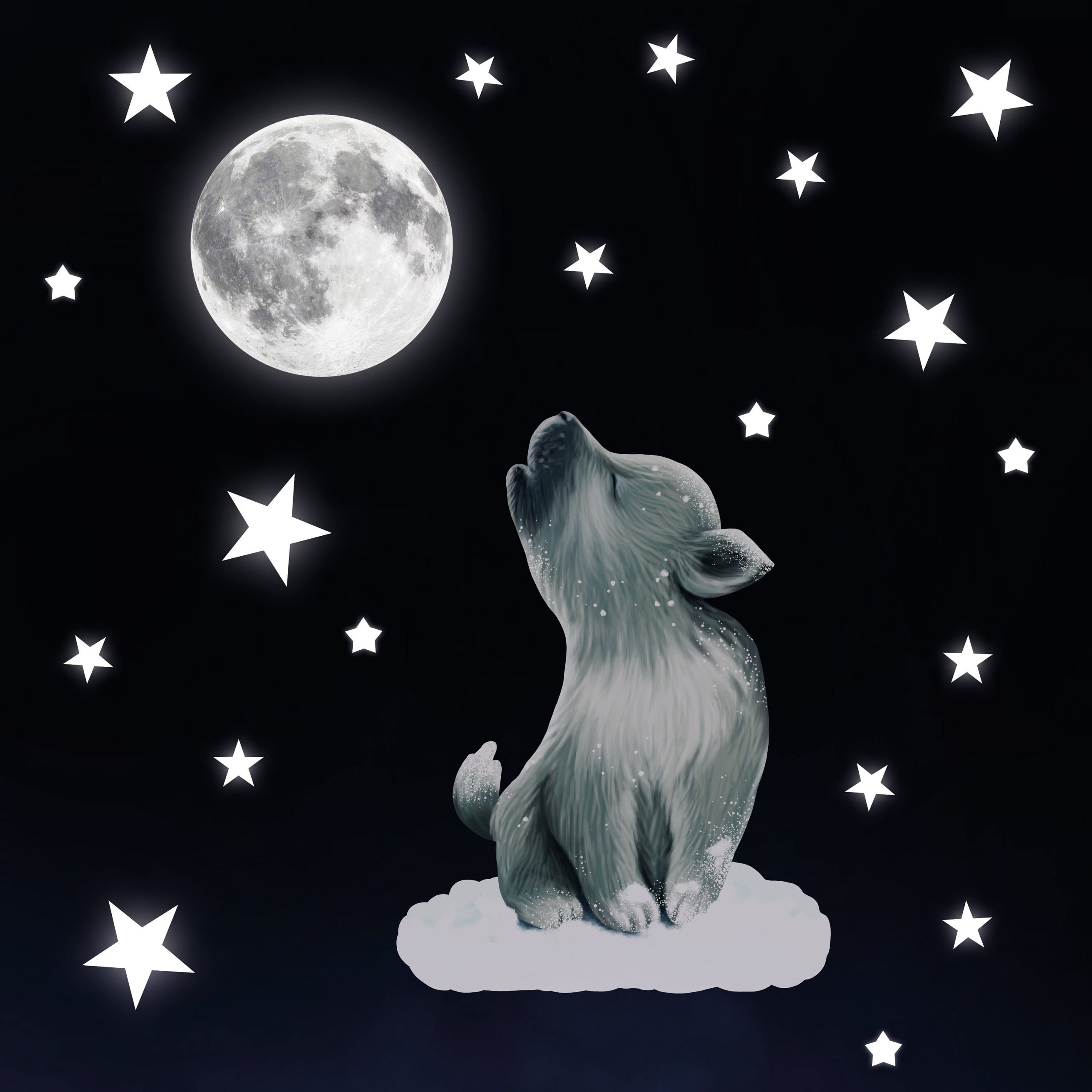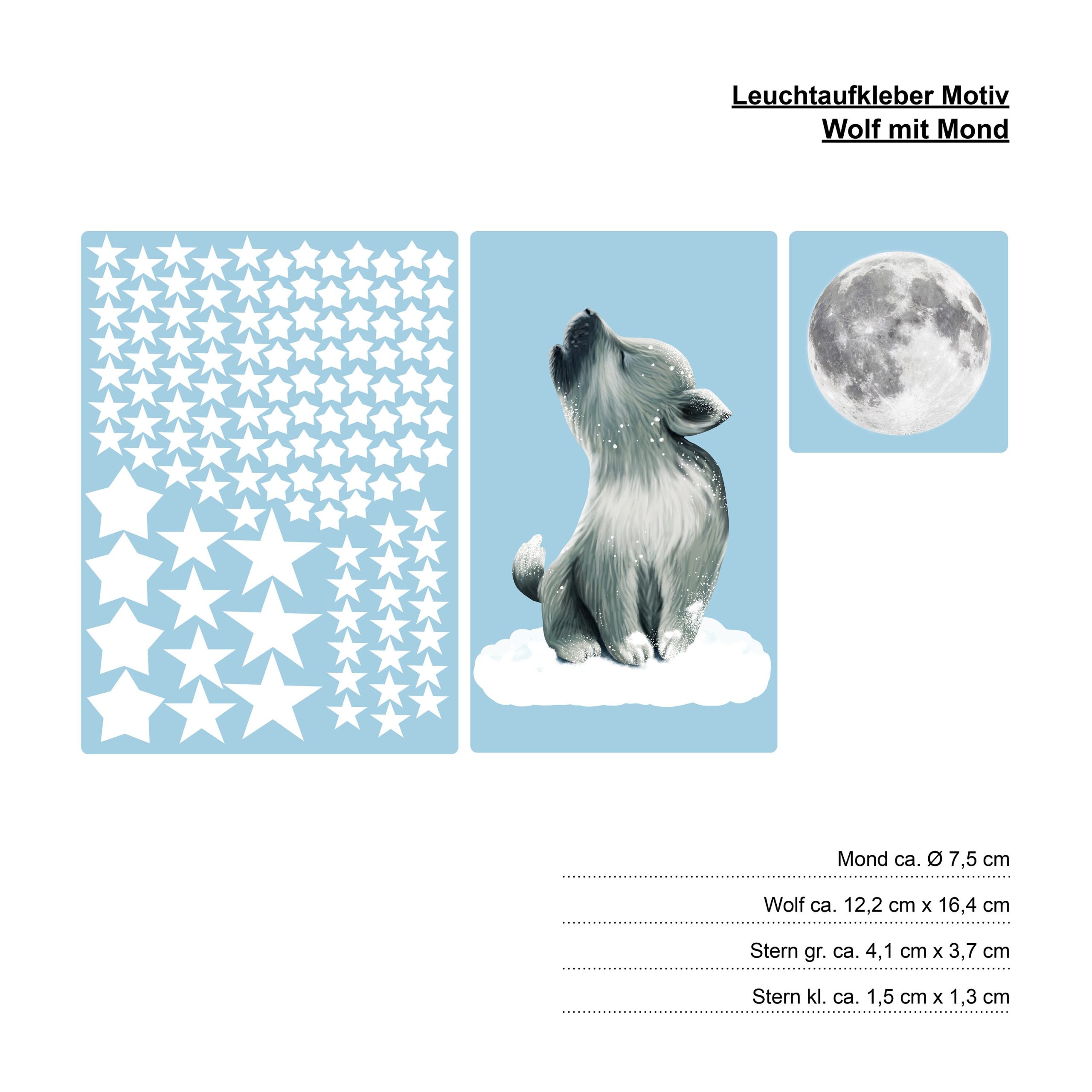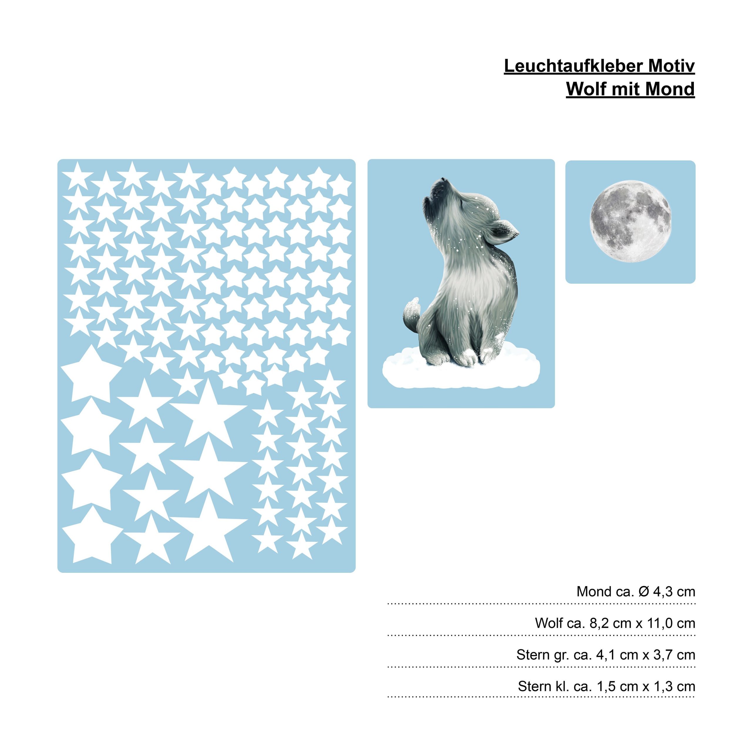 Leuchtaufkleber kleiner Wolf mit Mond, leuchtend und fluoreszierende Sterne, leuchten im Dunklen