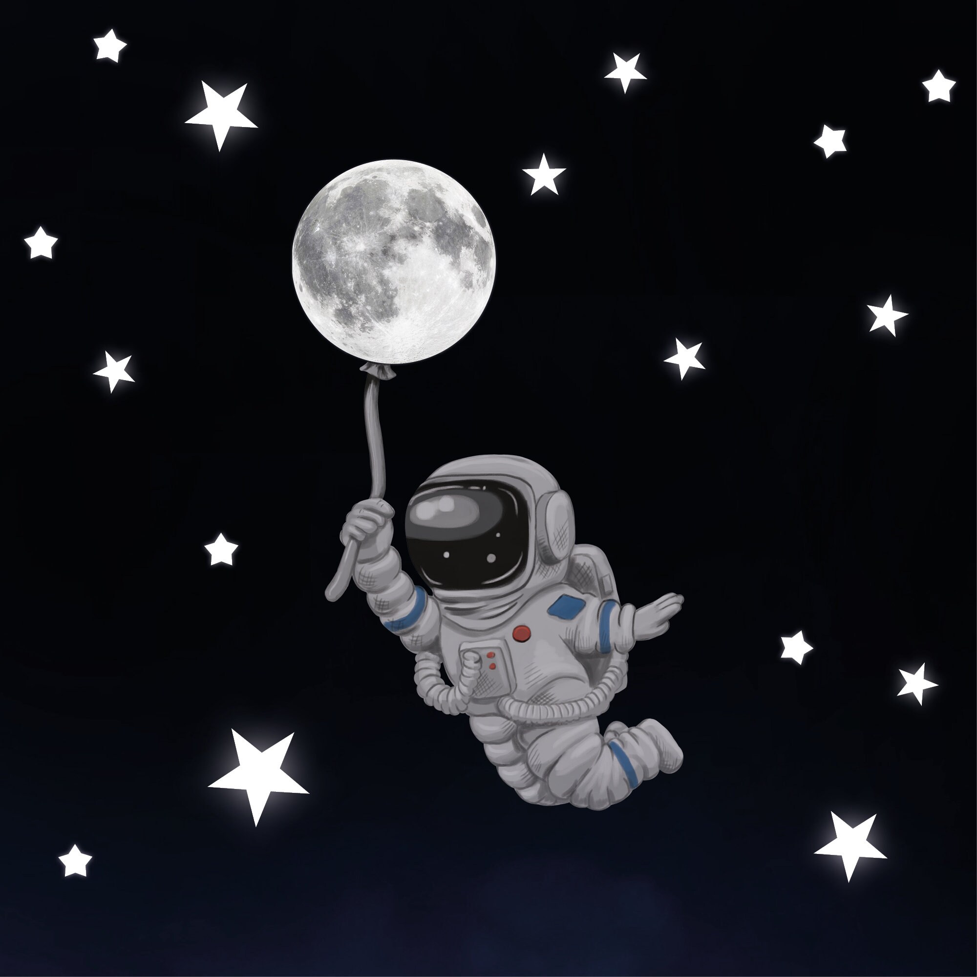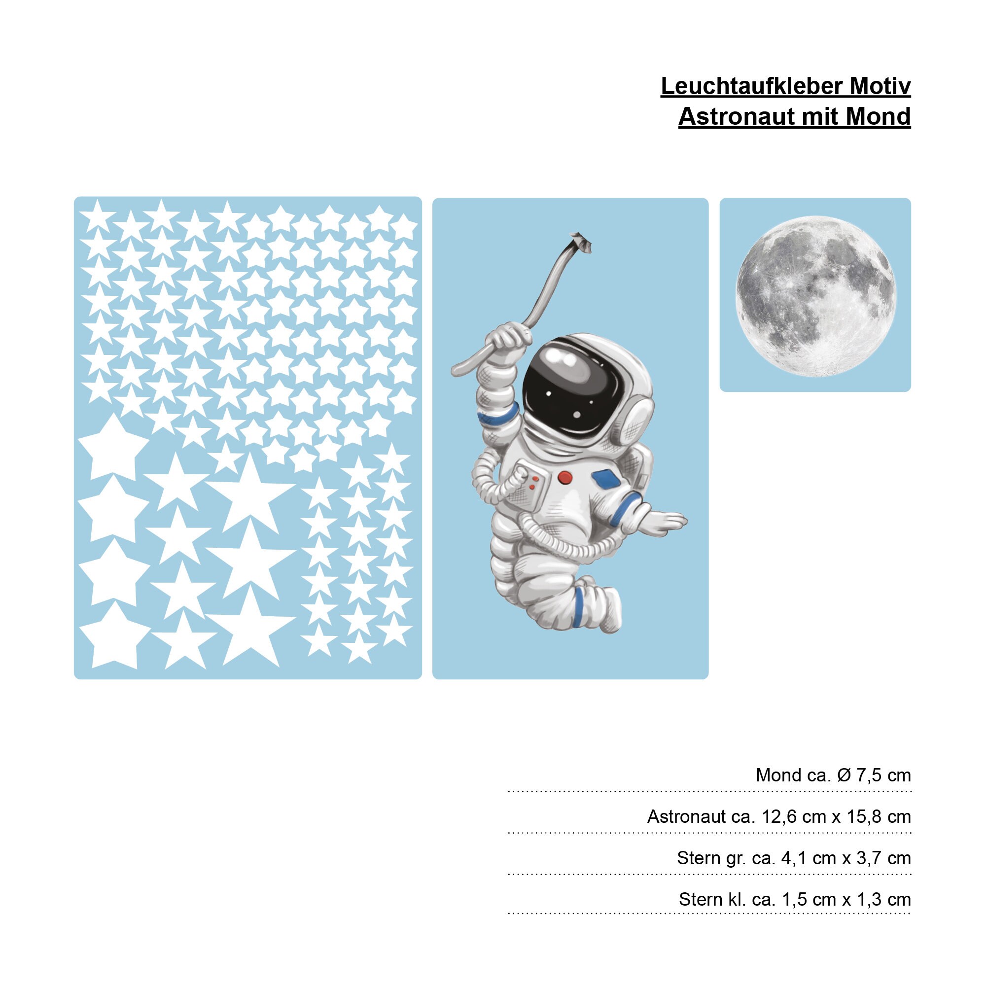 Leuchtaufkleber schwebender Astronaut Mond Weltall, leuchtende und fluoreszierende Sterne, leuchten im Dunklen