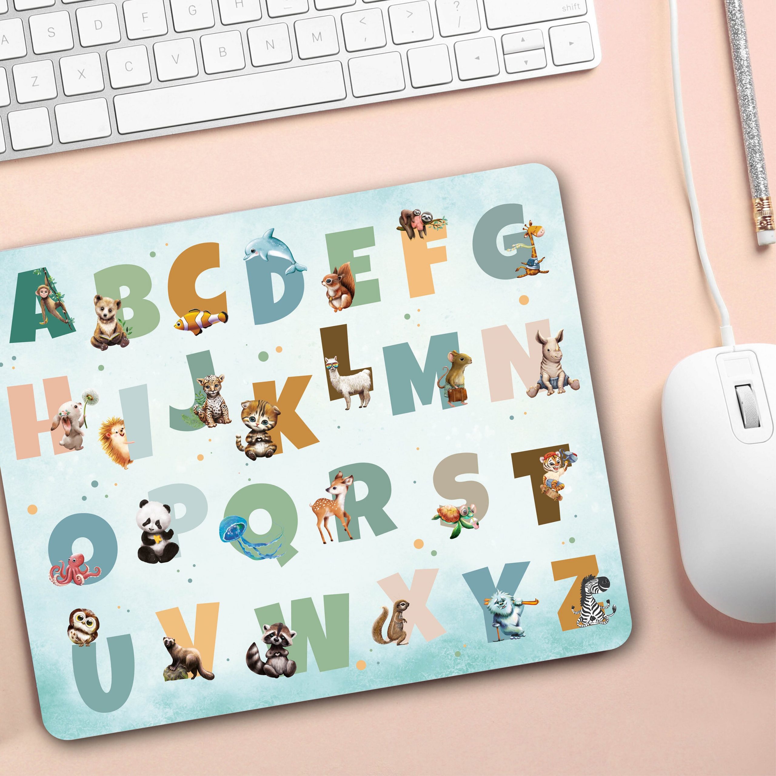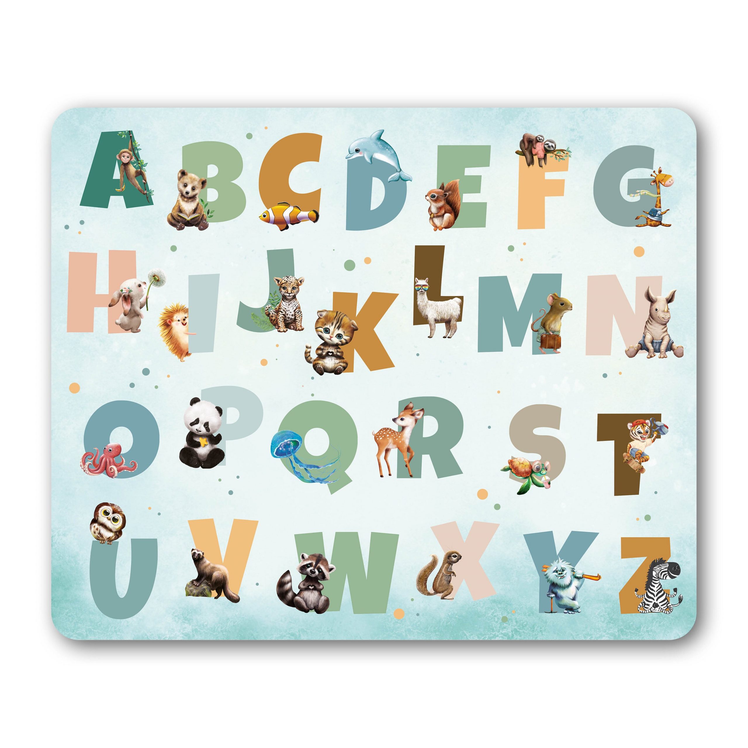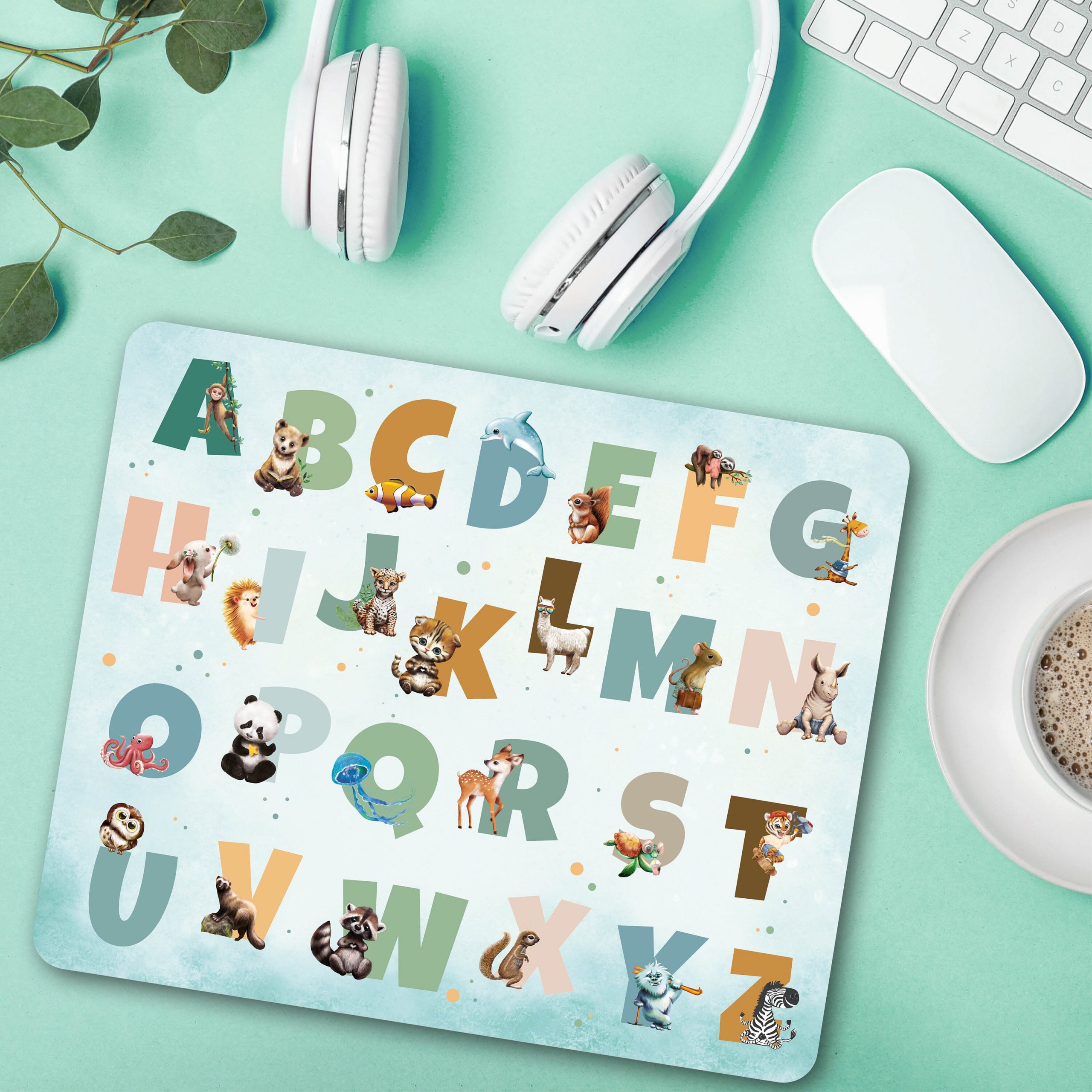 Mauspad Mousepad Büro Alphabet und Tiere, Geschenk Geburtstag, Einschulungsgeschenk