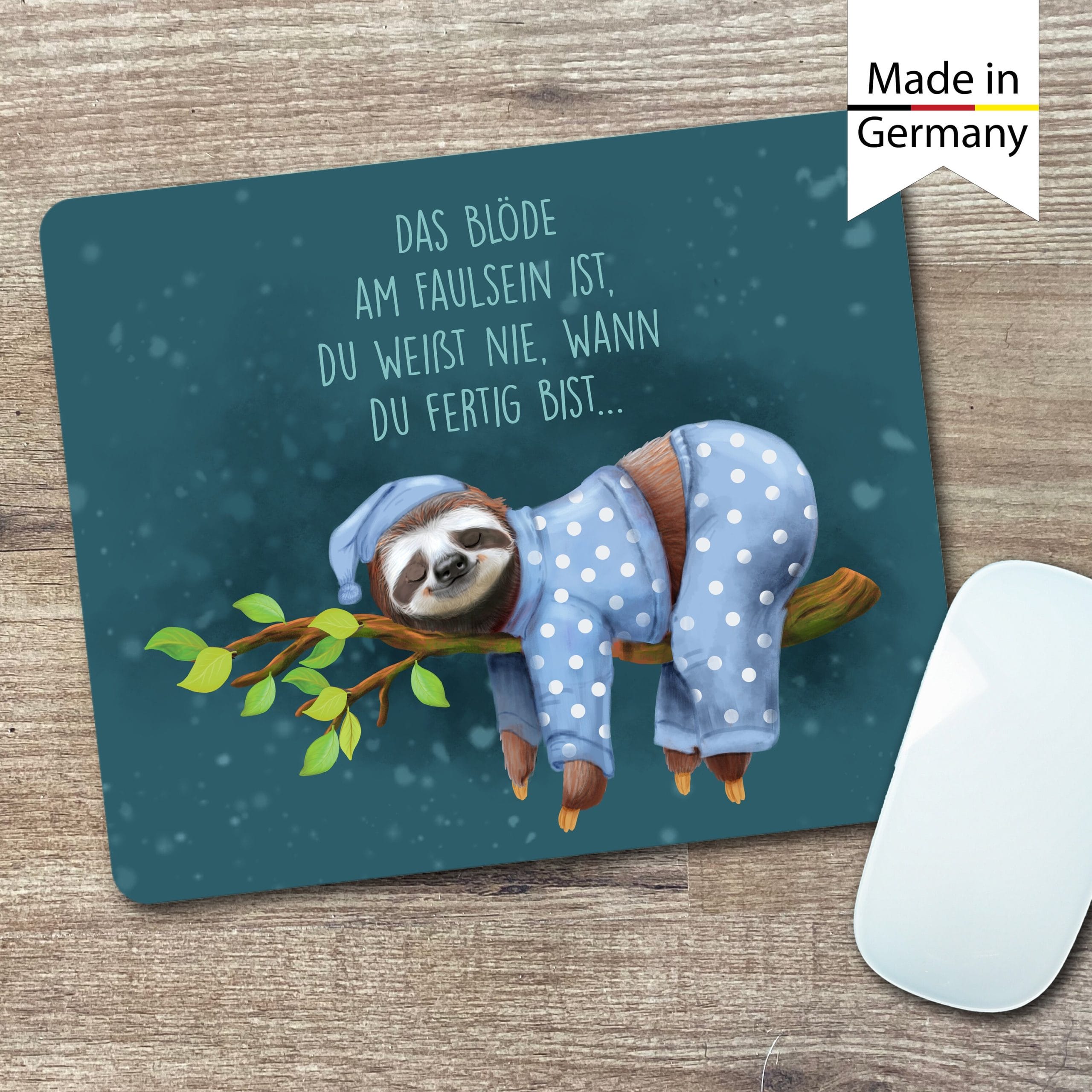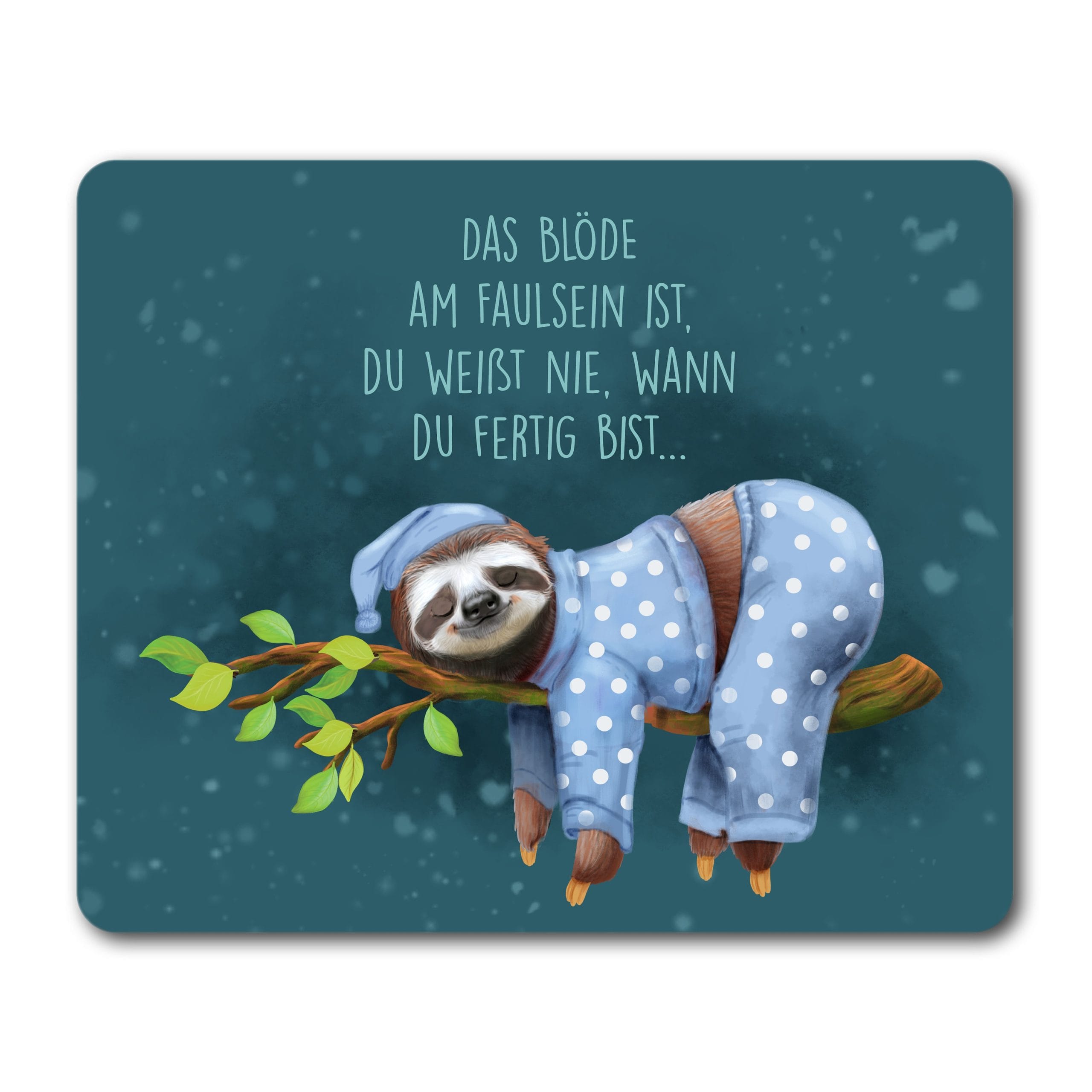 Mauspad Mousepad Faultier auf Ast mit Spruch “Das Blöde am Faulsein ist, Du weißt nie, wann Du fertig bist”
