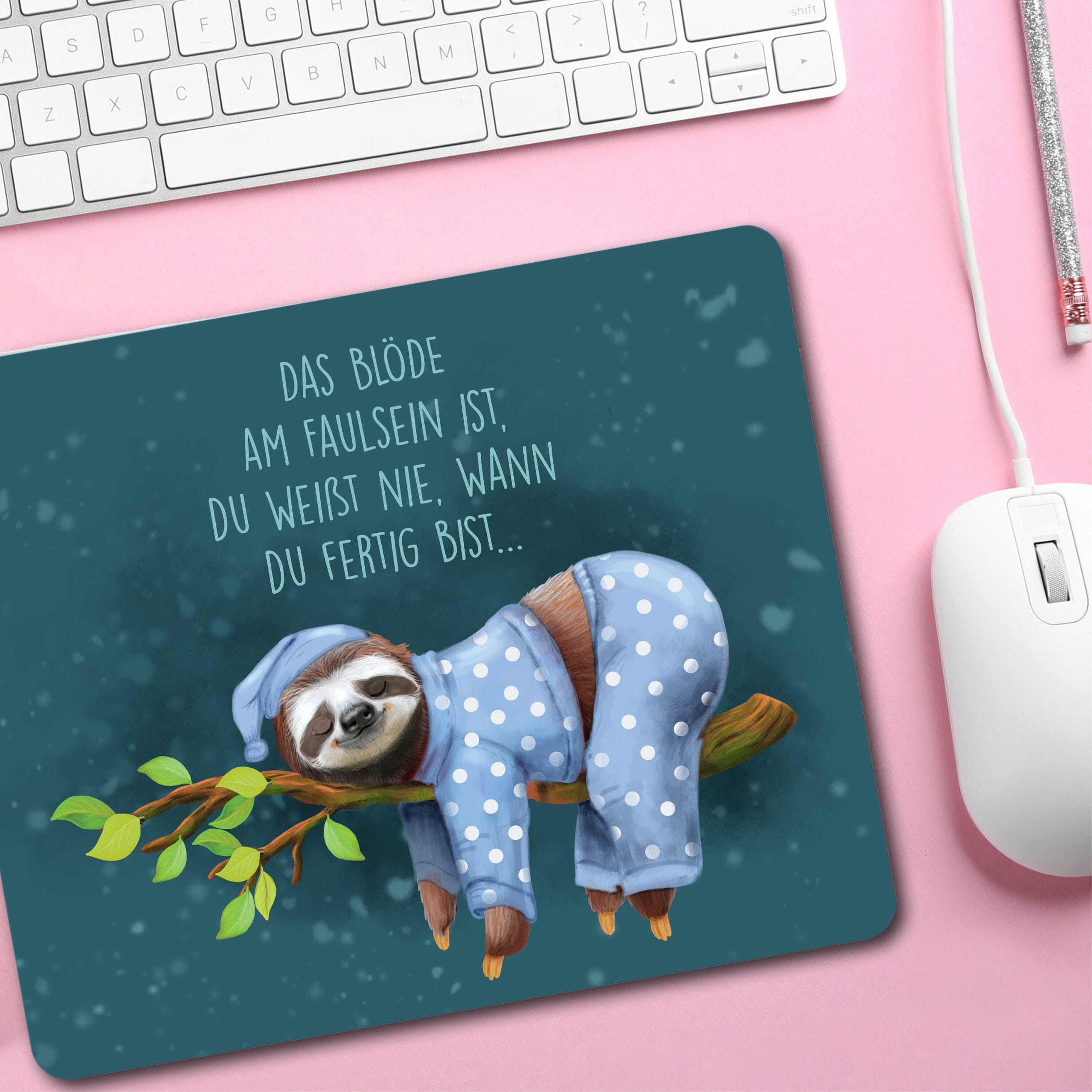 Mauspad Mousepad Faultier auf Ast mit Spruch Faul sein Geschenk Schreibtischunterlage