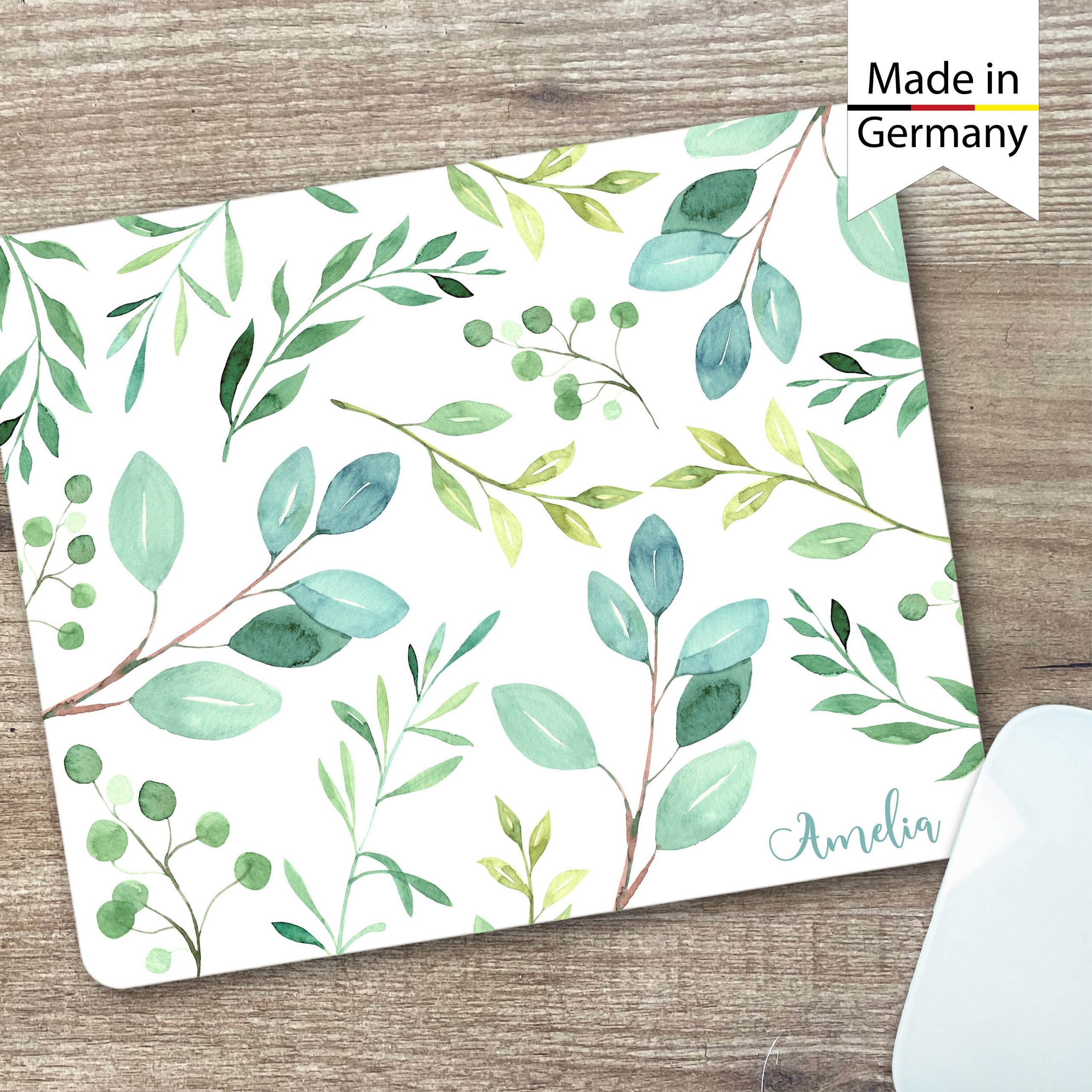 Mauspad Mousepad grüne Blätter floral personalisiert mit Wunschnamen Büro, Geschenk Geburtstag